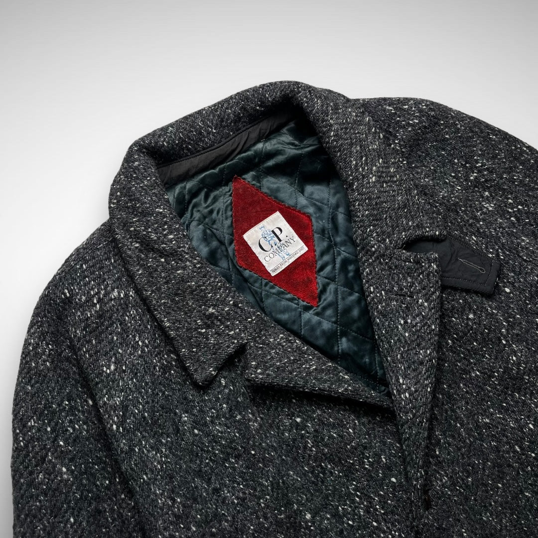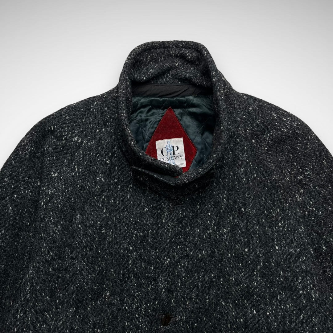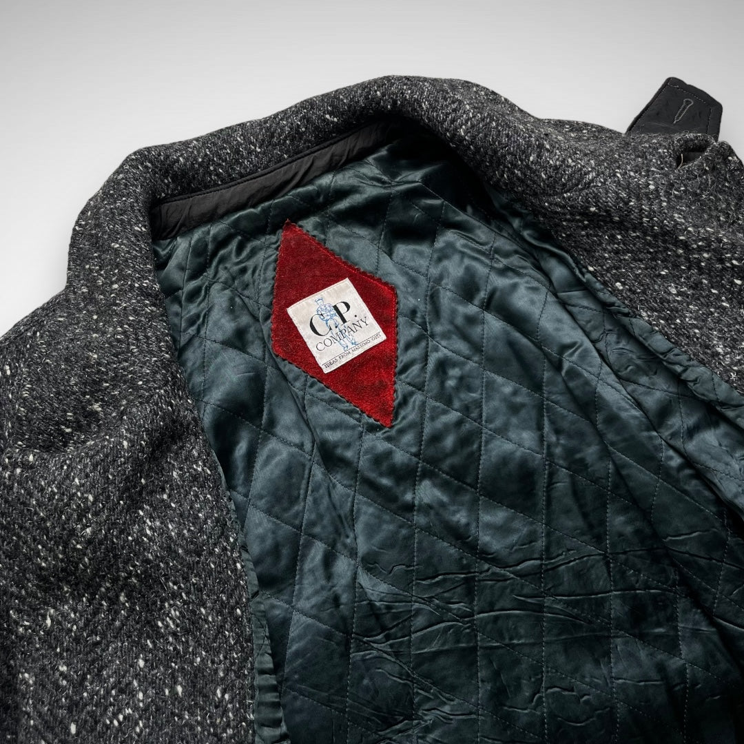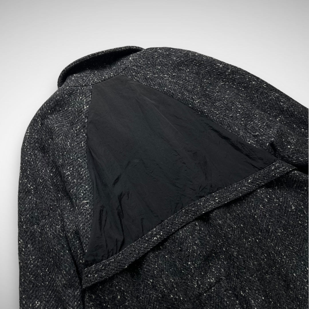 Heavy wool coat in a textured blend, flap cover pockets, button-up closure including collar, adjustable wrist with waterproof covers which are similar to the centre asymmetric back-panel, padded liner and brown leather details and rims throughout.