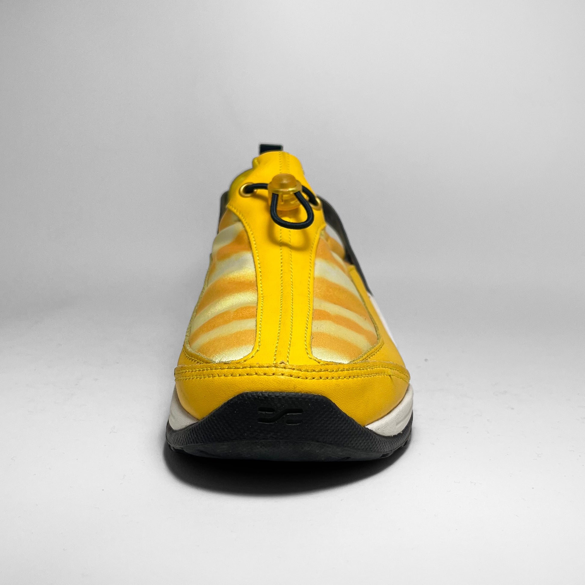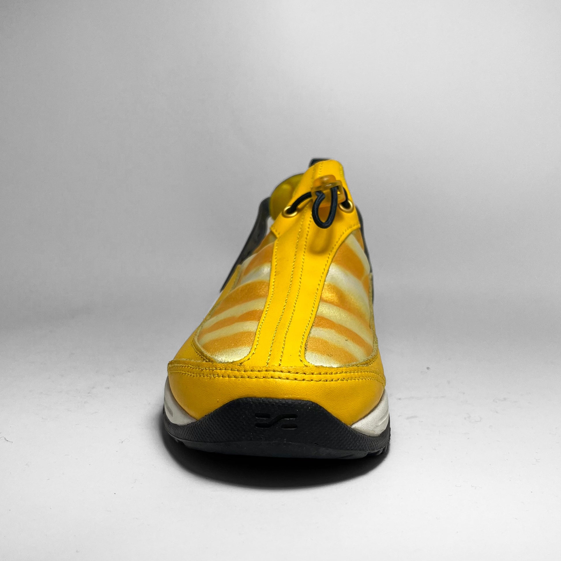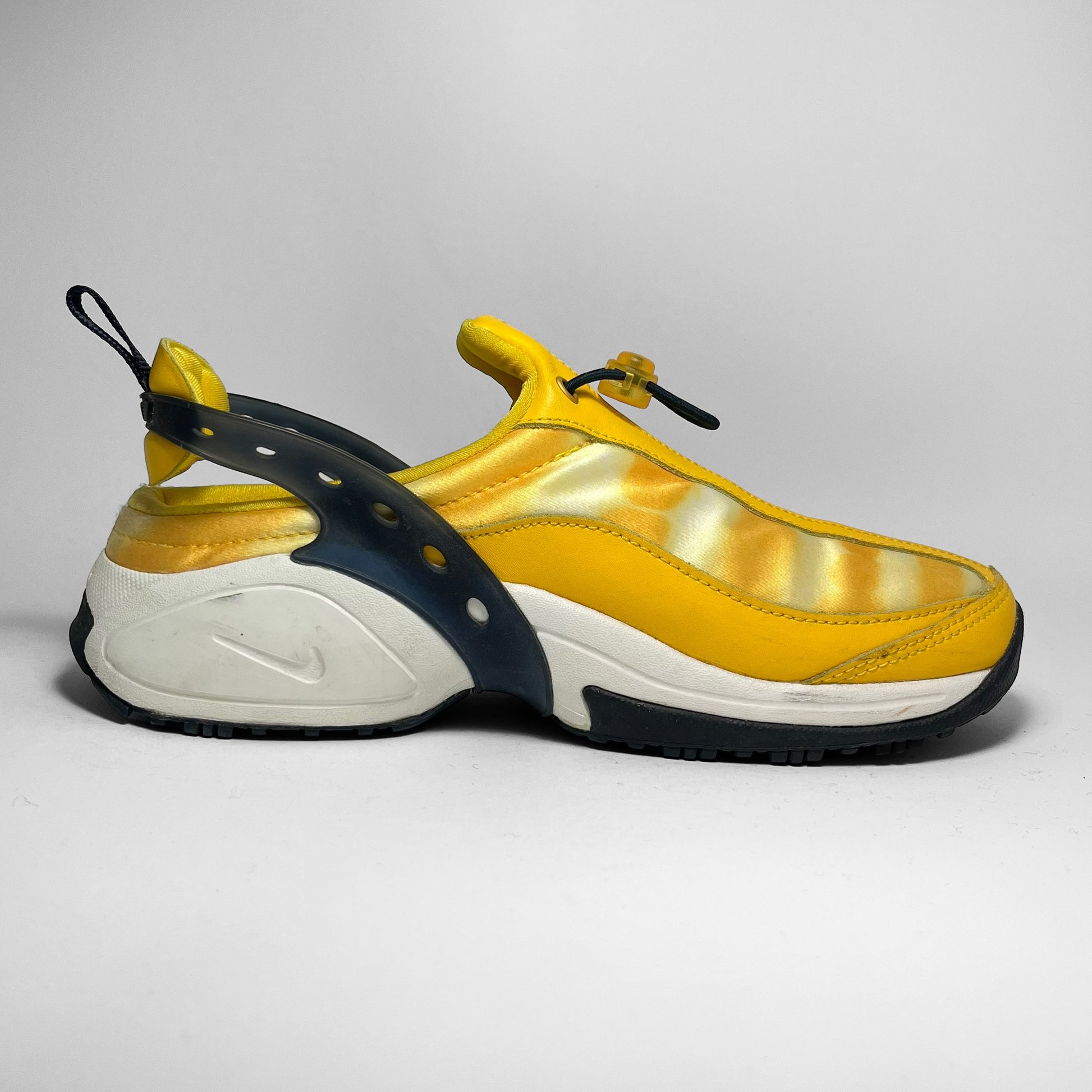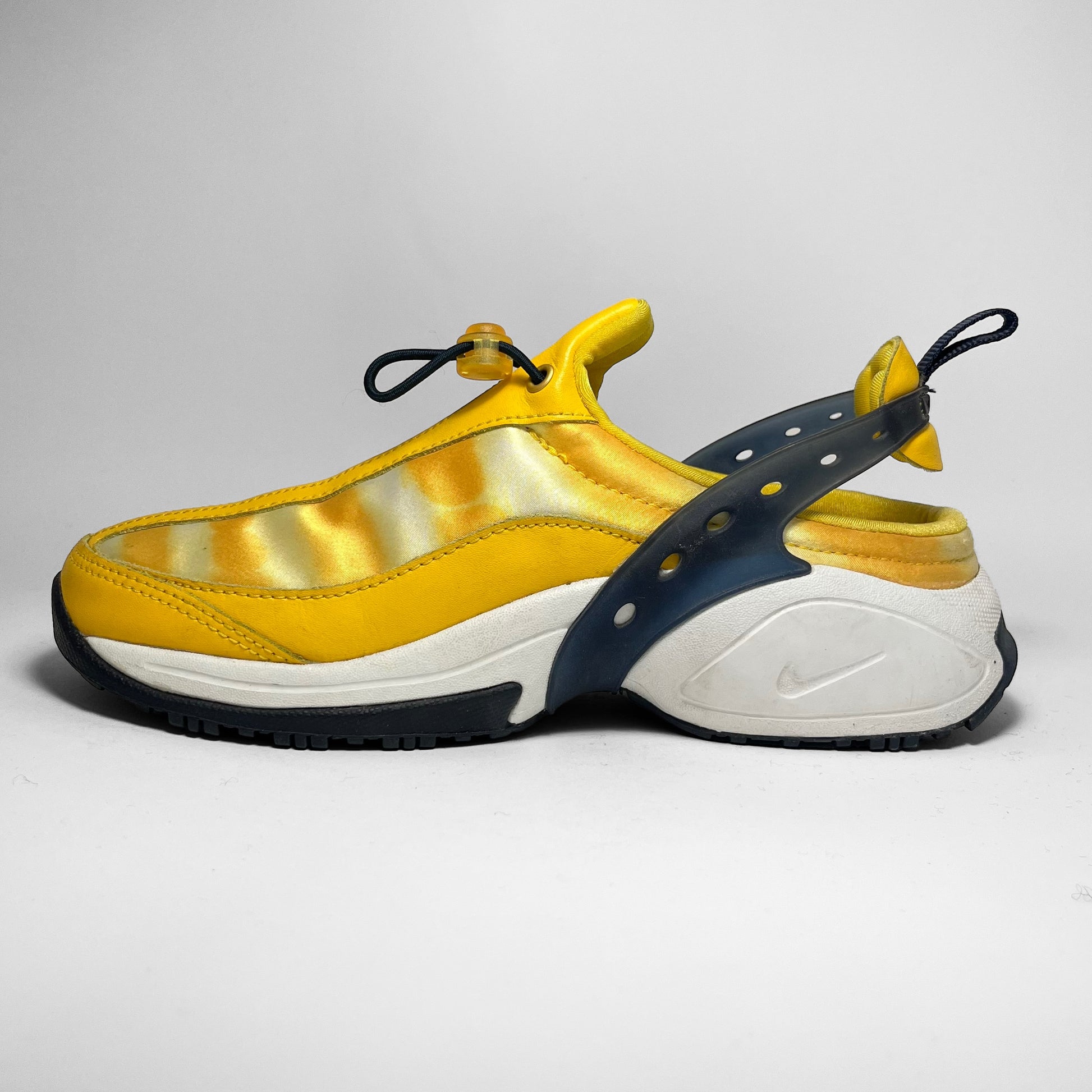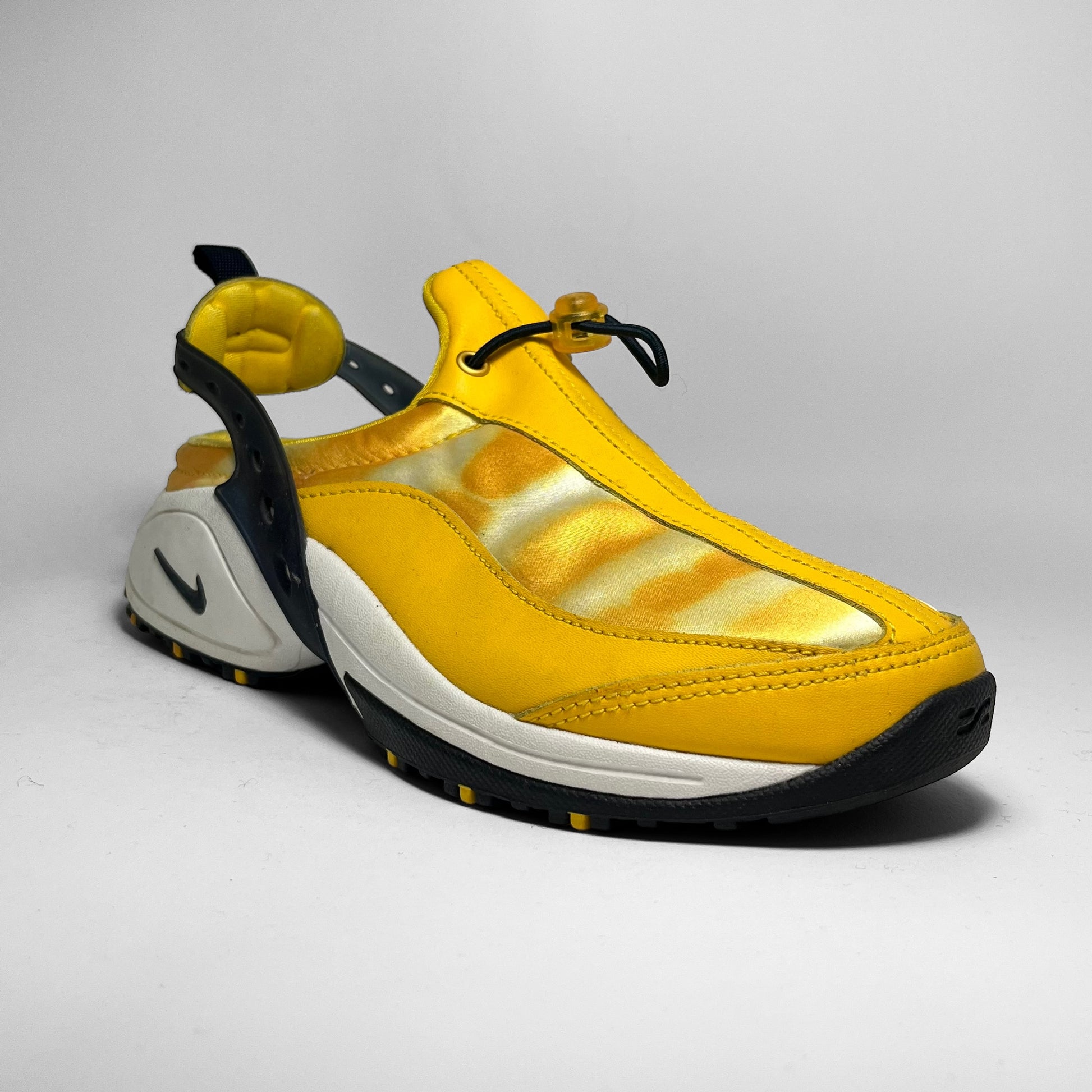 Yellow leather panels combined with iridescent parts on the upper, elastic toggle to adjust the fit, heel-lock cushion, white midsole with swoosh branding and black and yellow outsole.