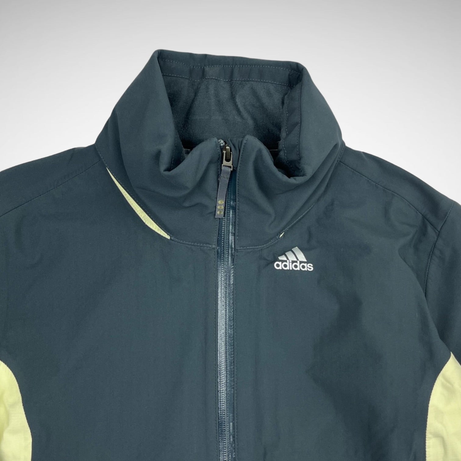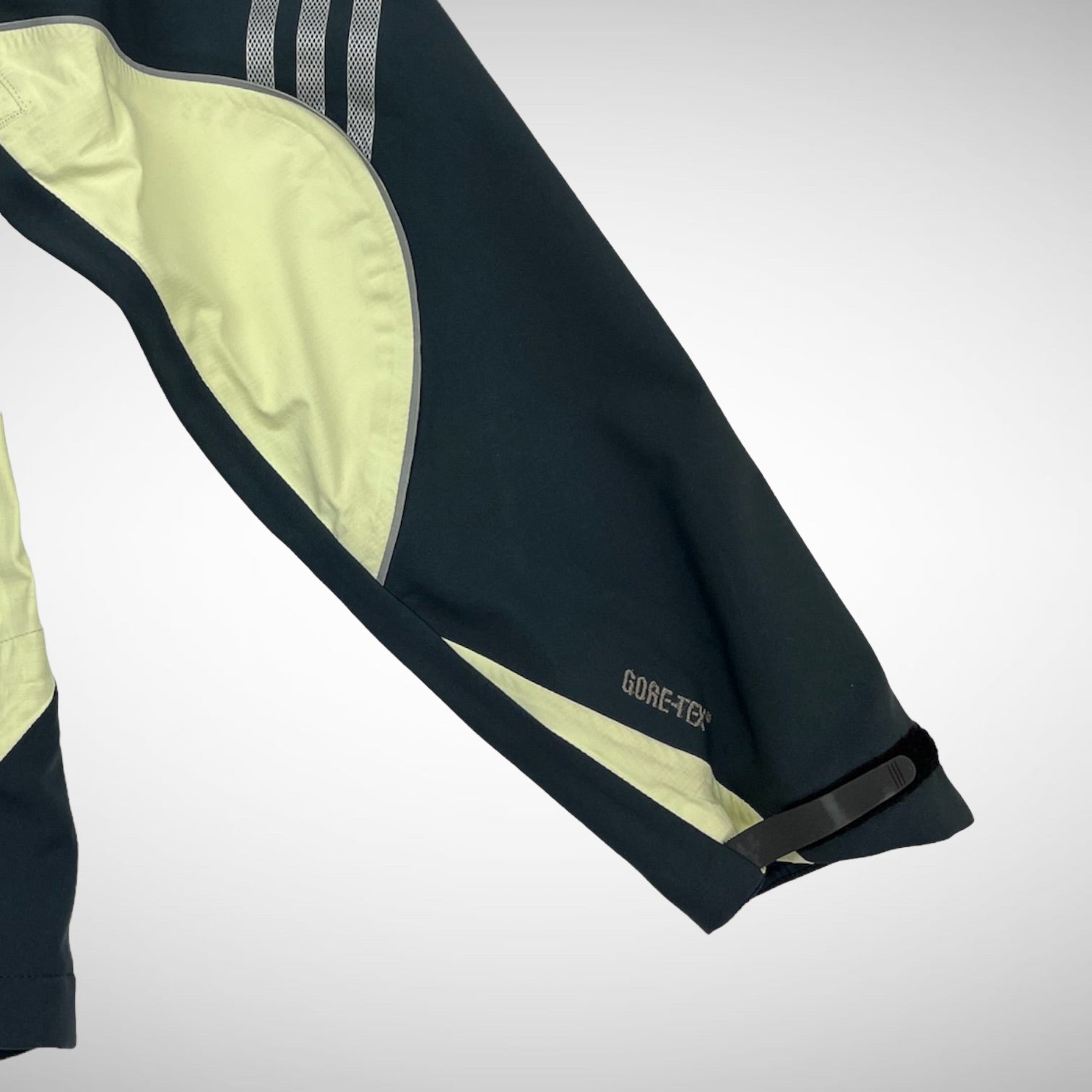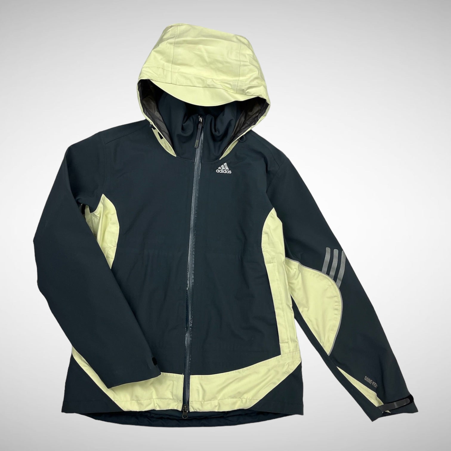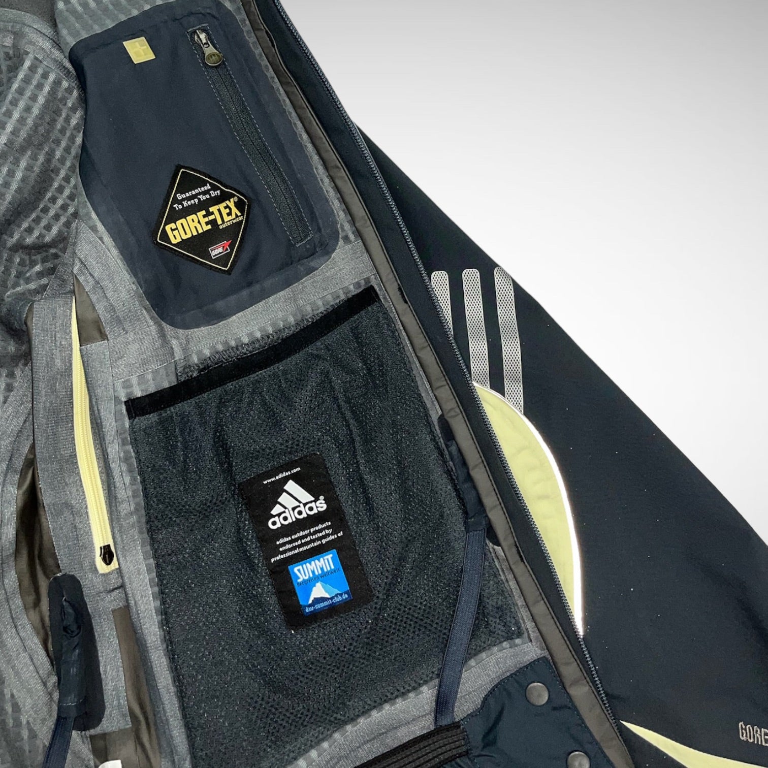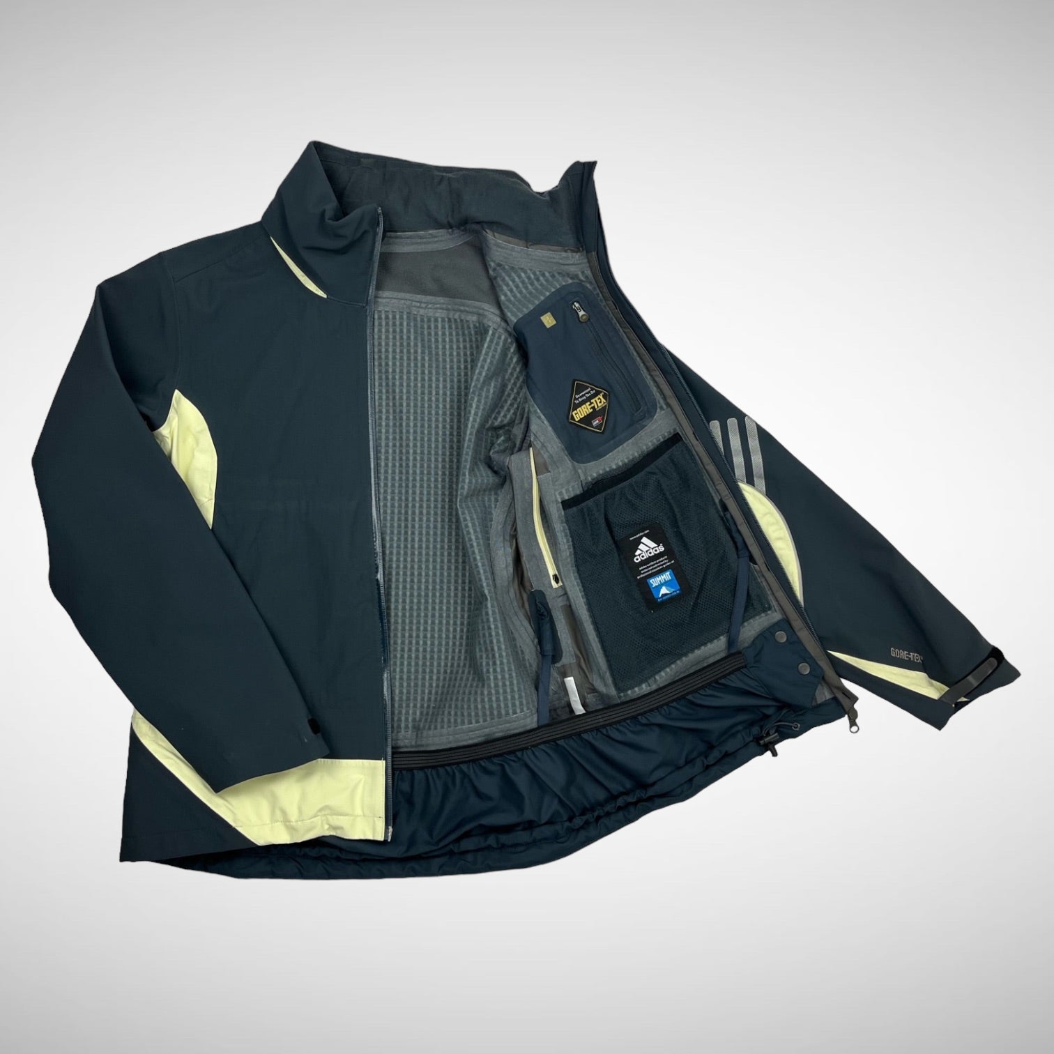 Summit sample jacket from early 2000s with dark grey/navy and yellow toned panels, comes with packable hood, GORE-TEX membrane and Clima-proof technology including fleece lining, 3M reflective details, adjustable cuffs, hem and hood.