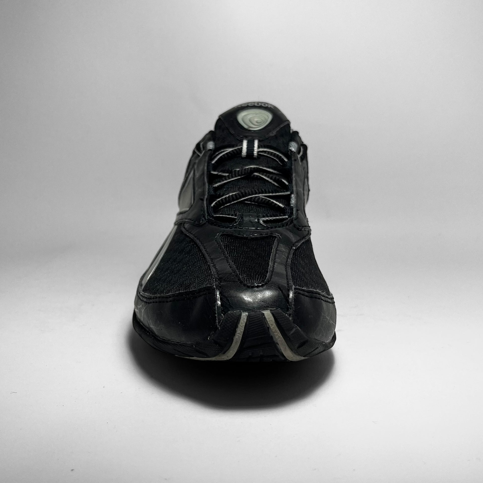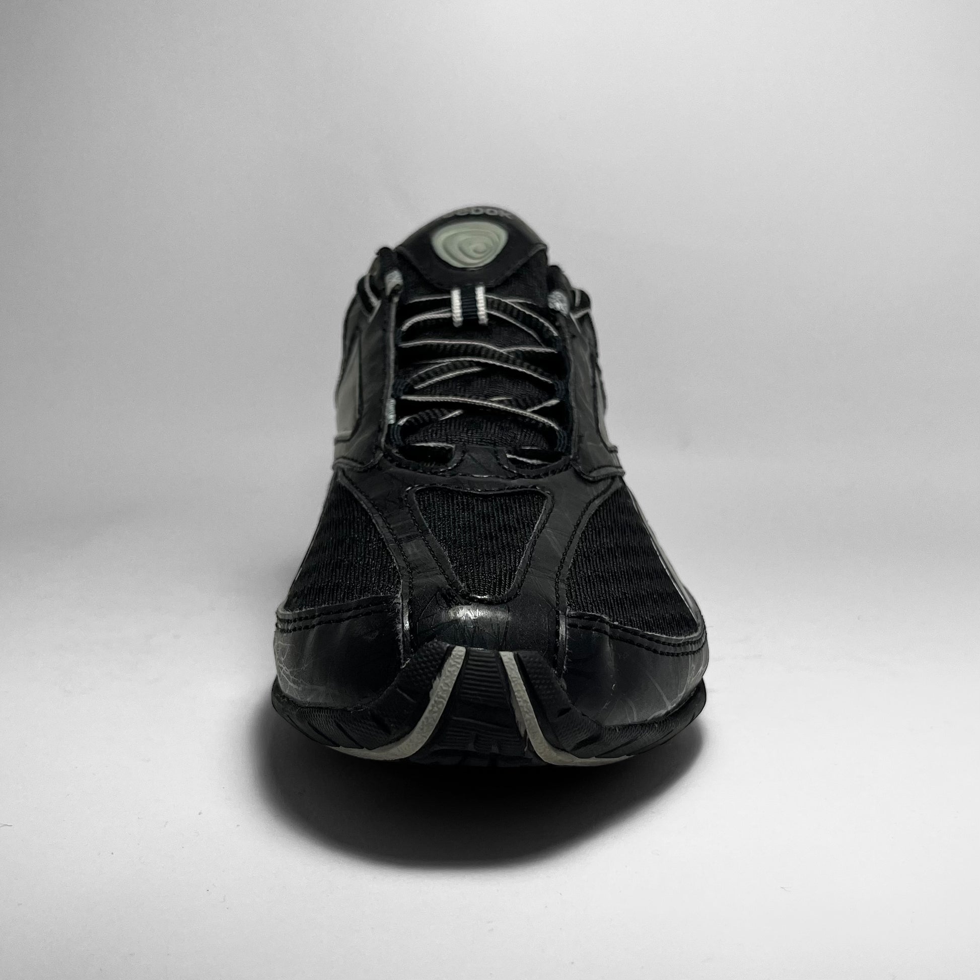 Black mesh padded body with leather panels throughout incorporating minimal details, patent leather striking logo with silver outlines, script branding and rubber logo on tongue matching the outsole structure which stands out and has a unique ‘air moving inside’ technique.