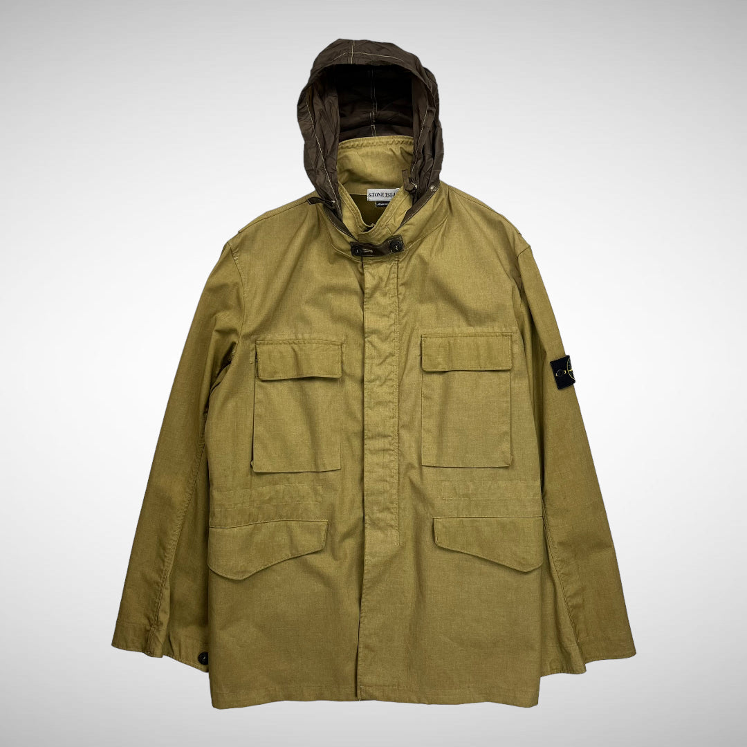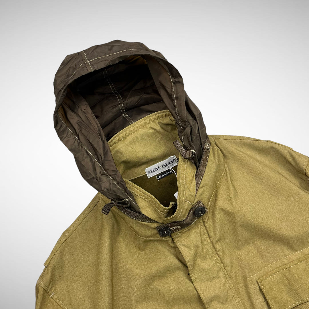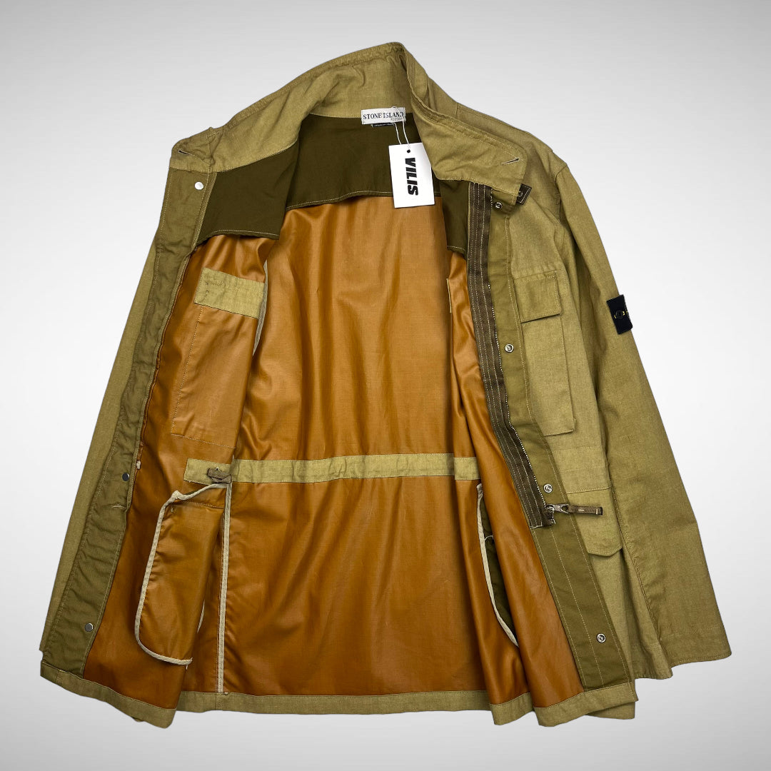 Wool resin treatment in a mosterd colour with orange lining, brown nylon foldable hood, adjustable collar with belt, full zip and press-button closure, adjustable cuffs, four front flap-compartments and removable compass badge on upper arm.