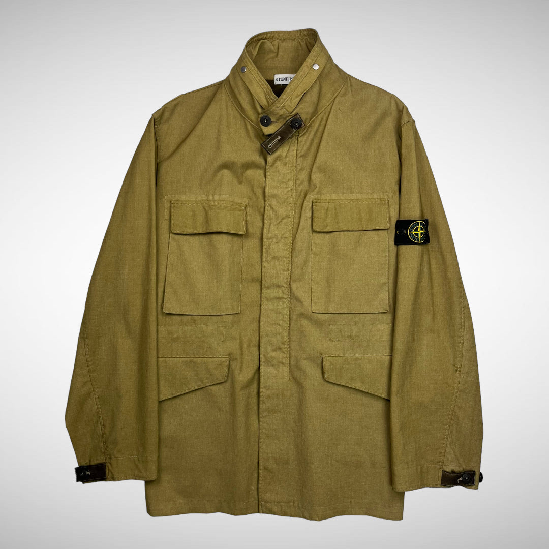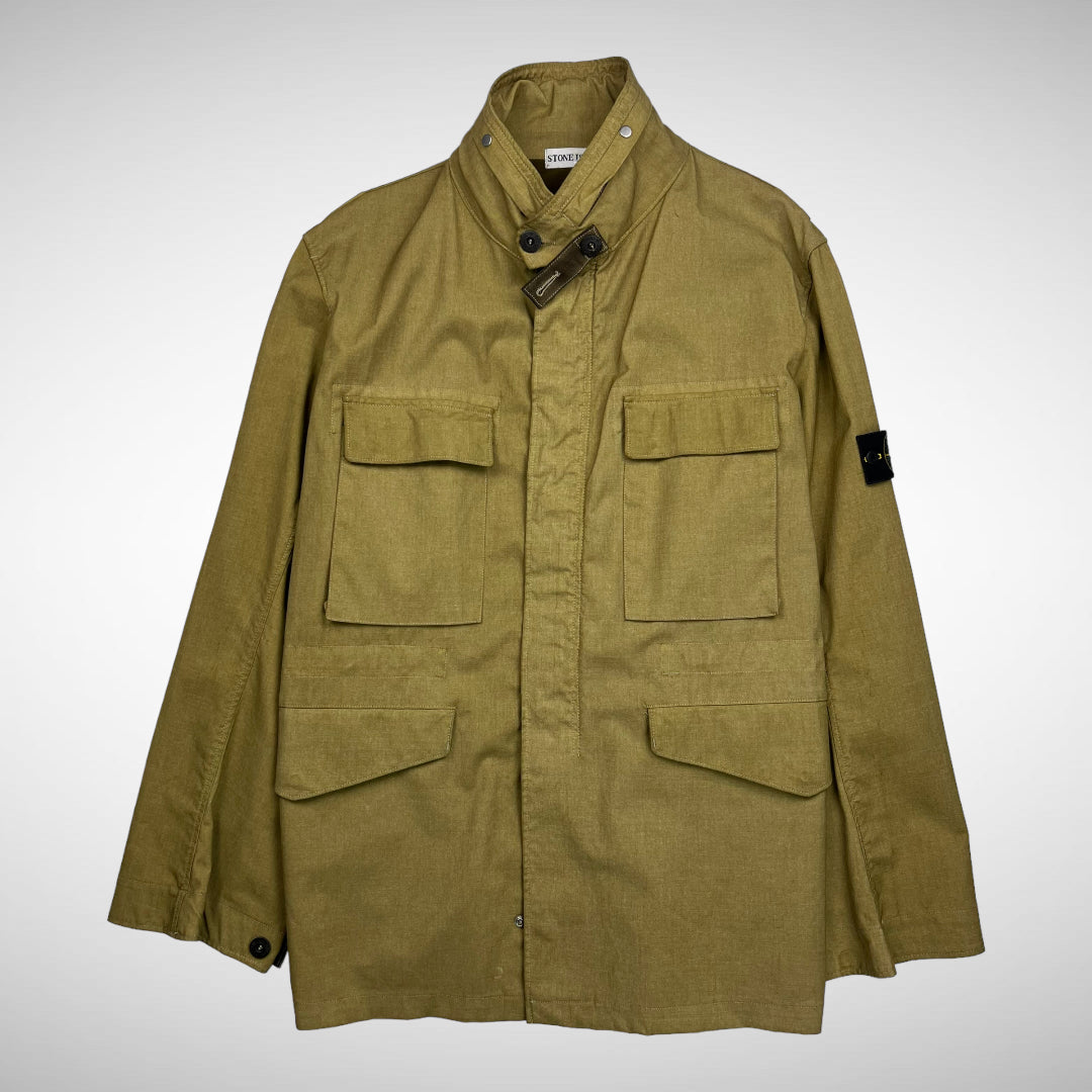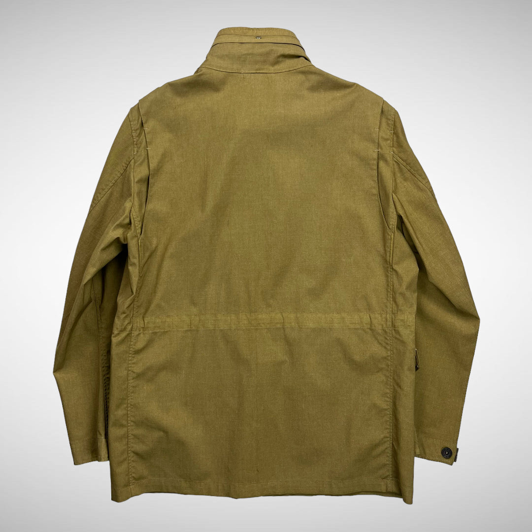 Wool resin treatment in a mosterd colour with orange lining, brown nylon foldable hood, adjustable collar with belt, full zip and press-button closure, adjustable cuffs, four front flap-compartments and removable compass badge on upper arm.