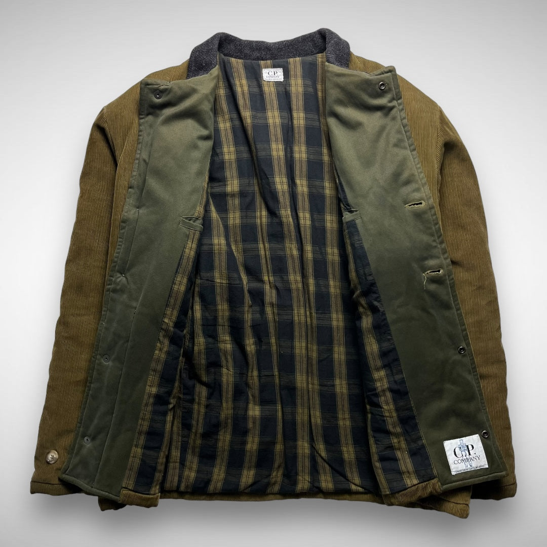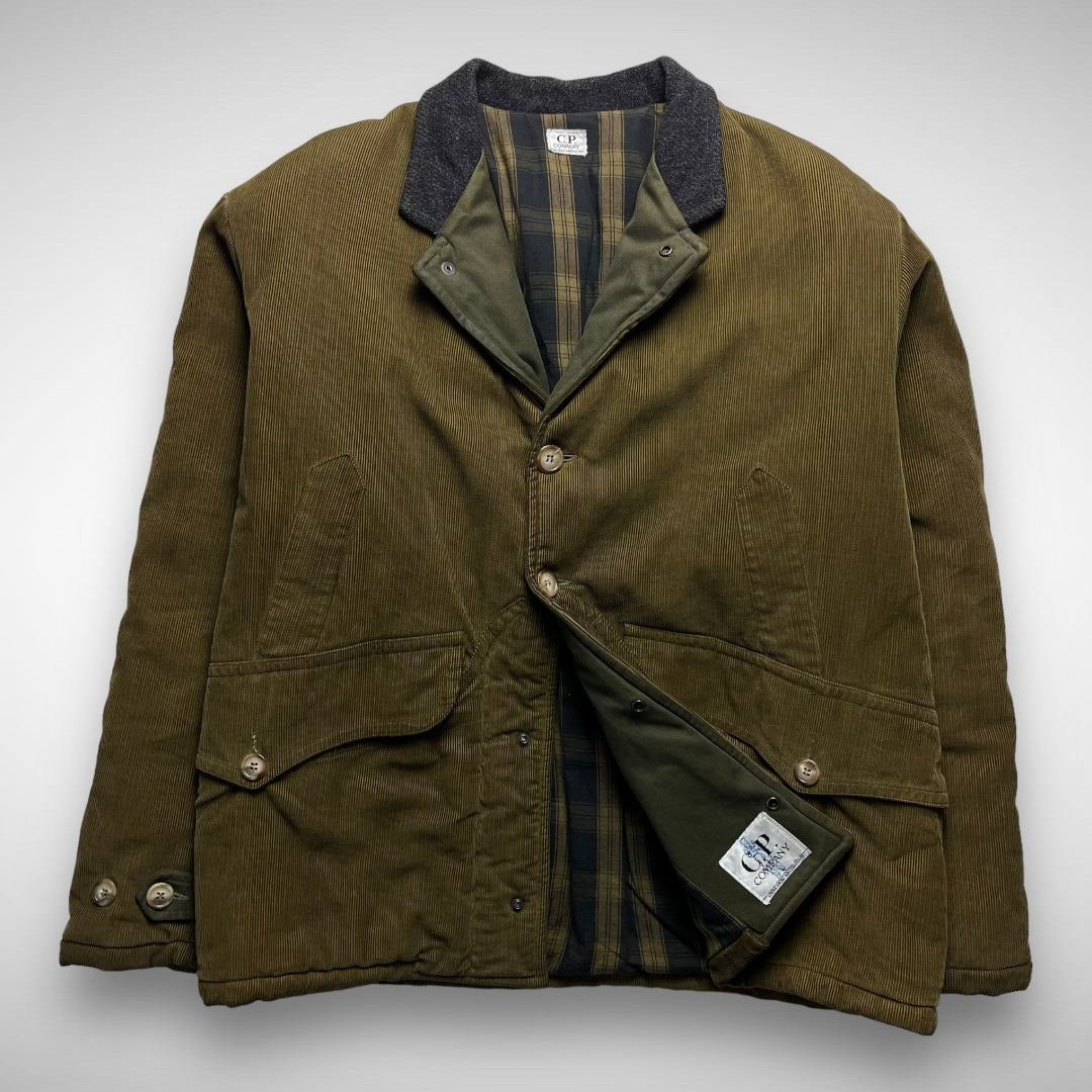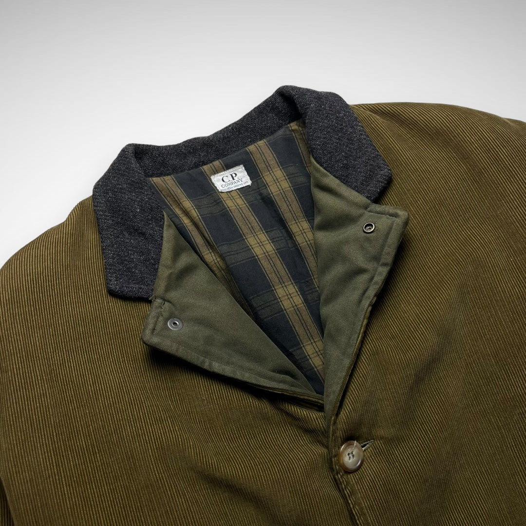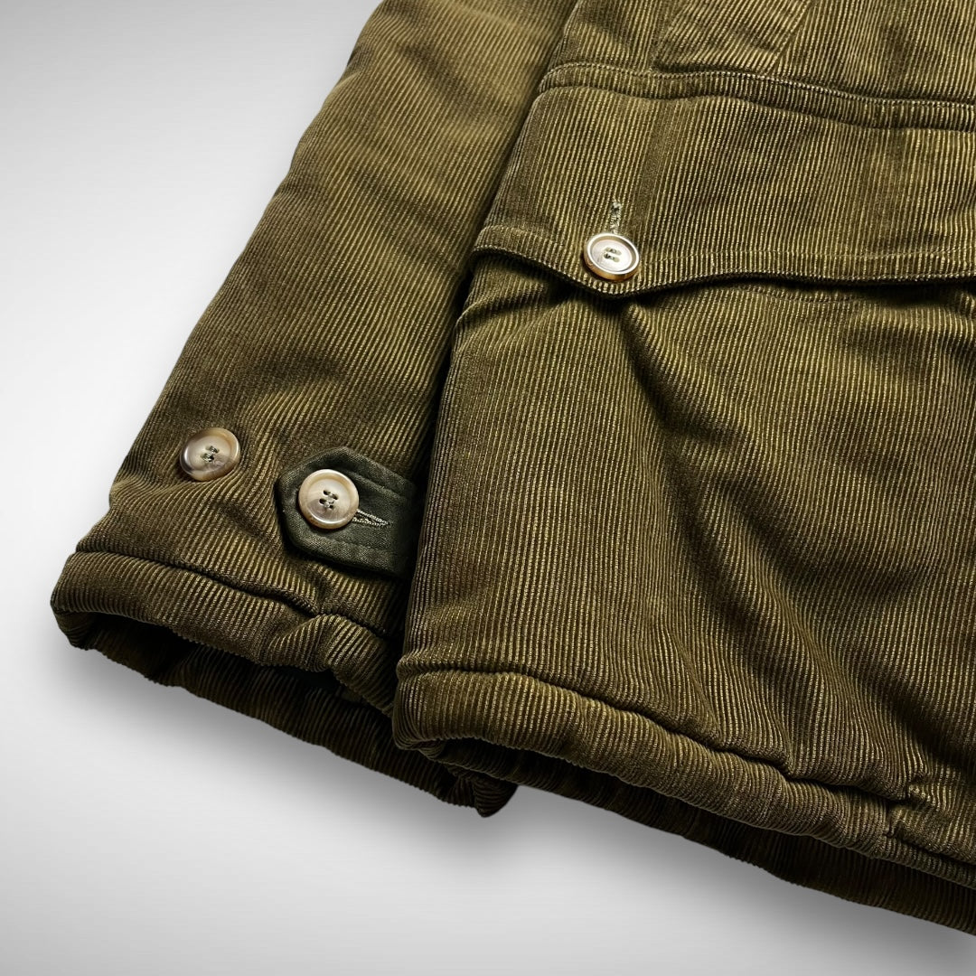Khaki corduroy jacket in hunting style with shimmer effect featuring double button-up closure and additional press-buttons at lower body and collar, checkered pattern lining and wool panels for warmth including collar, double flap button compartments and adjustable cuffs, double stash pockets on the inside and slightly padded shoulders.