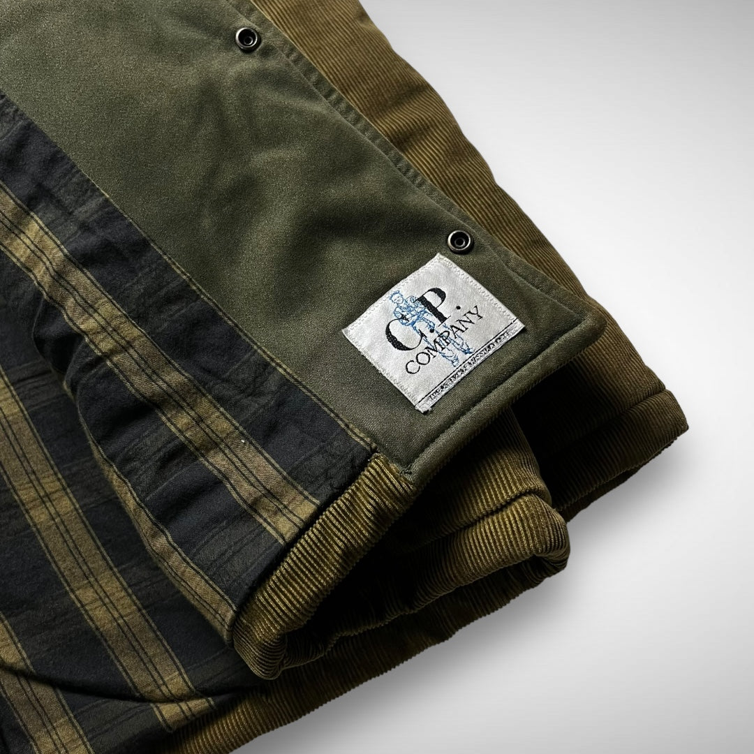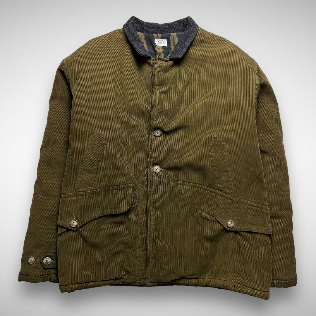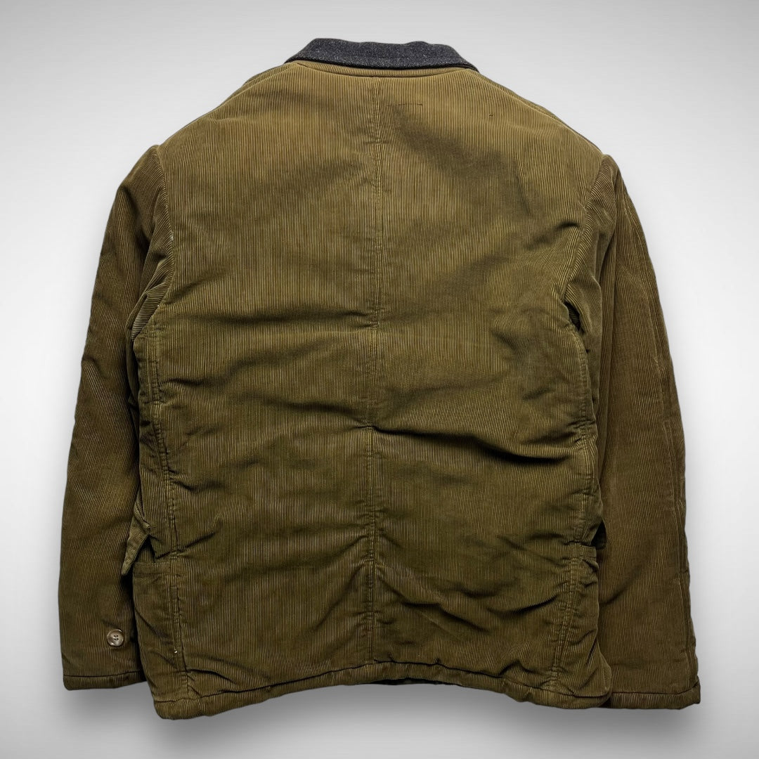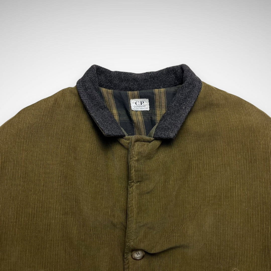 Khaki corduroy jacket in hunting style with shimmer effect featuring double button-up closure and additional press-buttons at lower body and collar, checkered pattern lining and wool panels for warmth including collar, double flap button compartments and adjustable cuffs, double stash pockets on the inside and slightly padded shoulders.