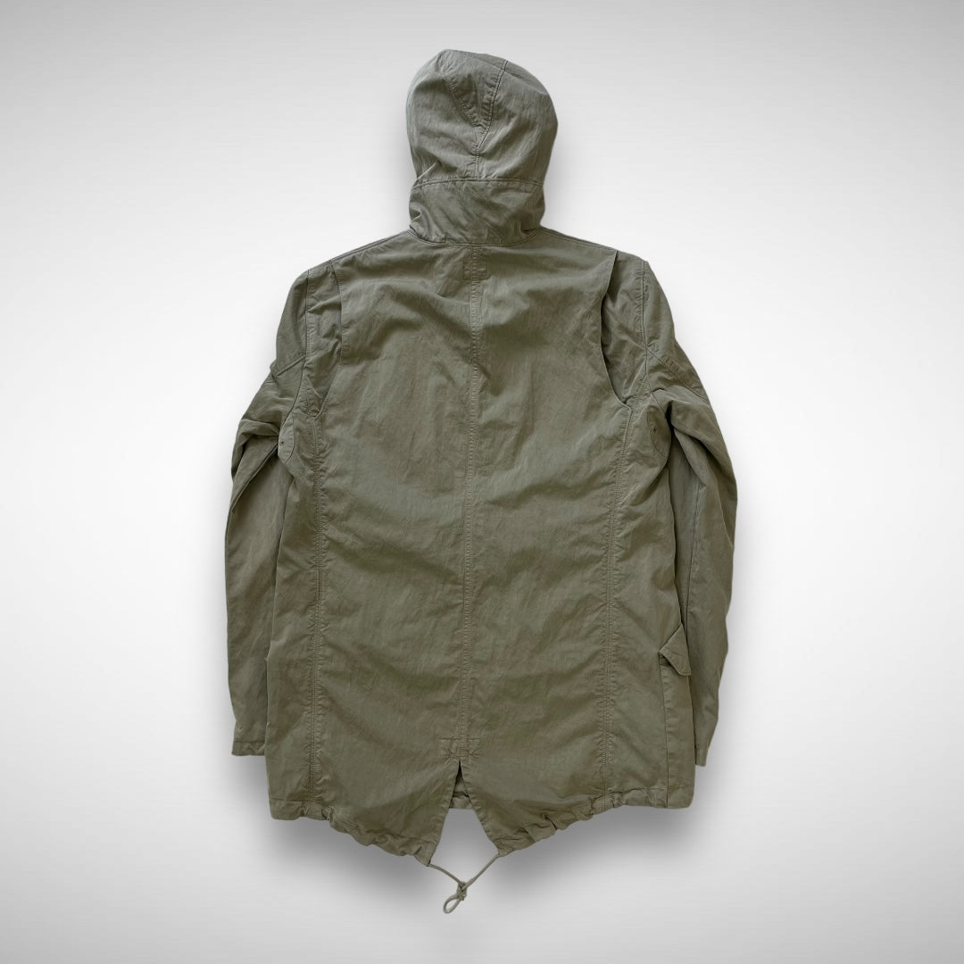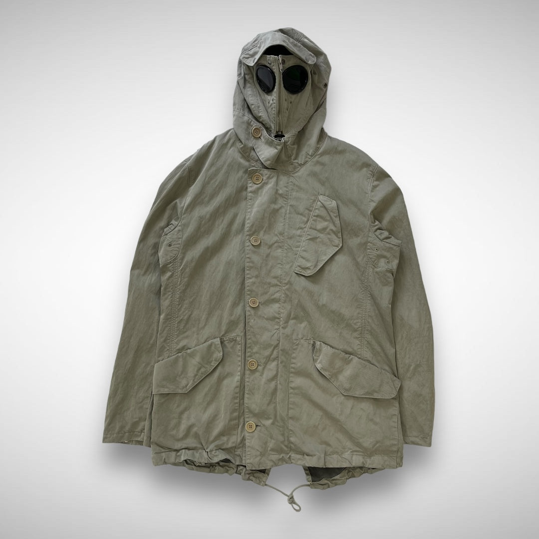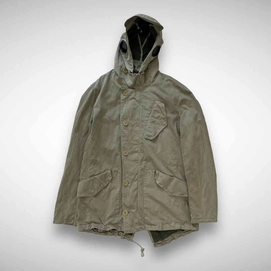Mixture of nylon and cotton with zip-goggled hood and cap, perforations for breathability, zipped and buttoned fastening, triple front flap compartments and additional flap to cover neck at front, fishtail style with cords to adjust fit.