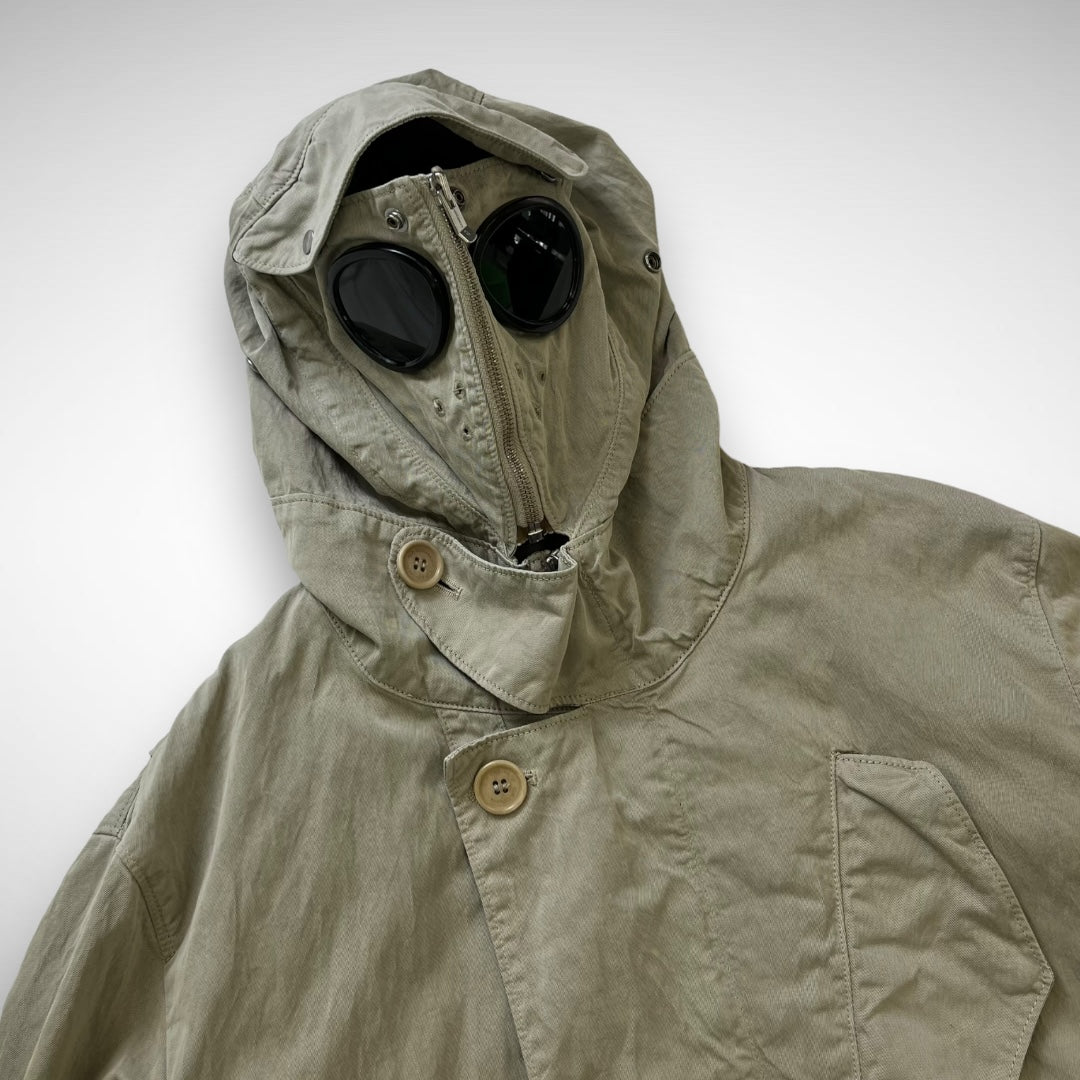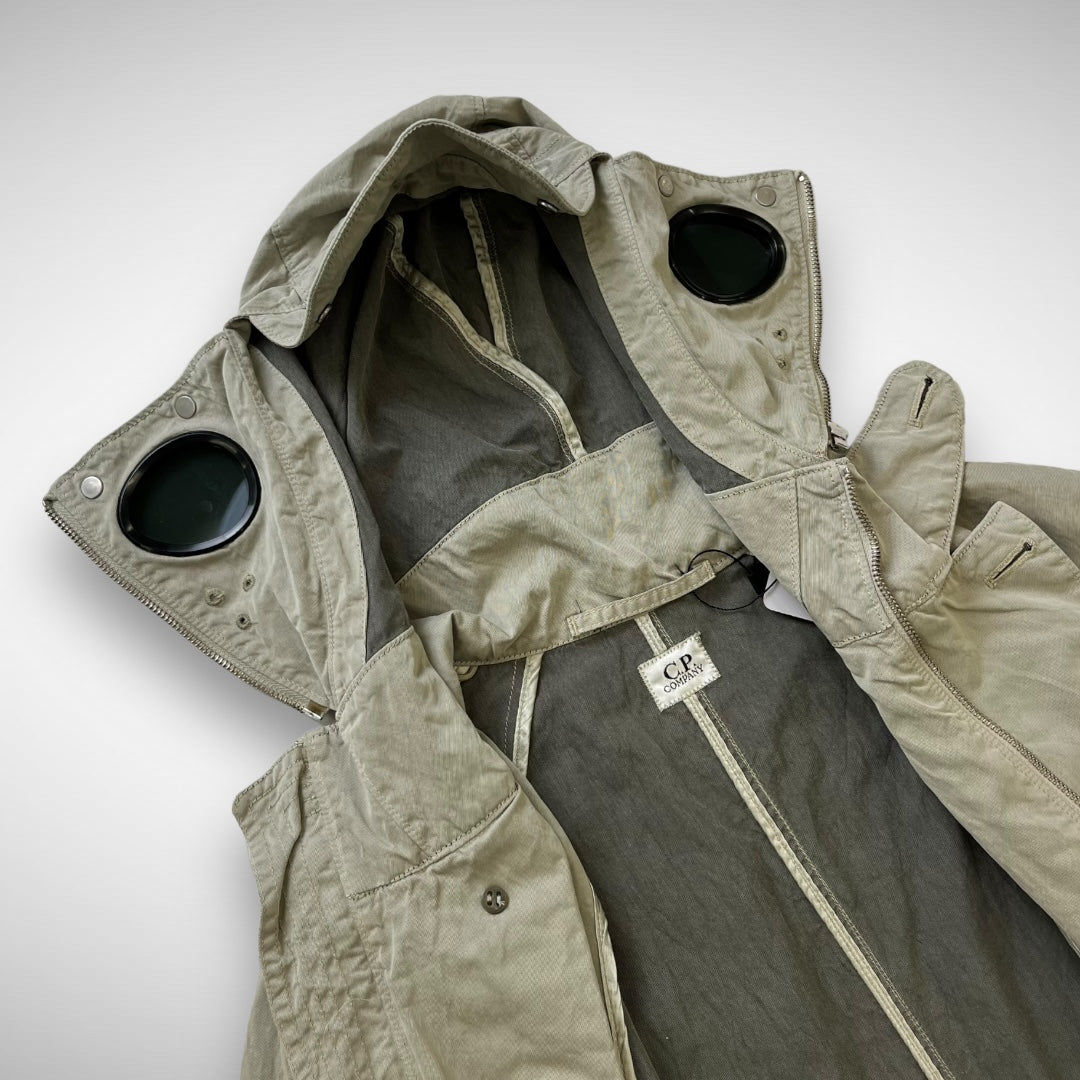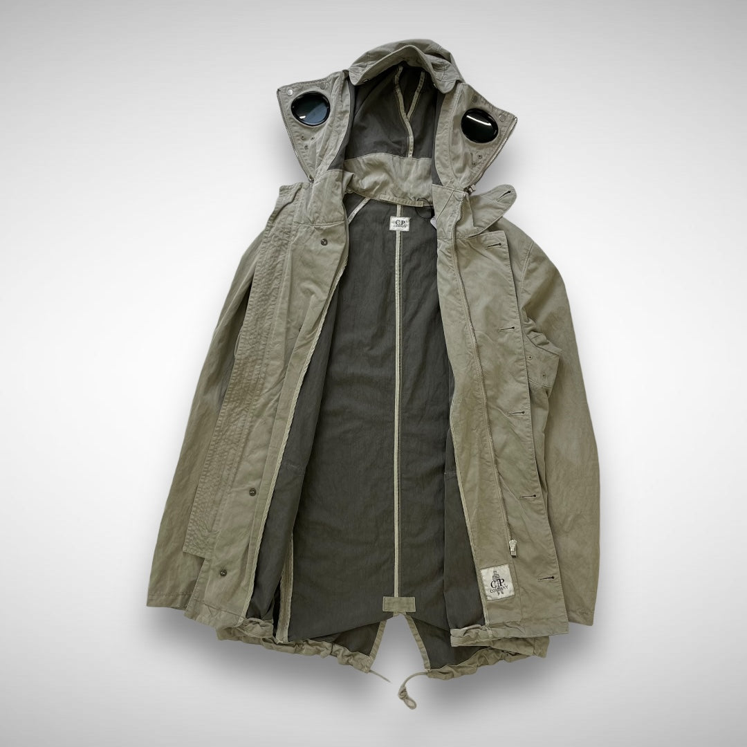 Mixture of nylon and cotton with zip-goggled hood and cap, perforations for breathability, zipped and buttoned fastening, triple front flap compartments and additional flap to cover neck at front, fishtail style with cords to adjust fit.