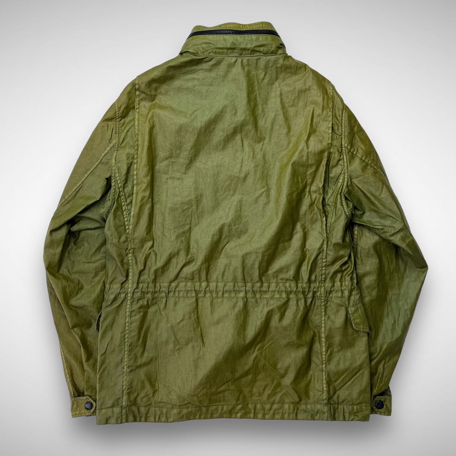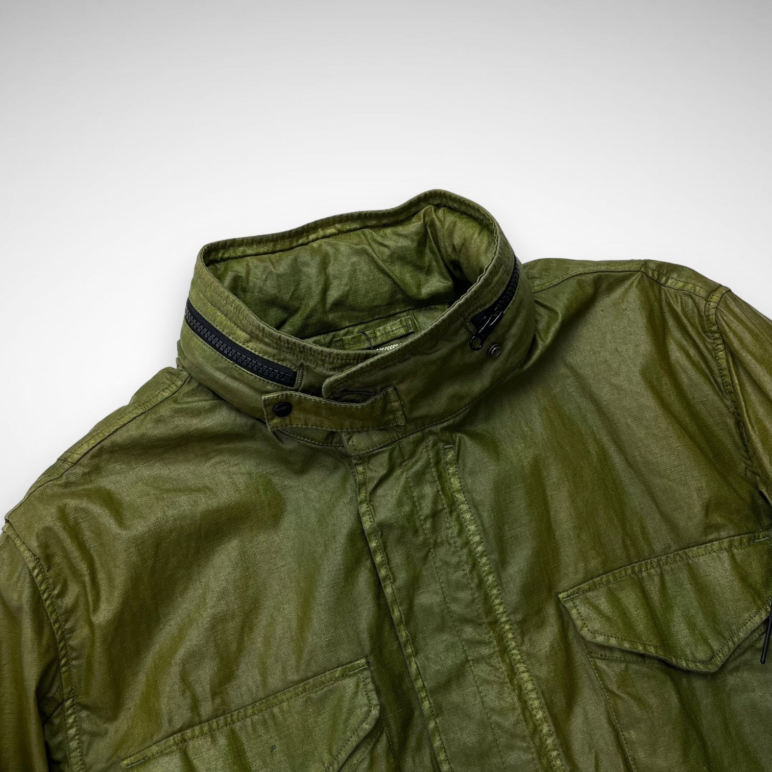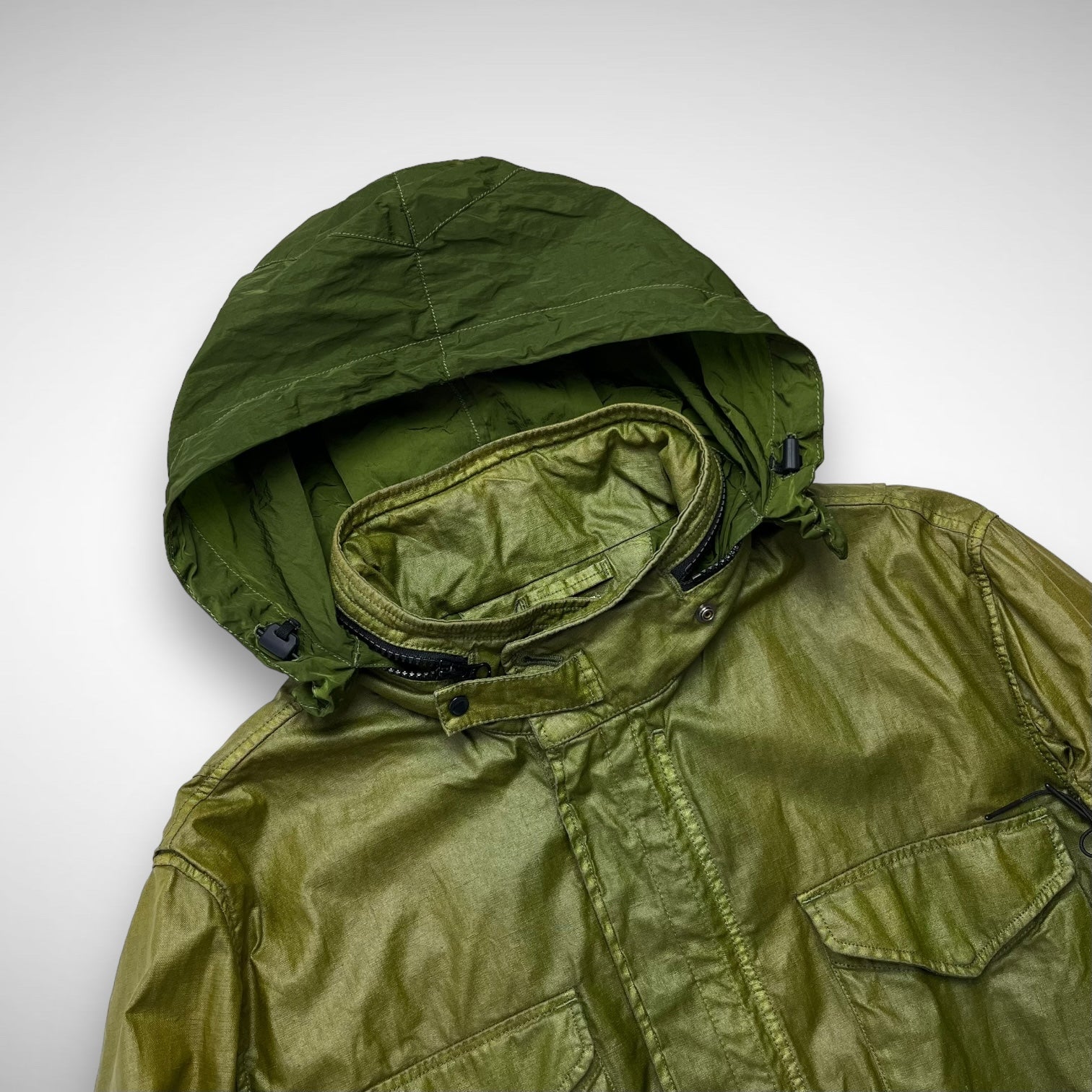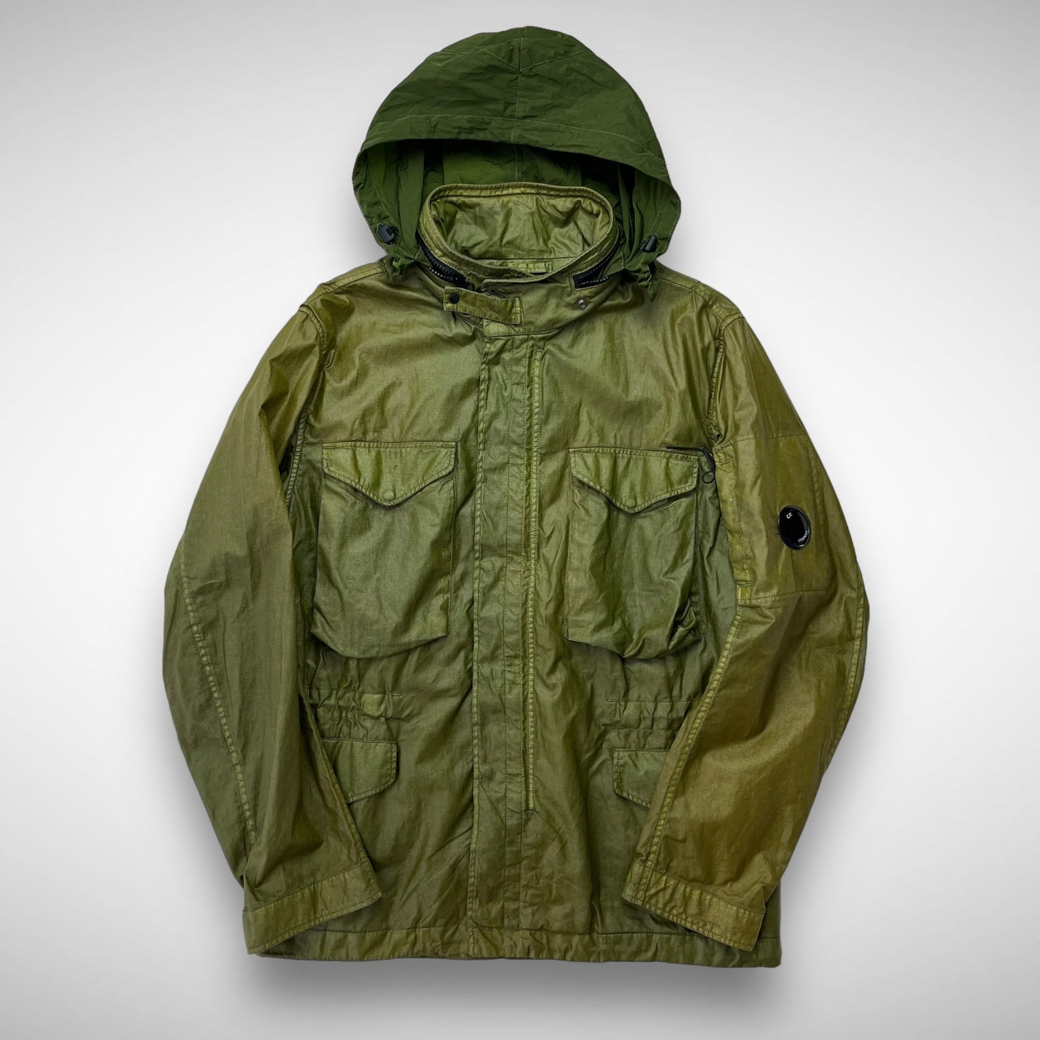 Green garment dyed shimmer lino wax finish in M65-style, four front press-button flap pockets, upper arm zip-compartment with branded lens, rope-adjustable hem, nylon foldable hood and additional strap at collar.
