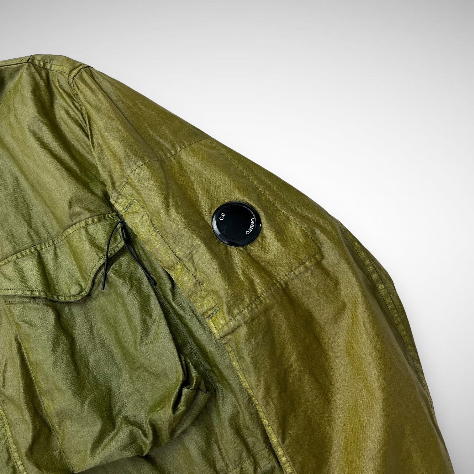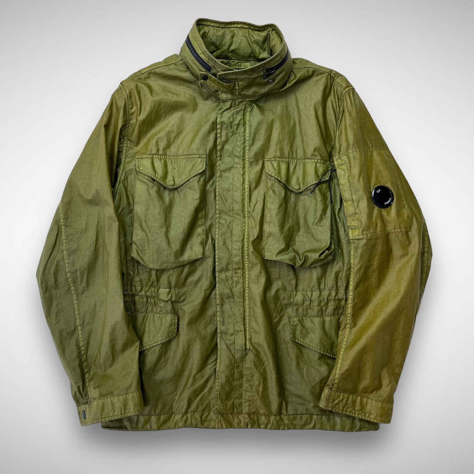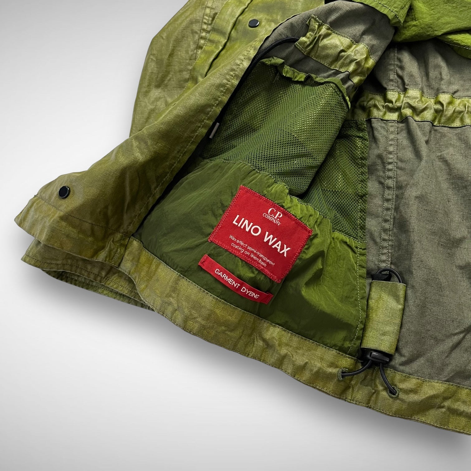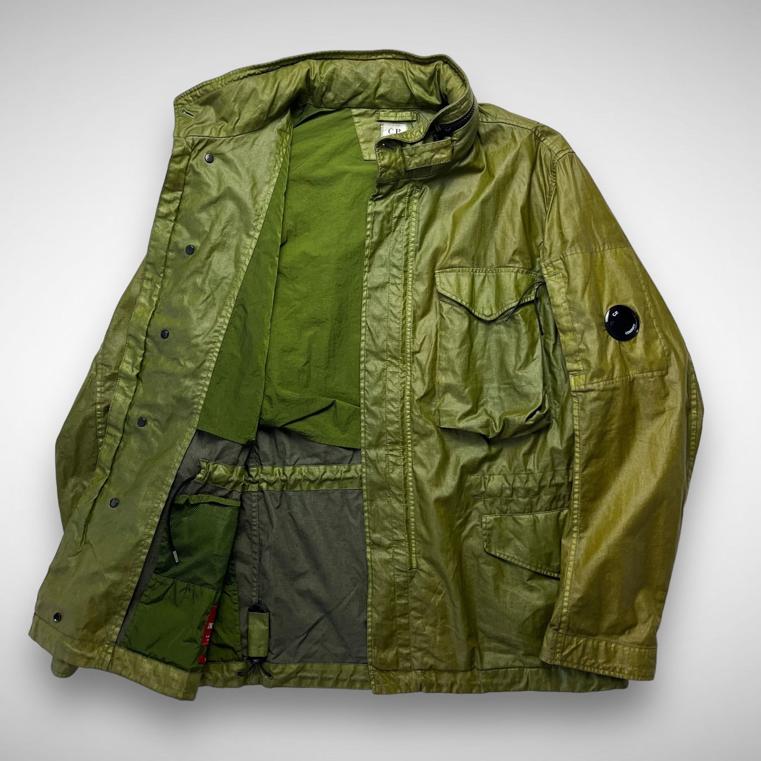 Green garment dyed shimmer lino wax finish in M65-style, four front press-button flap pockets, upper arm zip-compartment with branded lens, rope-adjustable hem, nylon foldable hood and additional strap at collar.
