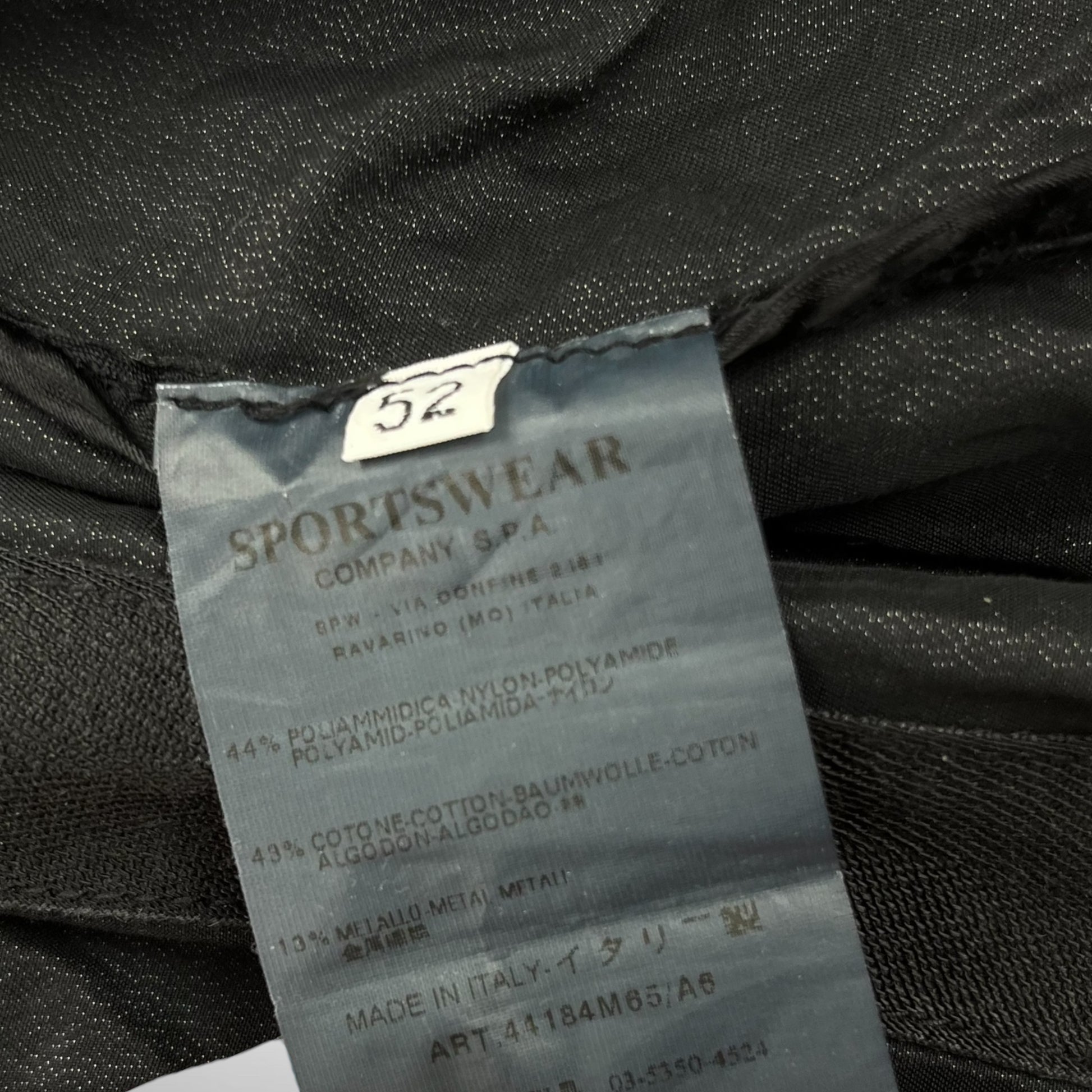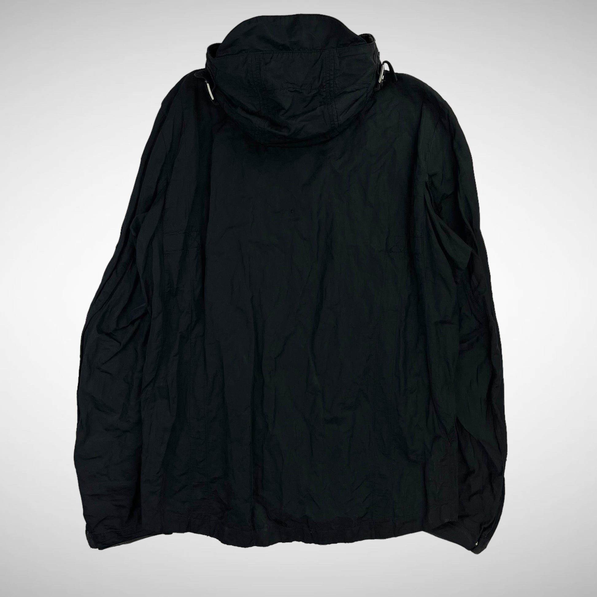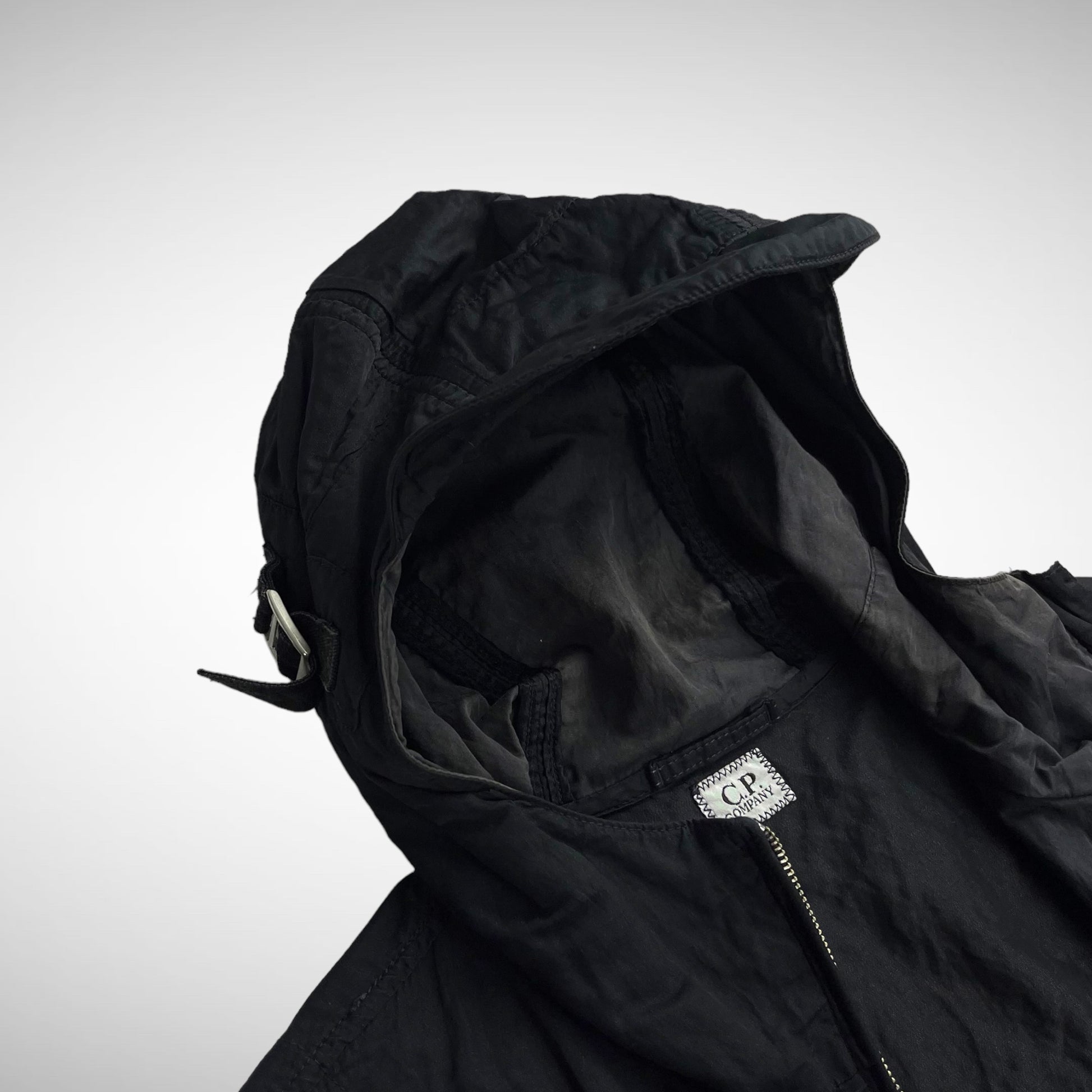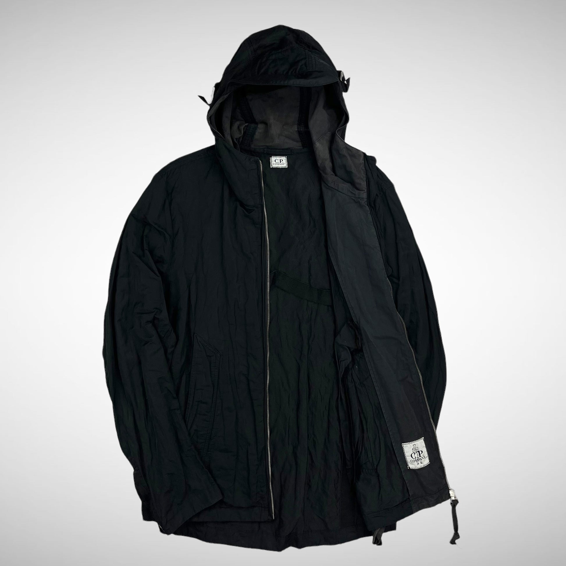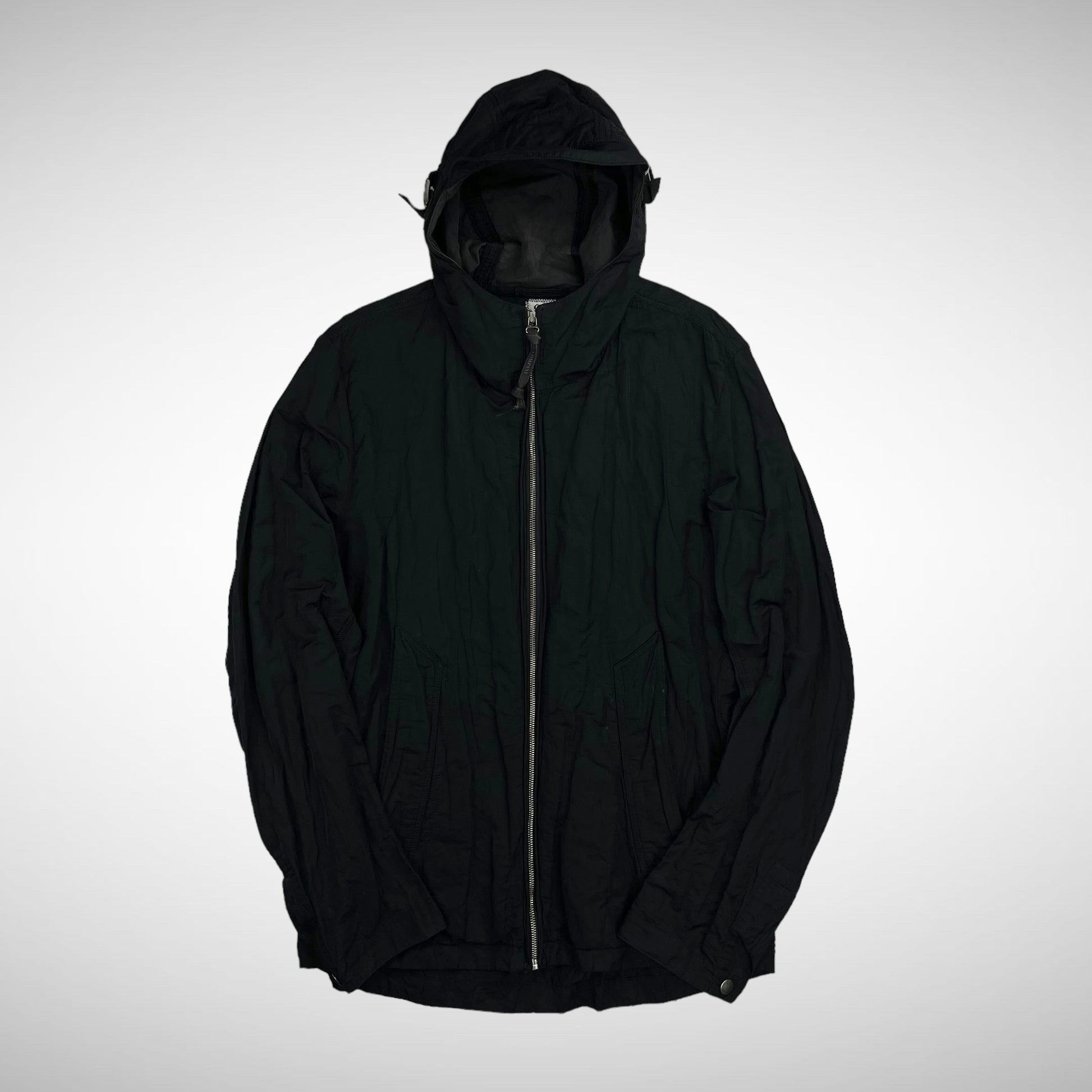 Metal infused hooded jacket with straps to adjust fit, two front pockets, button adjustable sleeves and straight cut.