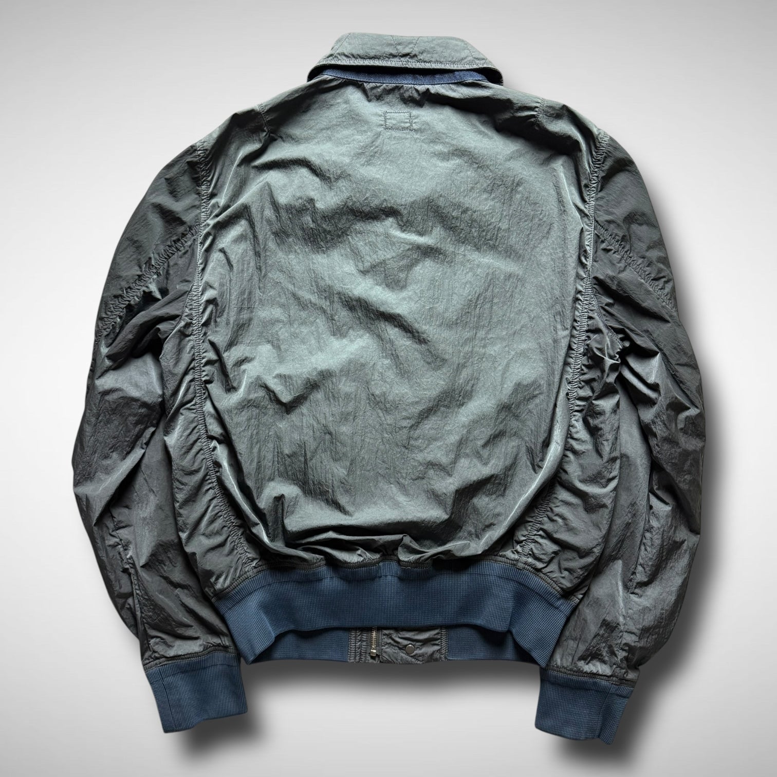 Crafted from lightweight, crinkled nylon with a subtle metallic sheen. It features a classic bomber silhouette with a fold-down collar and snap-fastening to adjust fit, ribbed cuffs and hem in navy, and a functional zip-and-snap front closure plus pockets.
