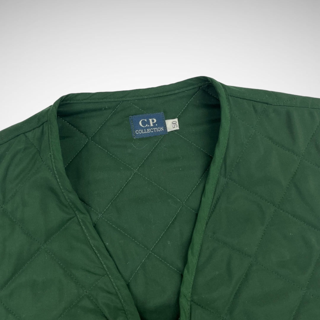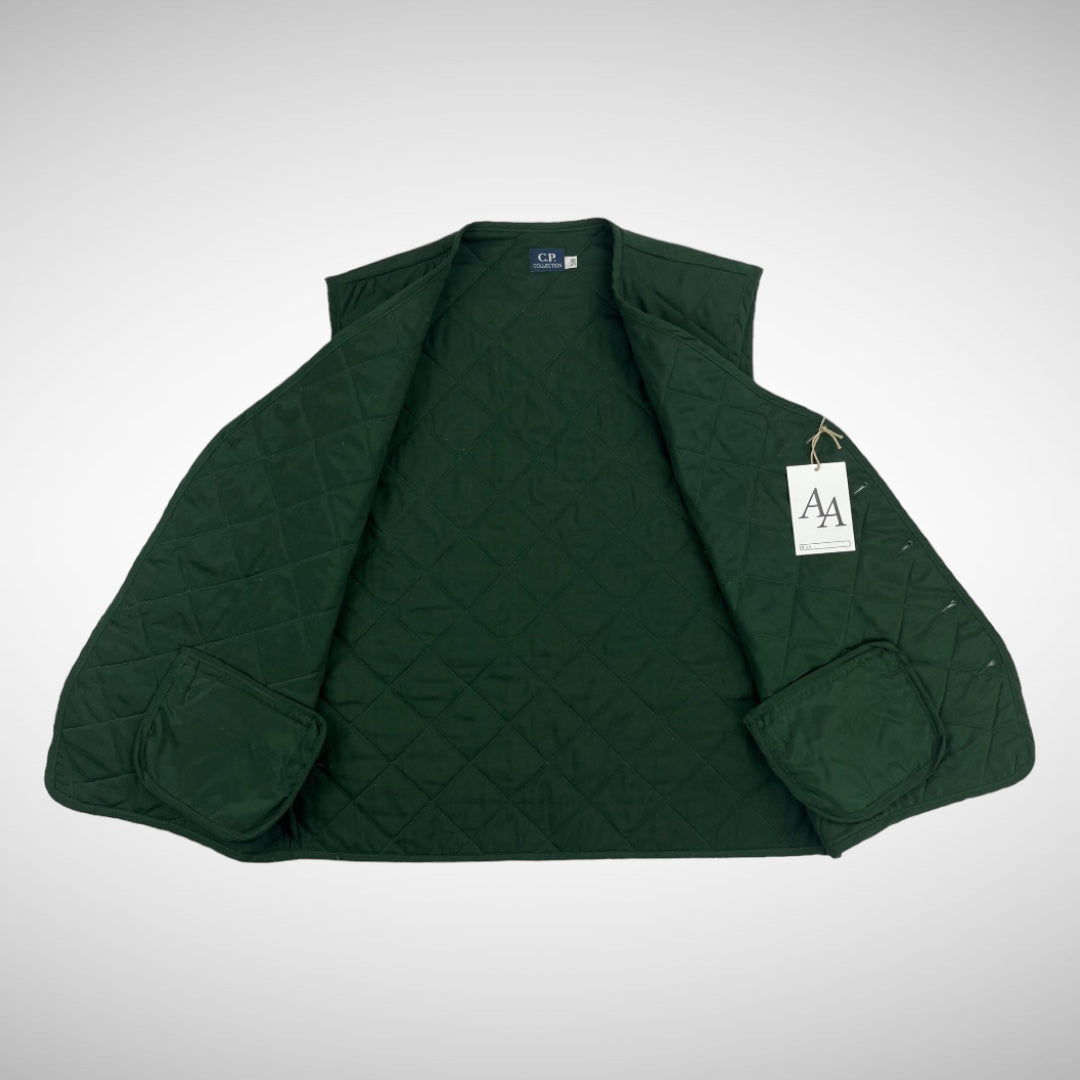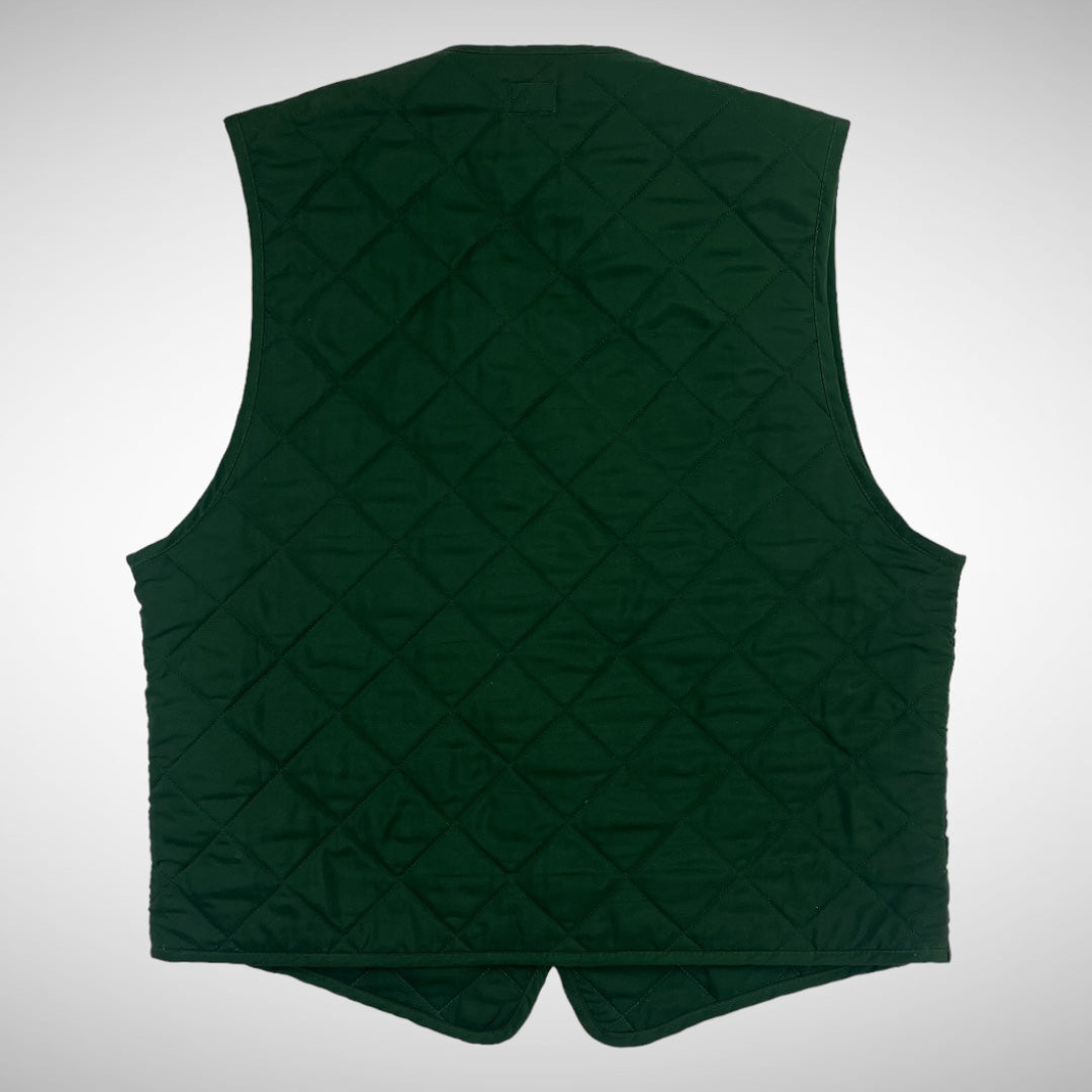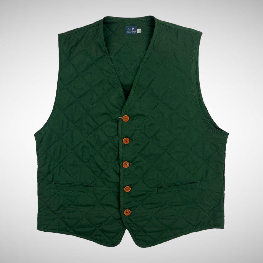 Beautiful quilted gilet in dark green with wooden buttons and double slide entry front pockets.