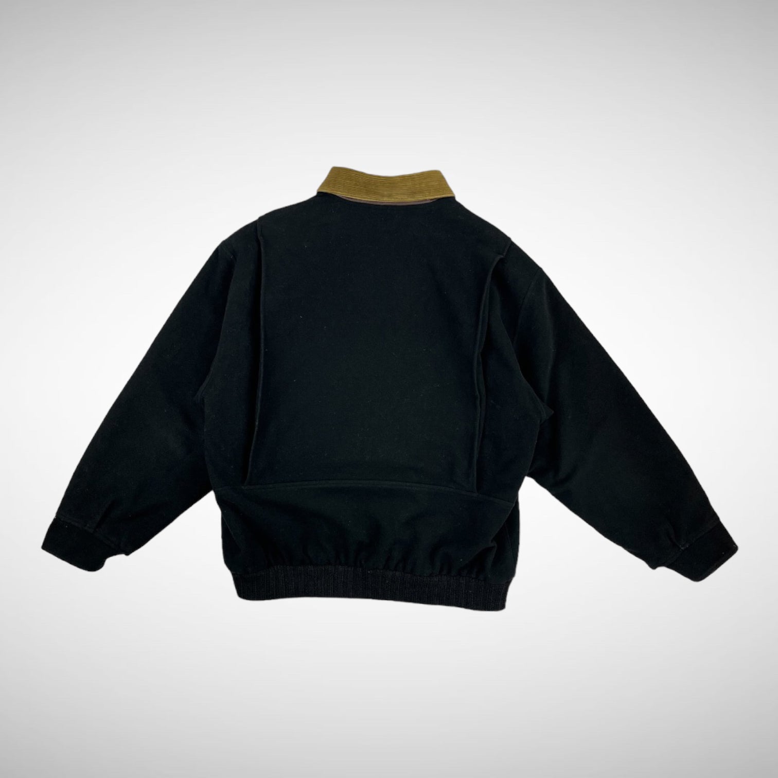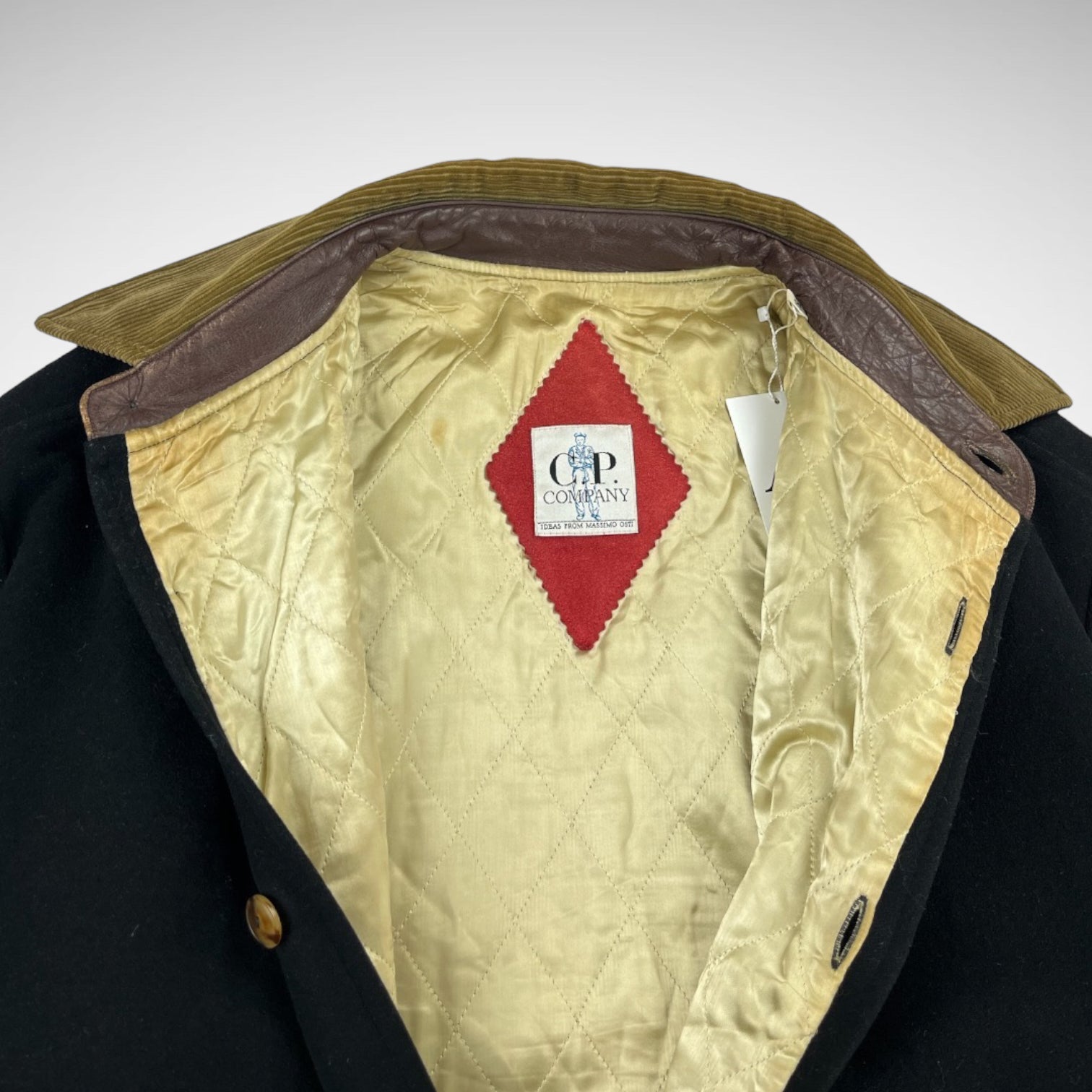 Wool dark dark navy in bomber style with double front compartments and extra slide-entry pockets, button-up closure, corduroy collar and leather on the inside, padded lining and 80s CP Company patch.