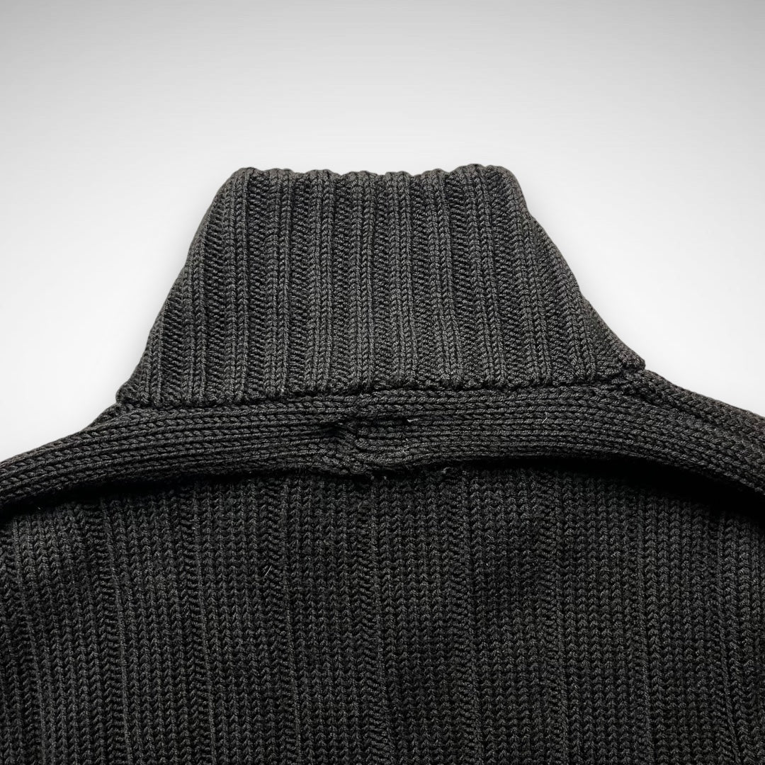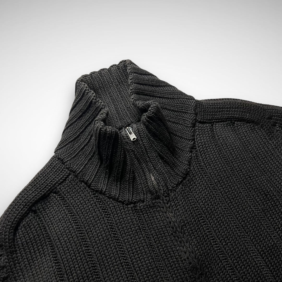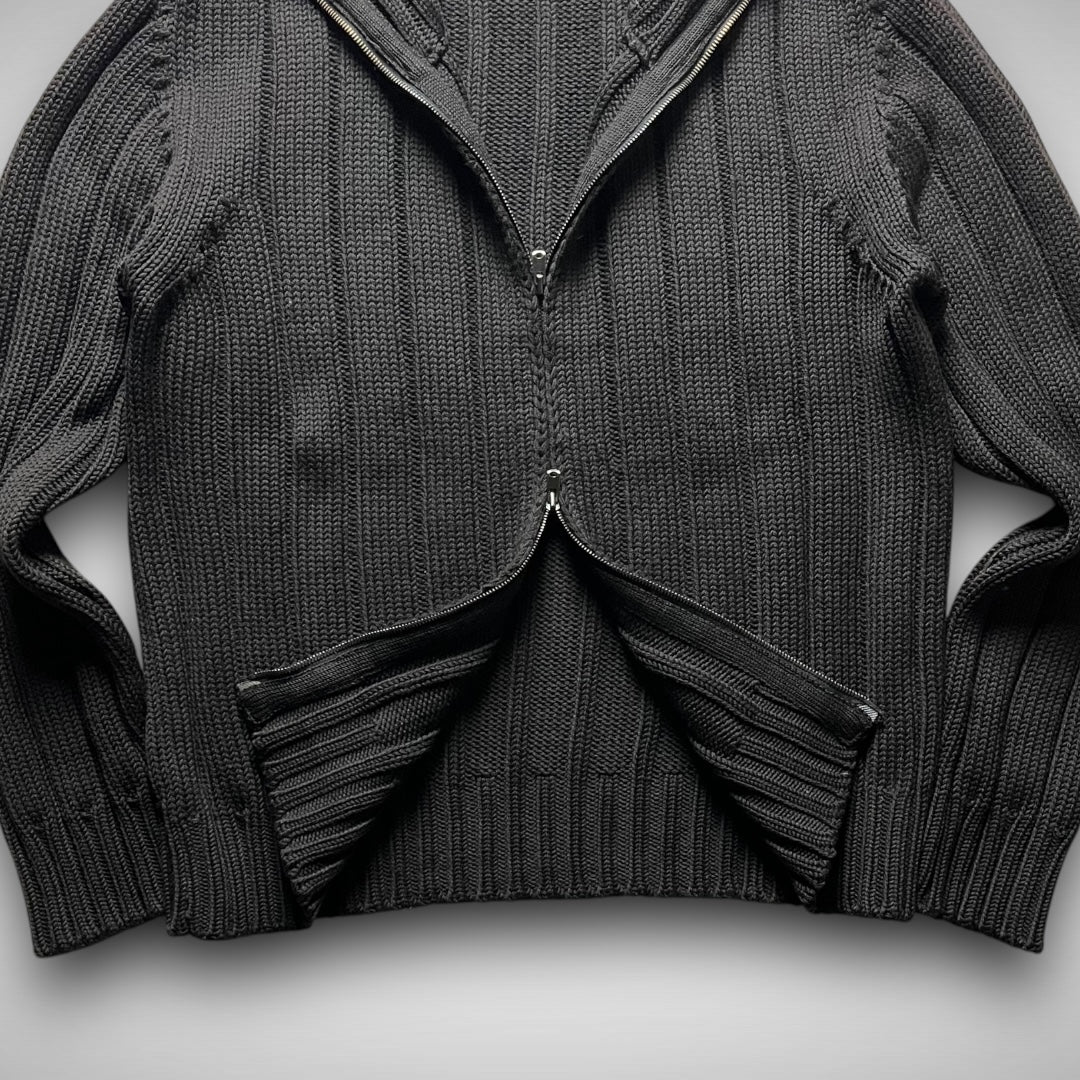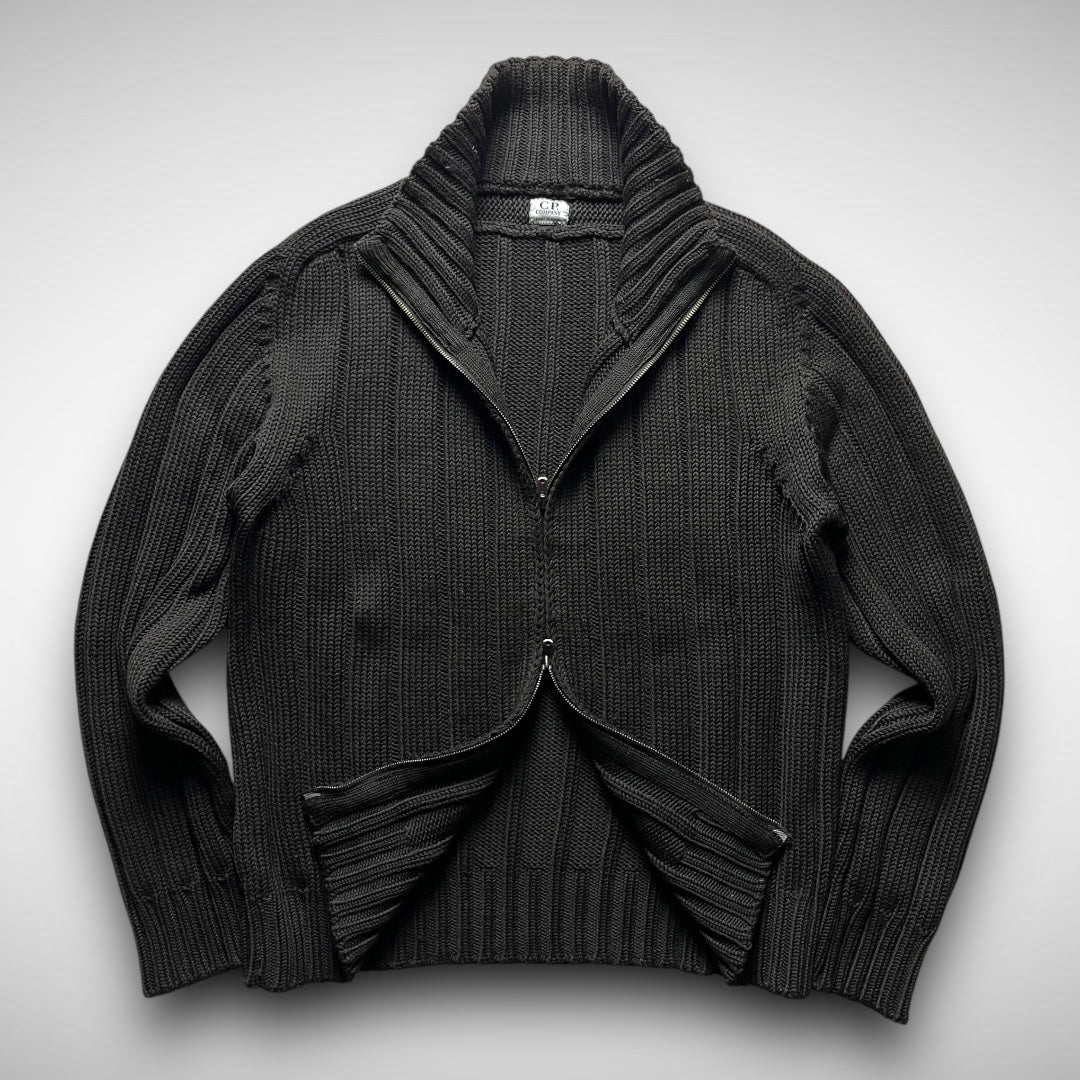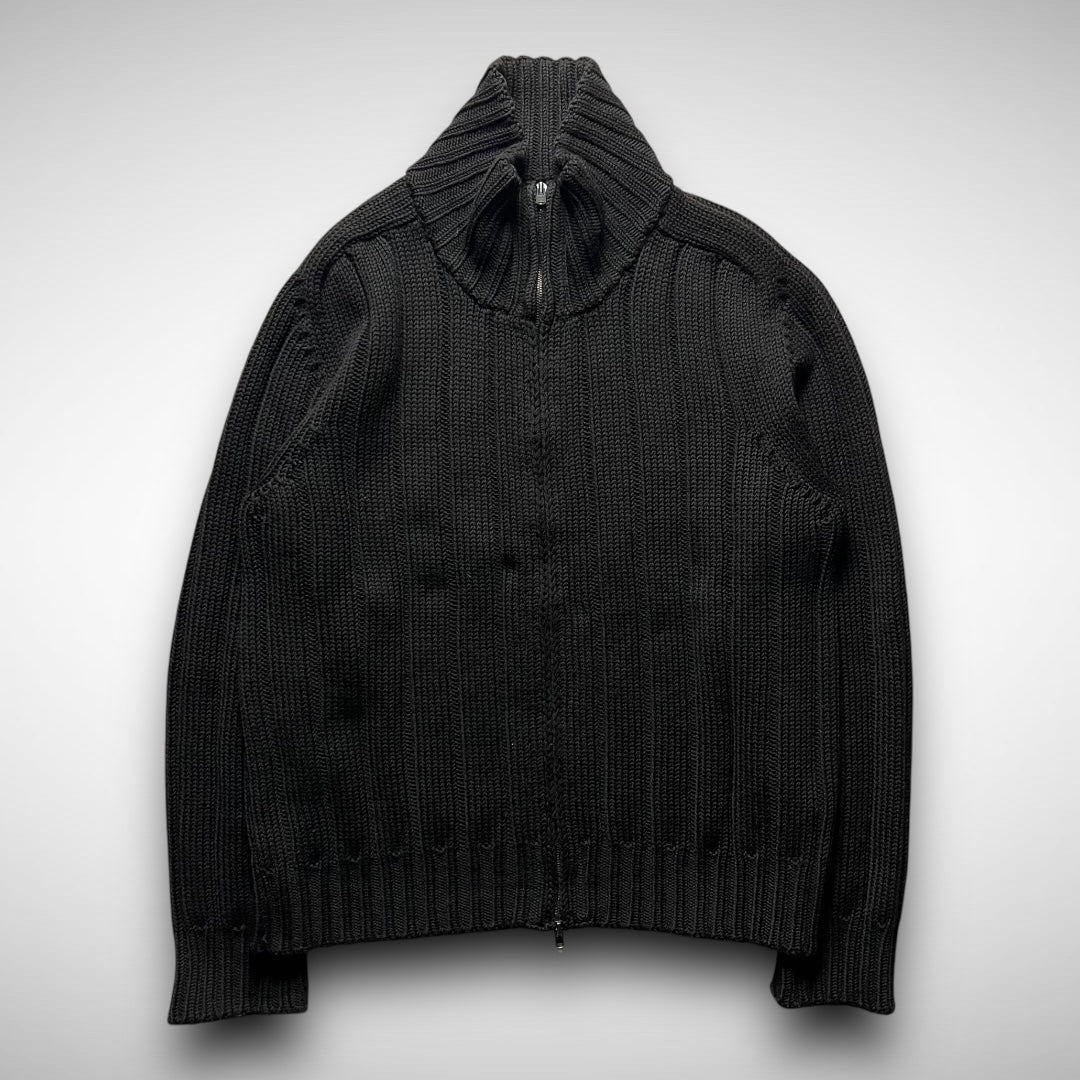Thick and heavy knit with two-way zip closure, high collar and accentuated cuffs and hem.