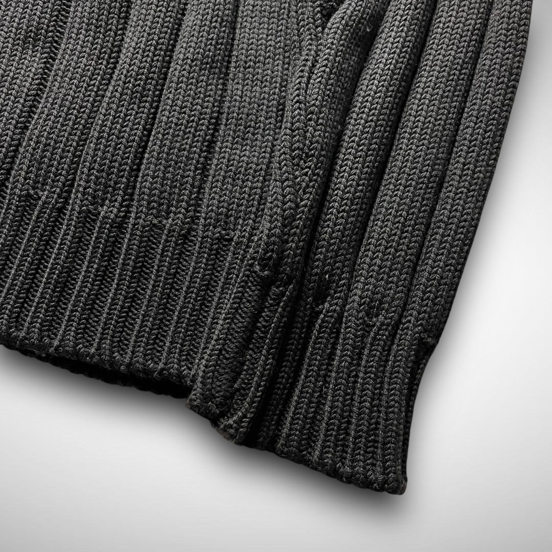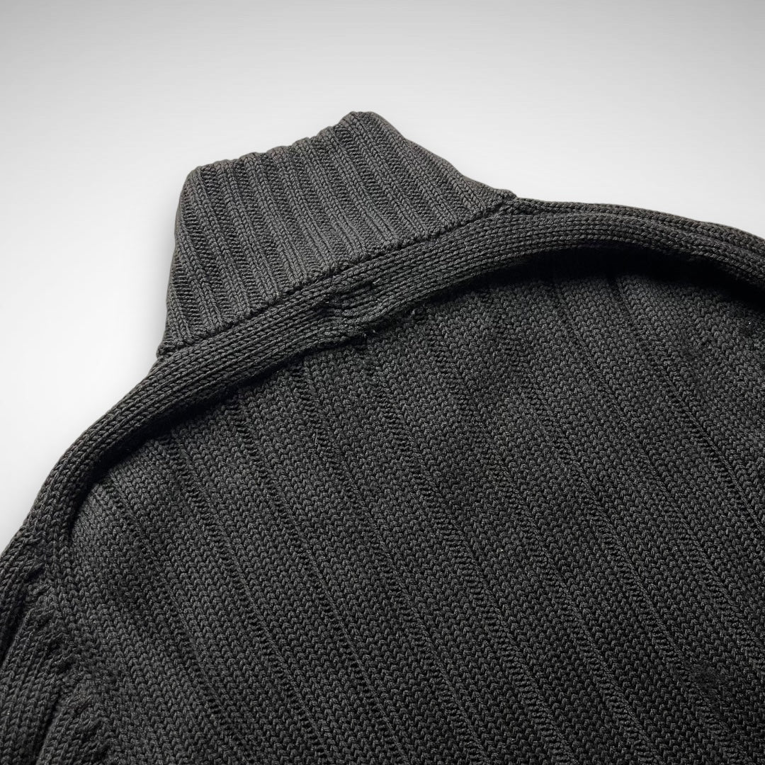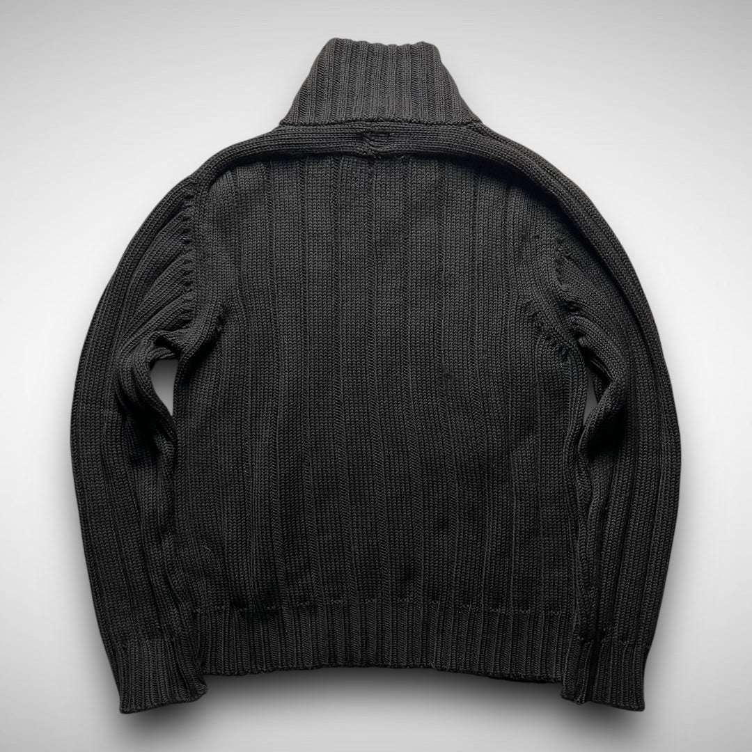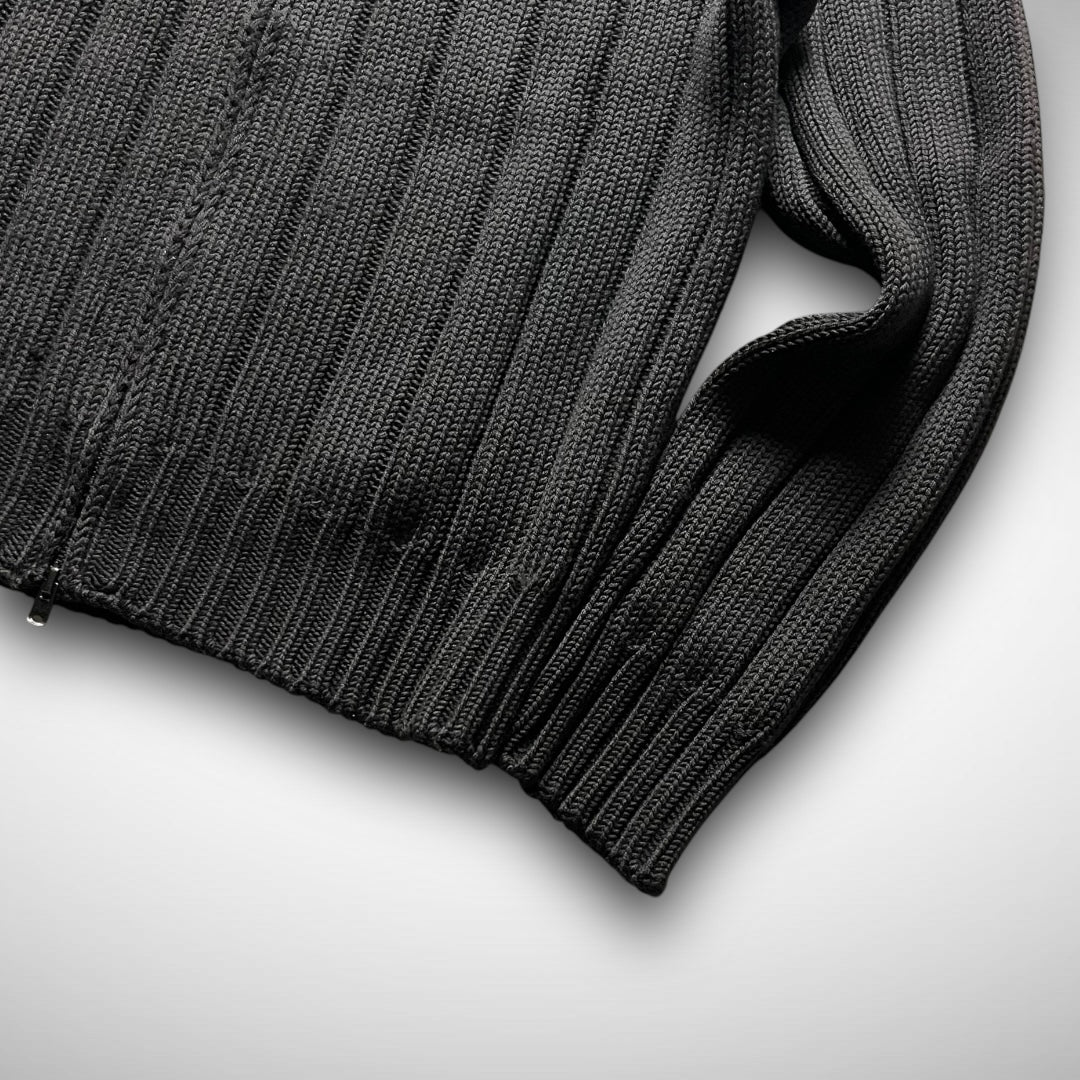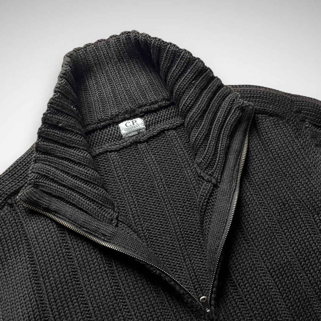 Thick and heavy knit with two-way zip closure, high collar and accentuated cuffs and hem.