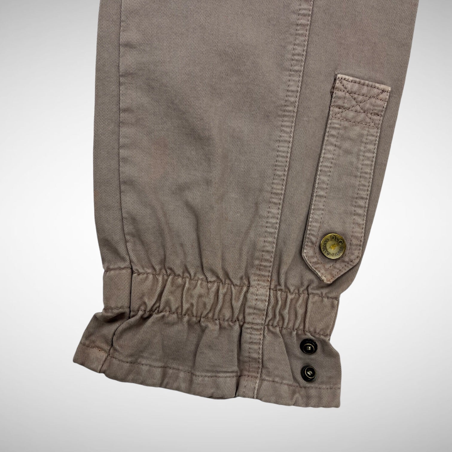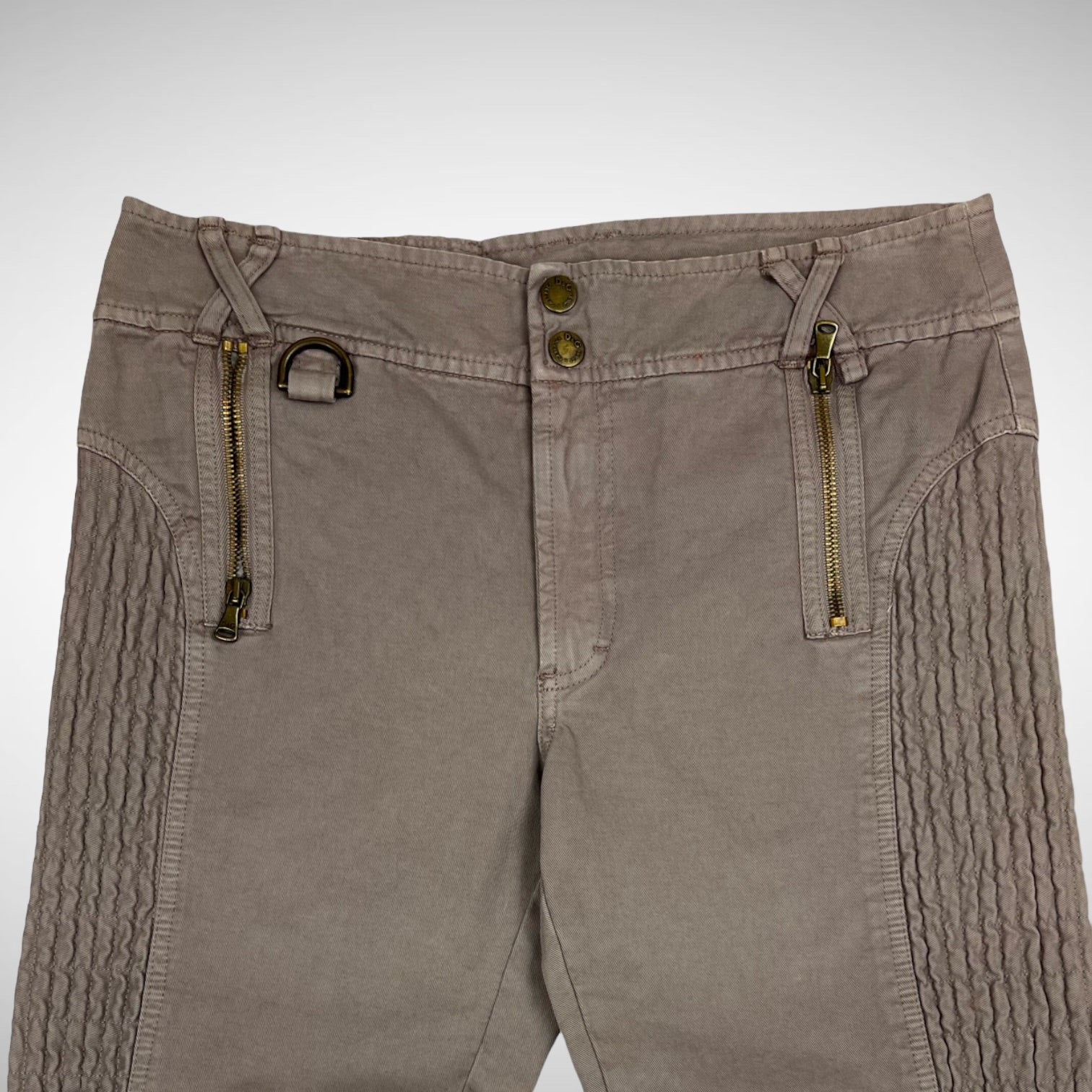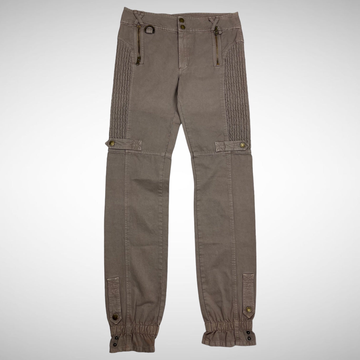 Detailed denims in brown with button adjustable ankles, detailed rims and cross-section belt.