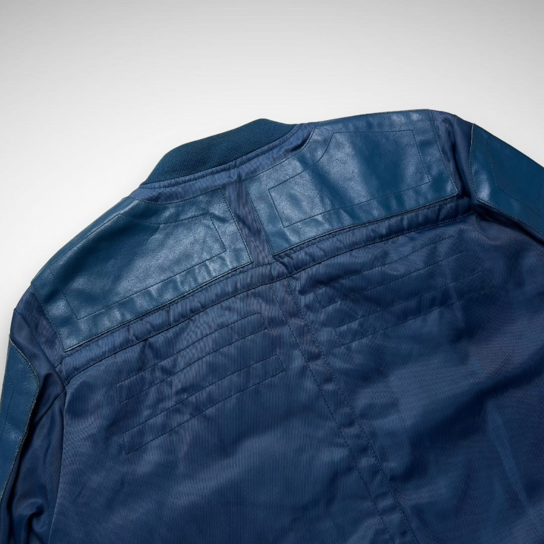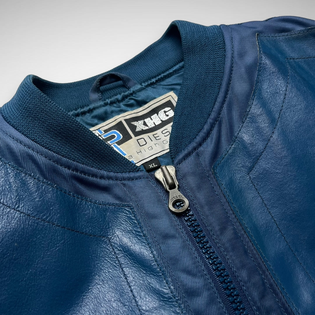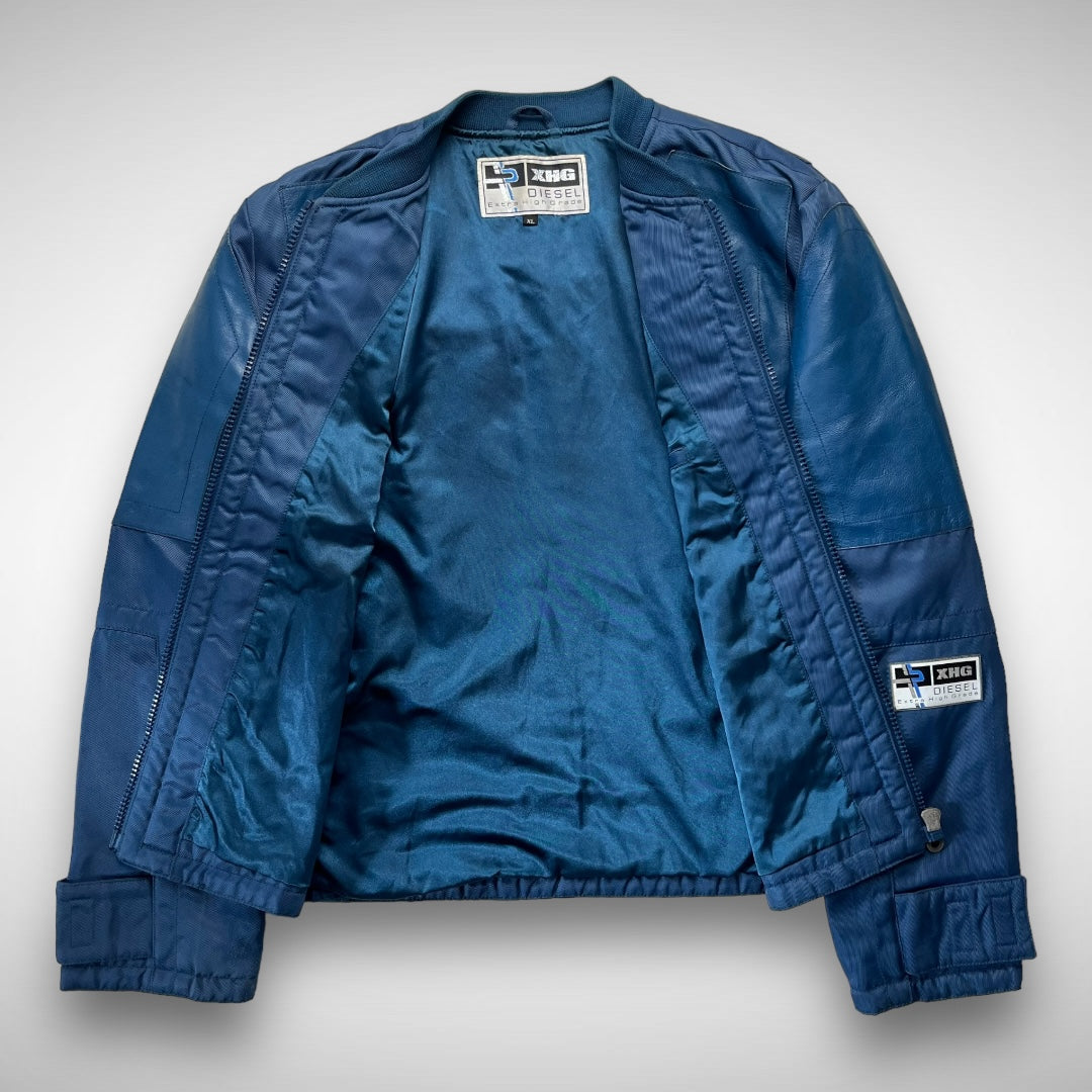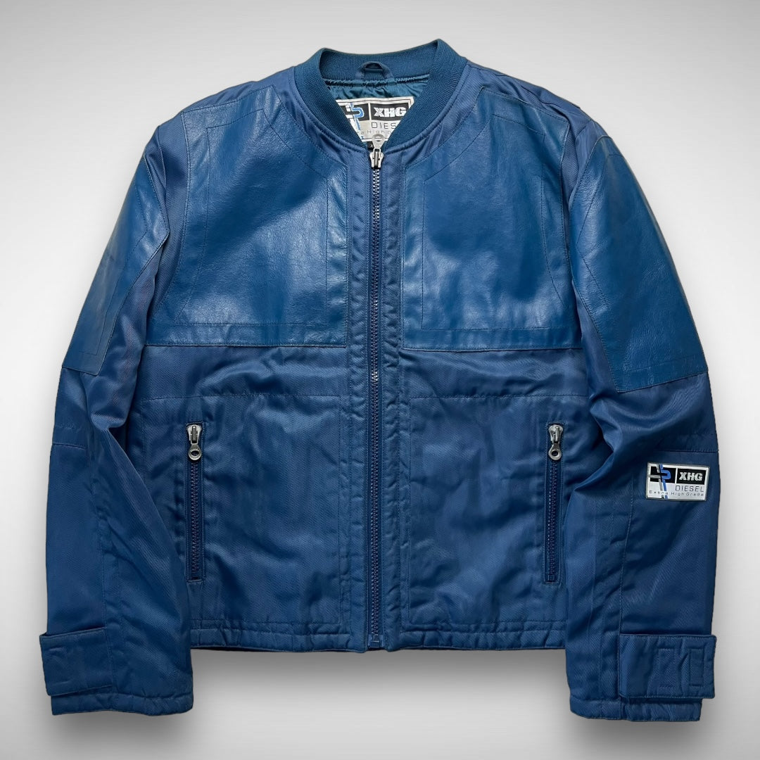 Blue woven-nylon bomber jacket with added leather panels on chest, back-shoulders, upper-arms and back, velcro adjustable strap at cuffs and lower back-side, ‘XHG-Diesel’ branded patch on arm, big branded and curved zips on double pockets and closure system, and stitching highlights across the jacket.