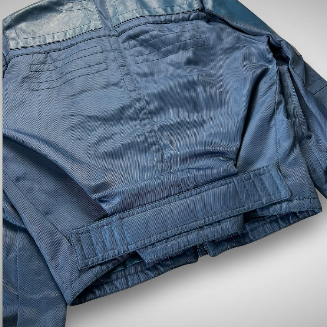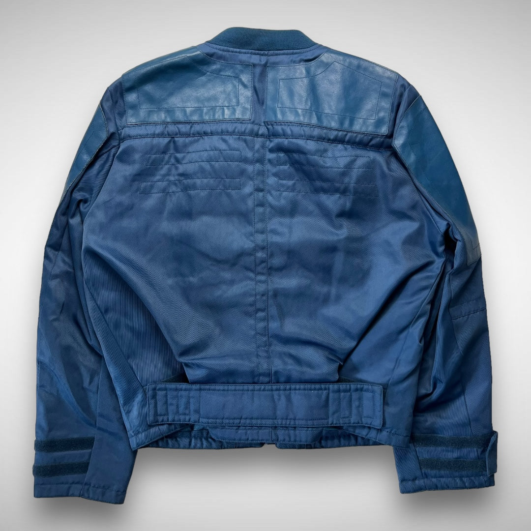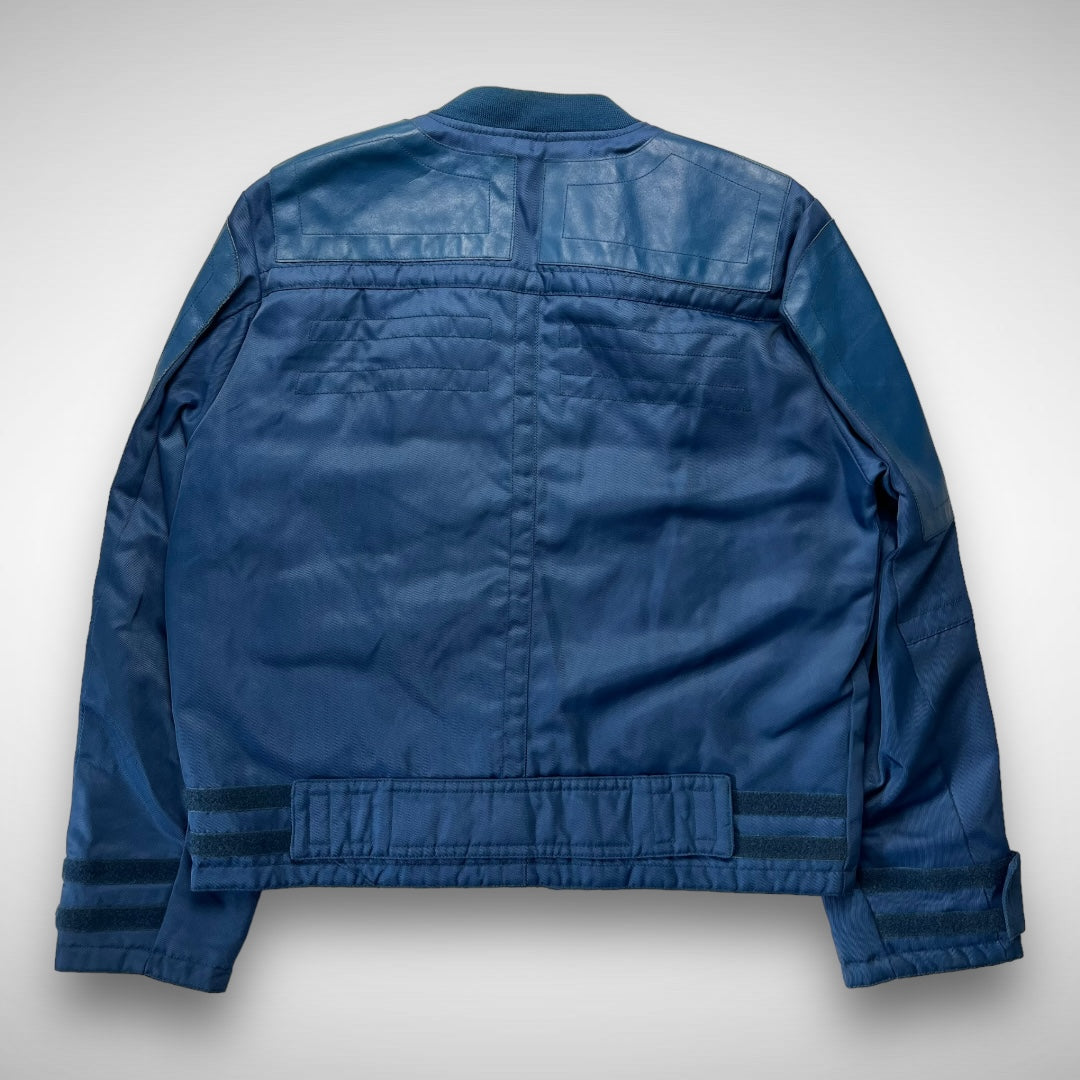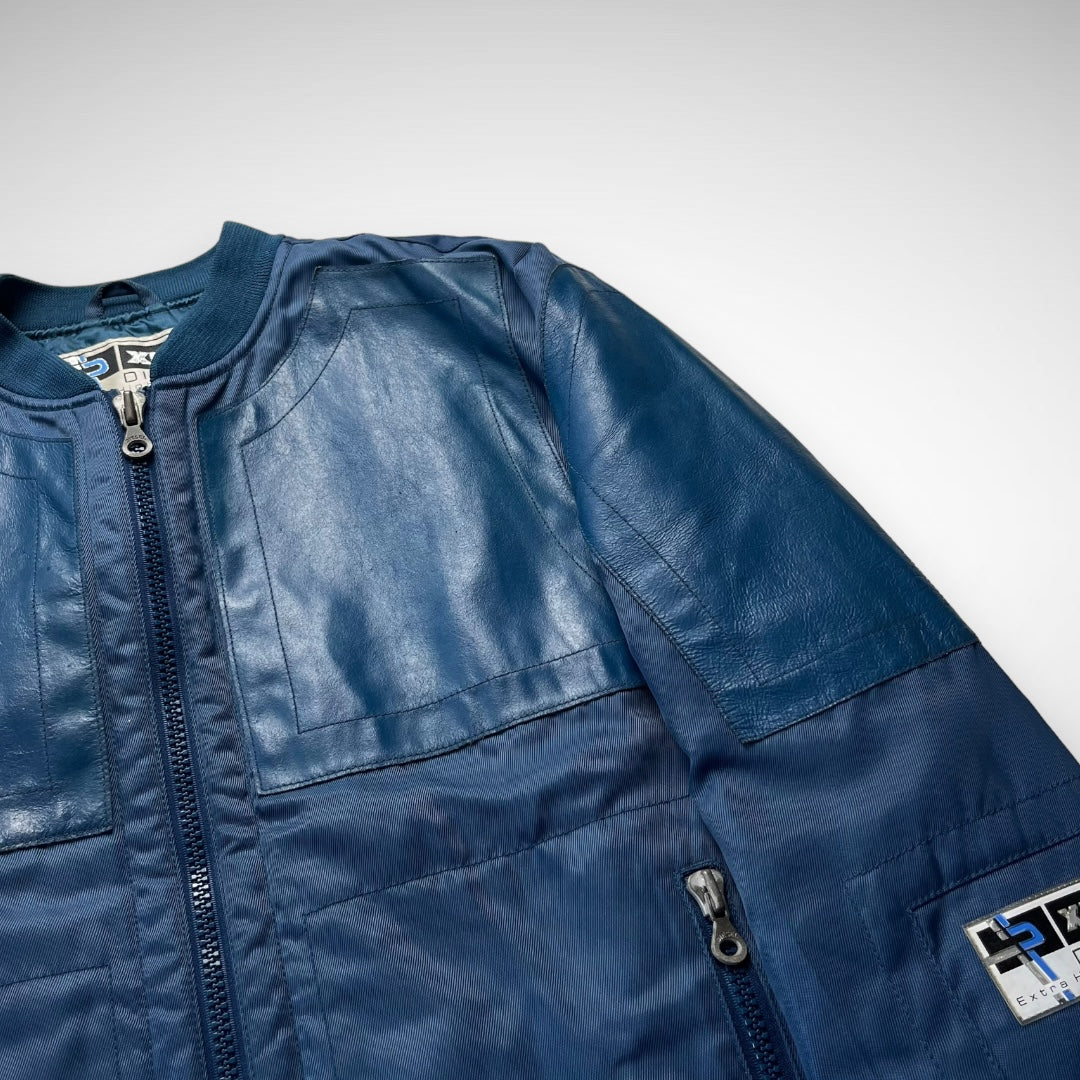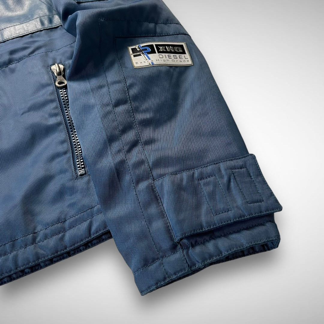 Blue woven-nylon bomber jacket with added leather panels on chest, back-shoulders, upper-arms and back, velcro adjustable strap at cuffs and lower back-side, ‘XHG-Diesel’ branded patch on arm, big branded and curved zips on double pockets and closure system, and stitching highlights across the jacket.