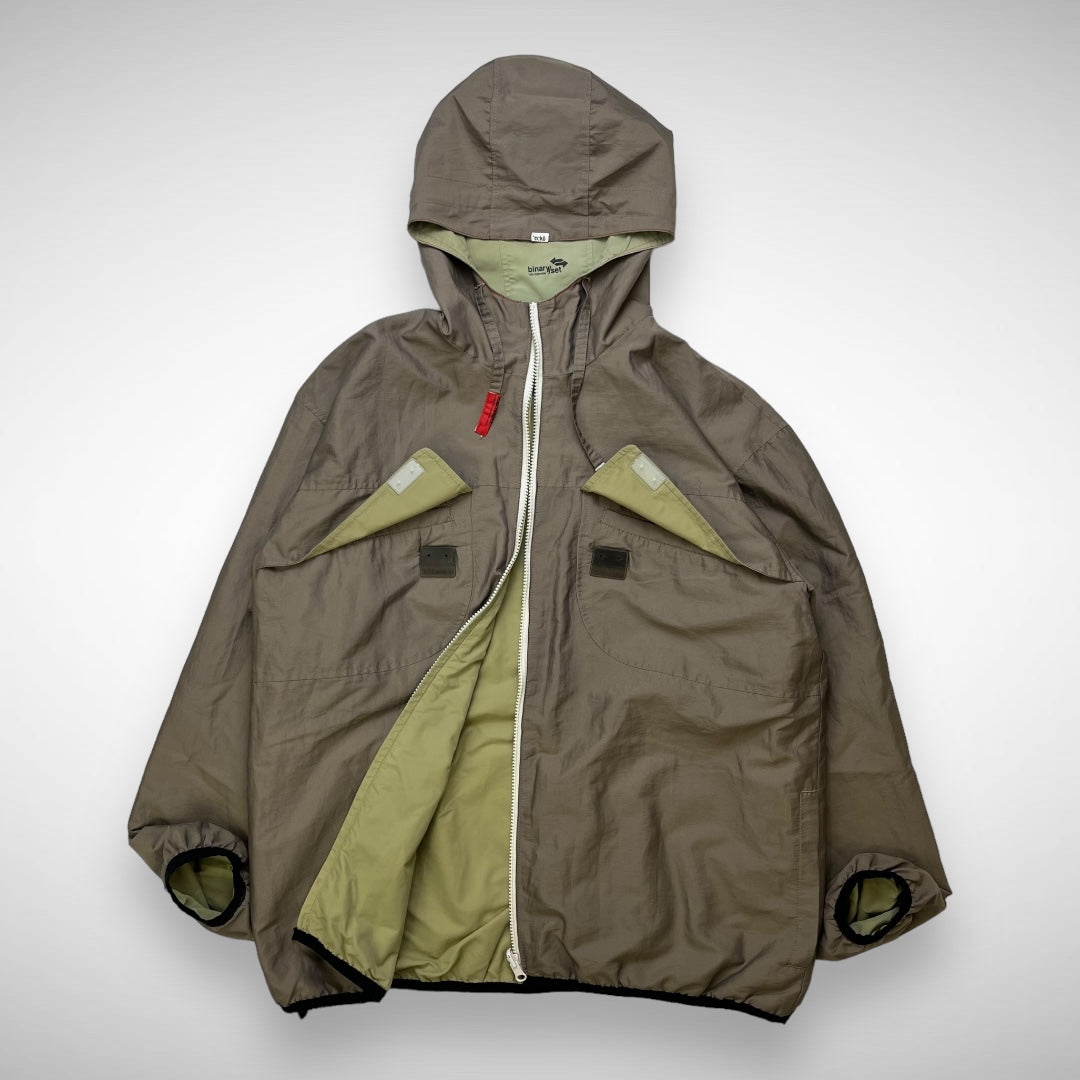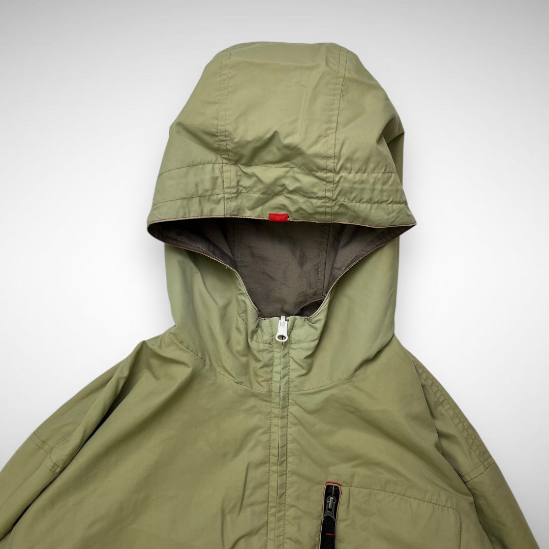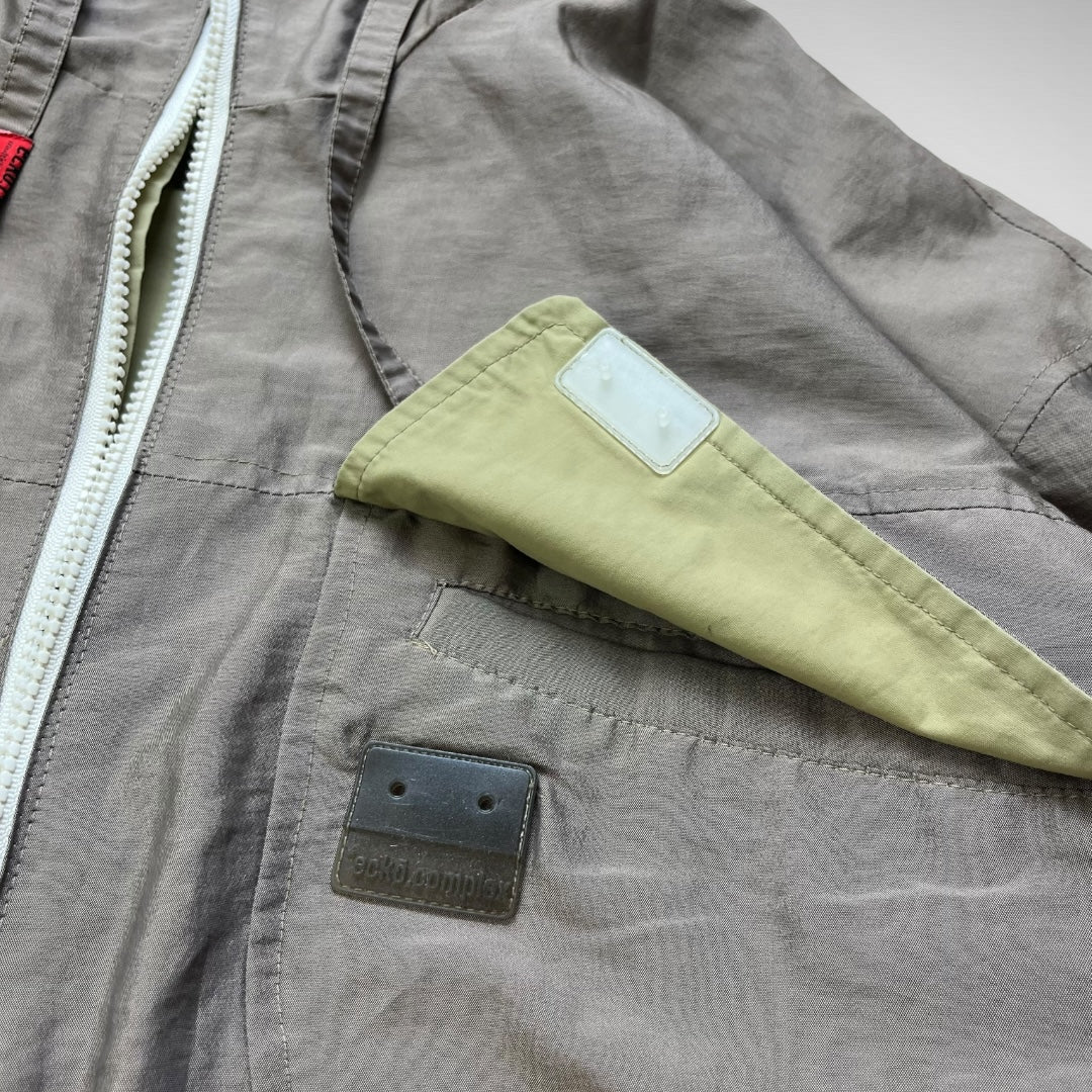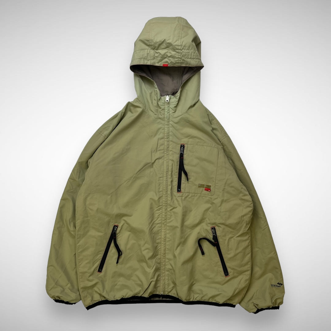 Superb jacket from the golden era of Ecko’s Complex Series featuring a reversible function in light green and brown with several details in red and white such as main zip closure, pull cords to adjust hood, flaps to uncover chest pockets with unique rubber closing-system, and triple zip pocketing on green side.