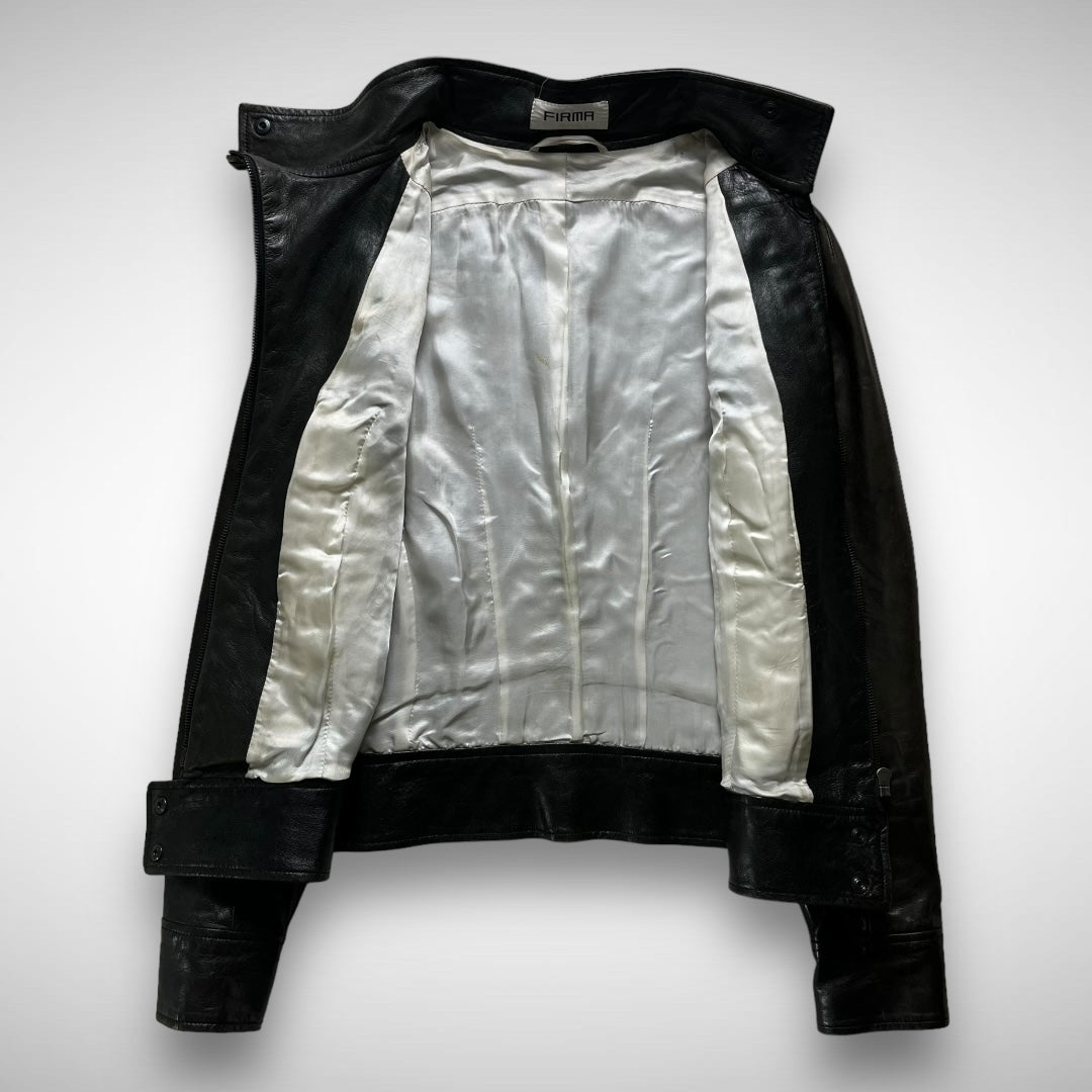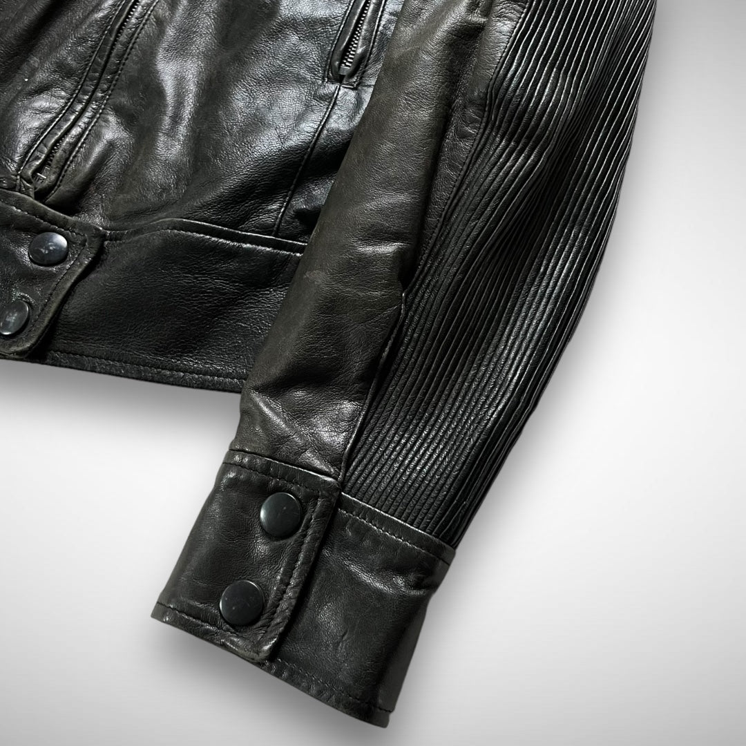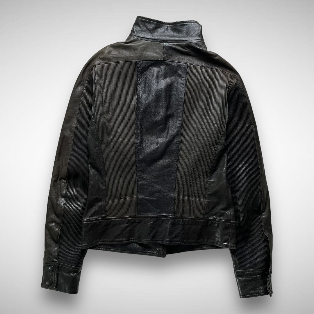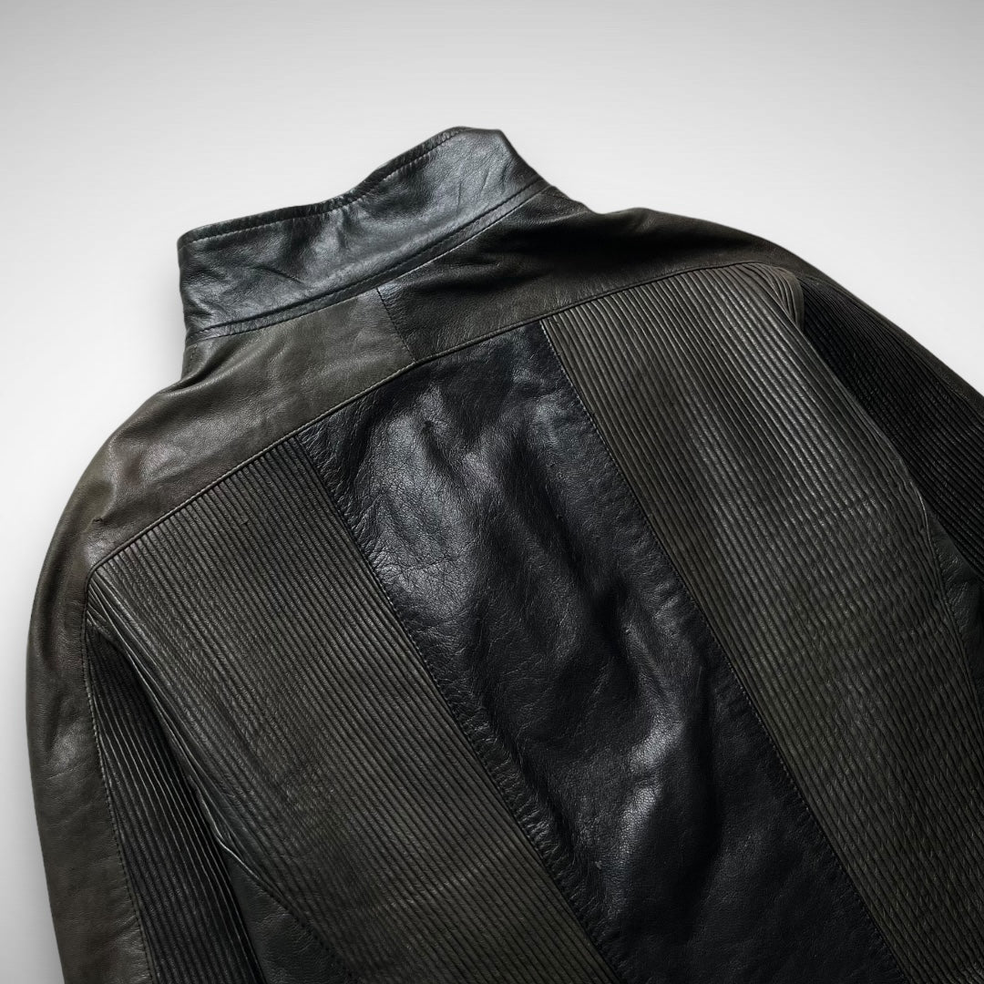Very dark green leather jacket featuring curved-zip closure, double pockets and lower arm compartment with big ‘Riri’ zip-pulls, additional double press-button at collar, hem and cuffs, and detailed panels on back-side and inner arms. Made in Germany from high quality fabrics in biker-style.