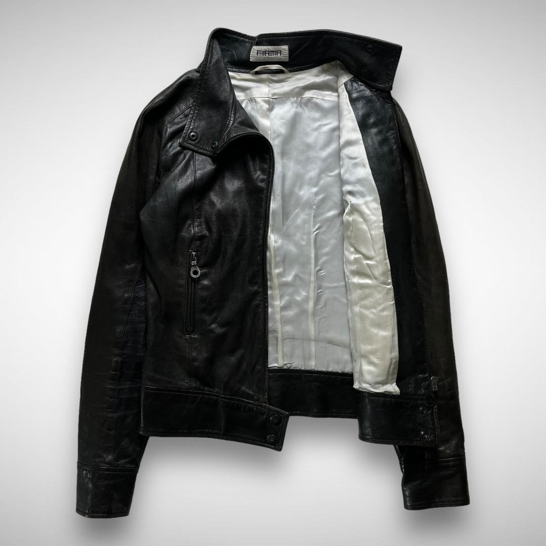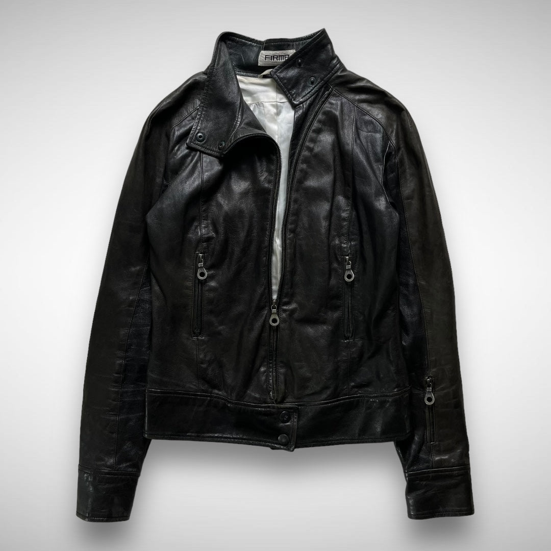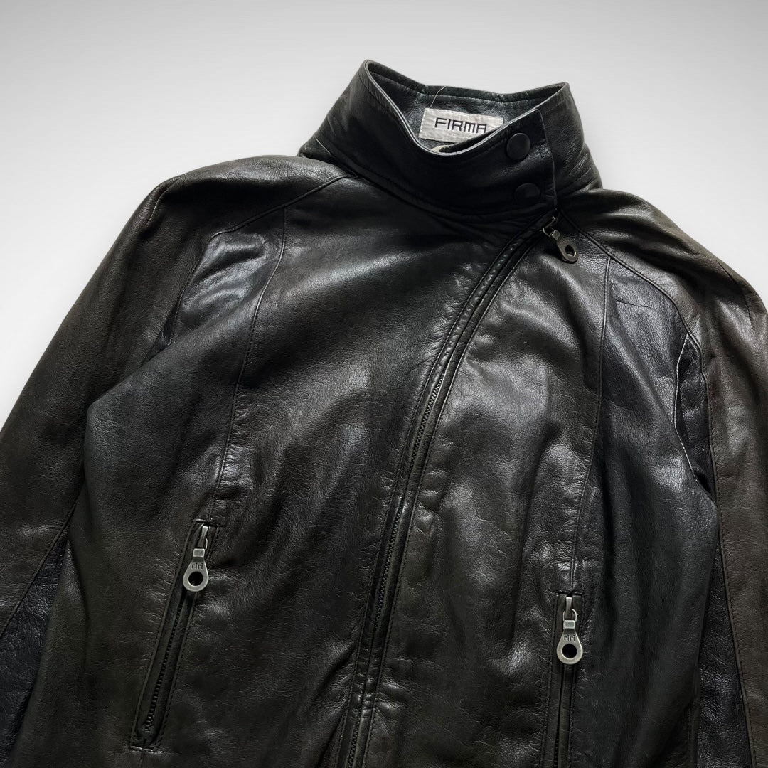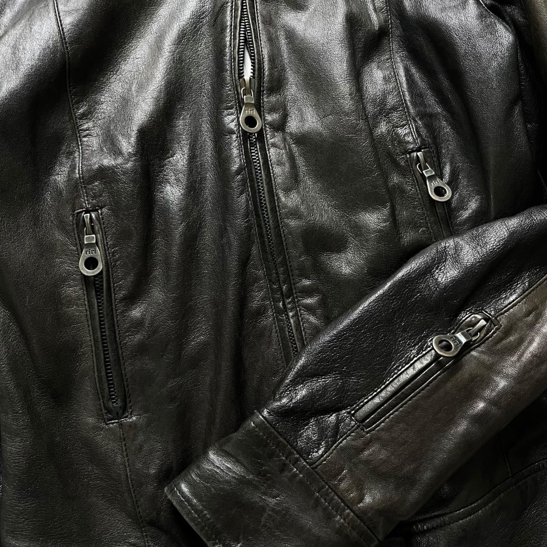 Very dark green leather jacket featuring curved-zip closure, double pockets and lower arm compartment with big ‘Riri’ zip-pulls, additional double press-button at collar, hem and cuffs, and detailed panels on back-side and inner arms. Made in Germany from high quality fabrics in biker-style.