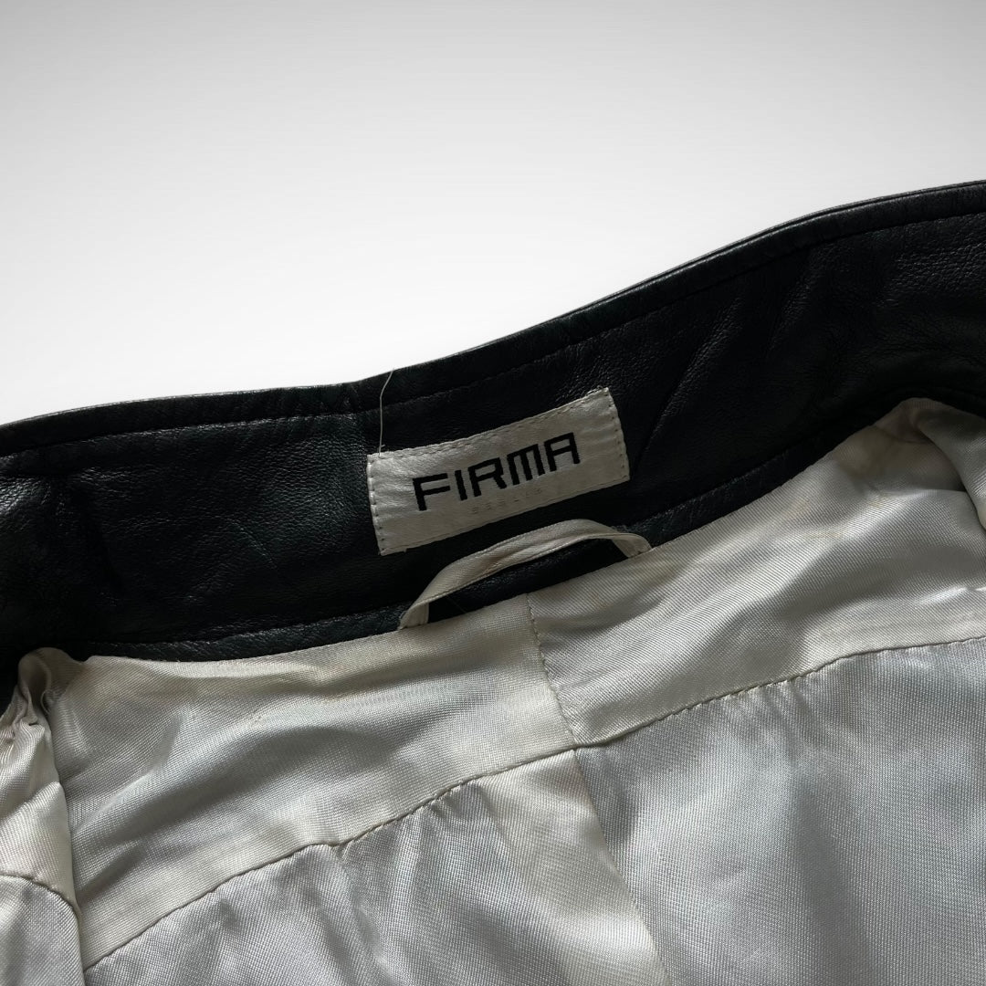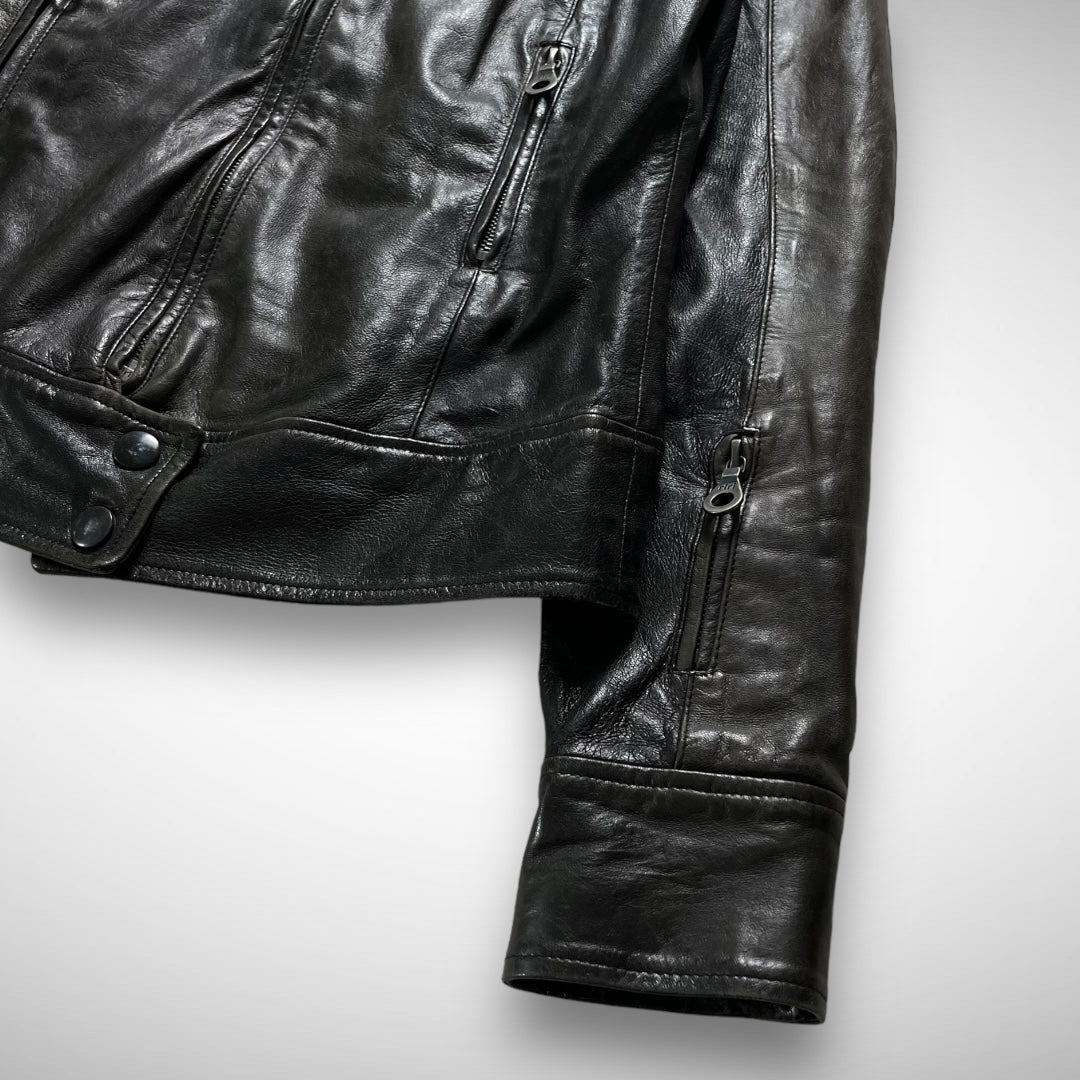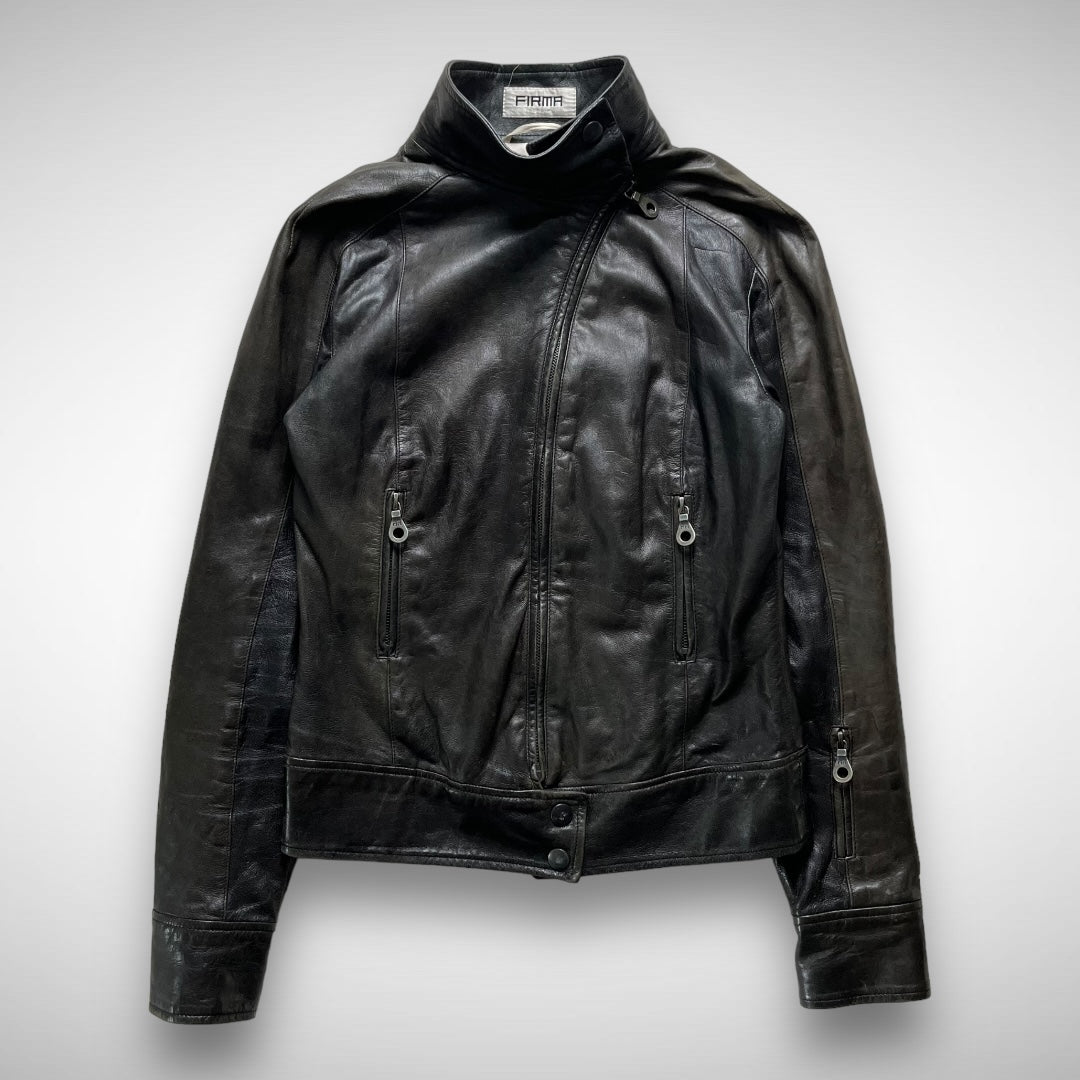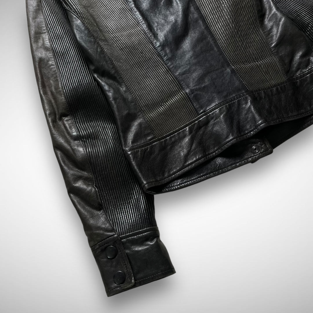 Very dark green leather jacket featuring curved-zip closure, double pockets and lower arm compartment with big ‘Riri’ zip-pulls, additional double press-button at collar, hem and cuffs, and detailed panels on back-side and inner arms. Made in Germany from high quality fabrics in biker-style.
