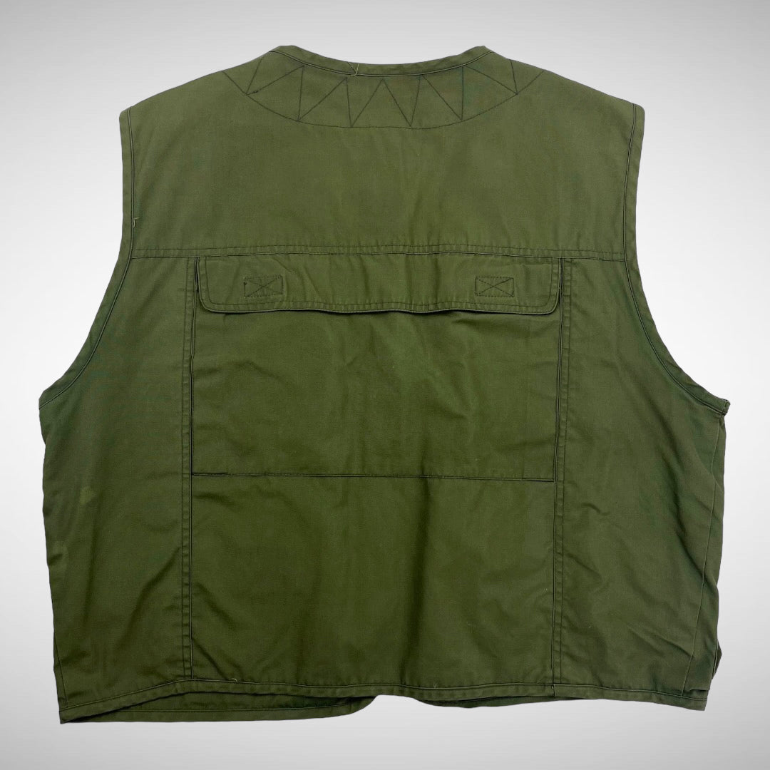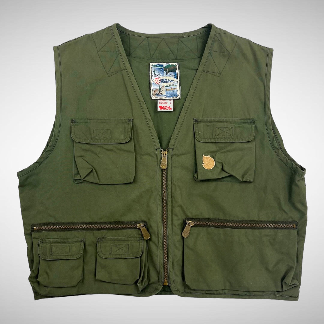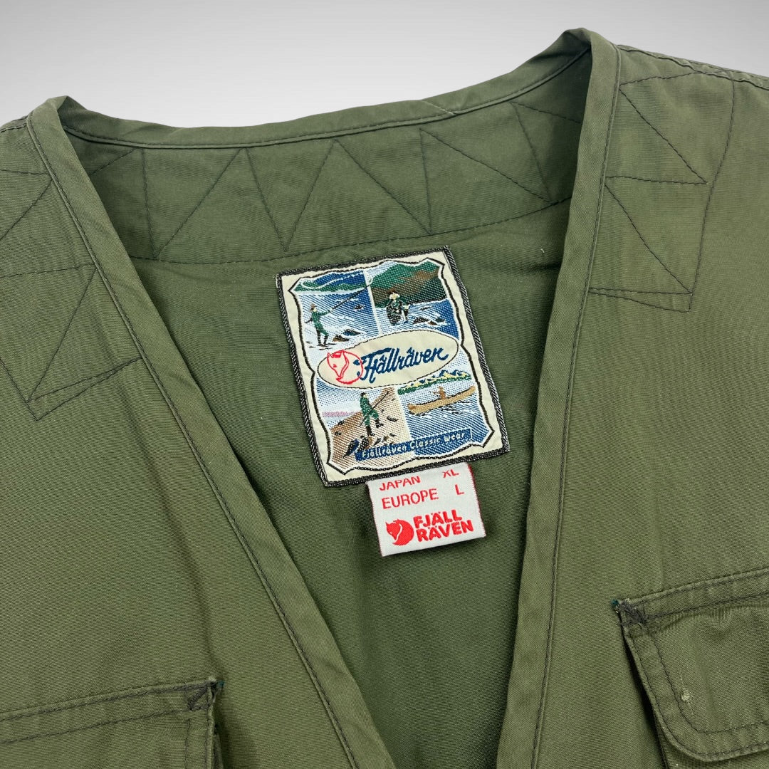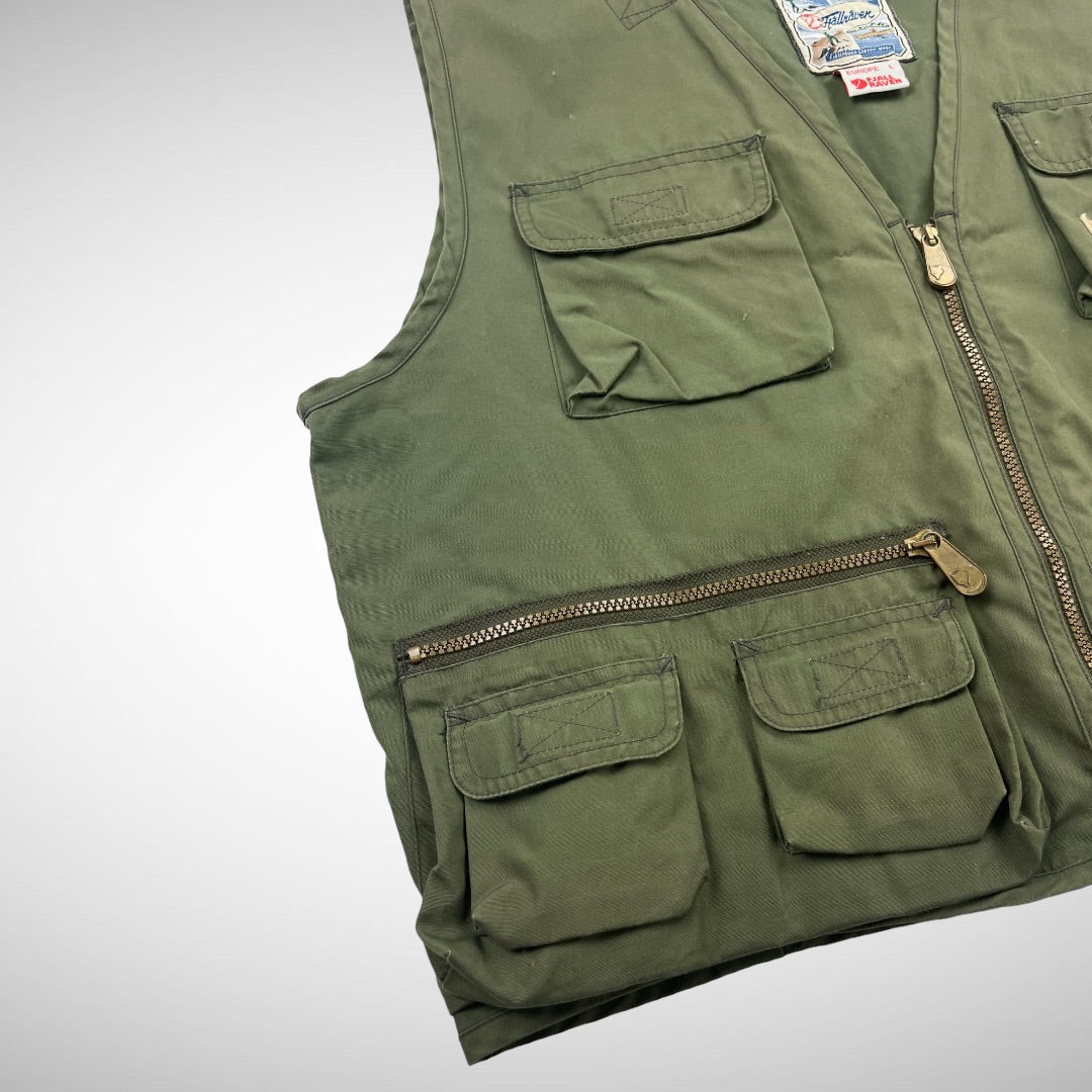 Green cotton fishing vest with a multitude of big-zip pockets and addition velcro-flap compartments accompanied with the Fjallräven logo on the chest and reinforced stitching around collar.