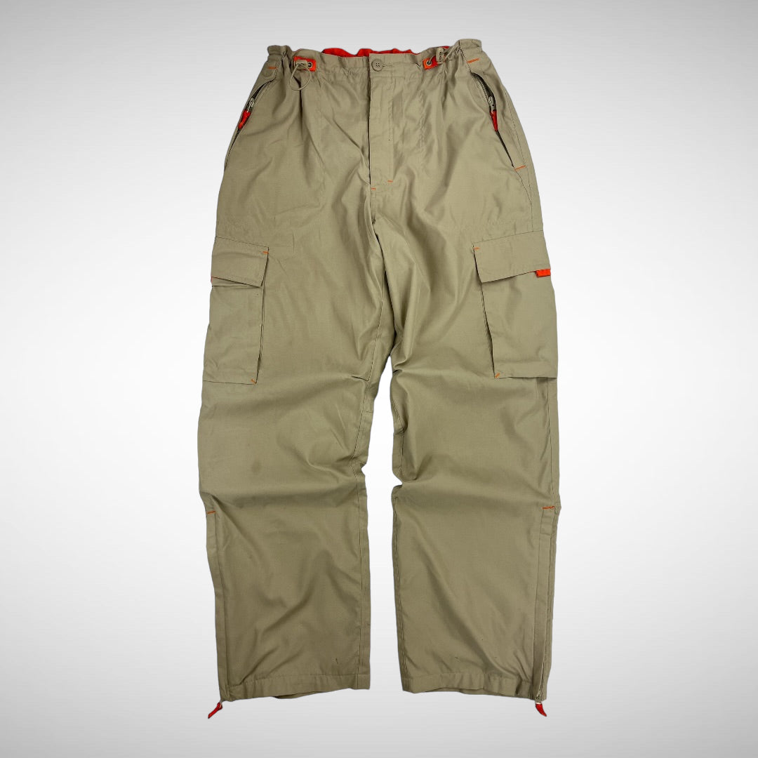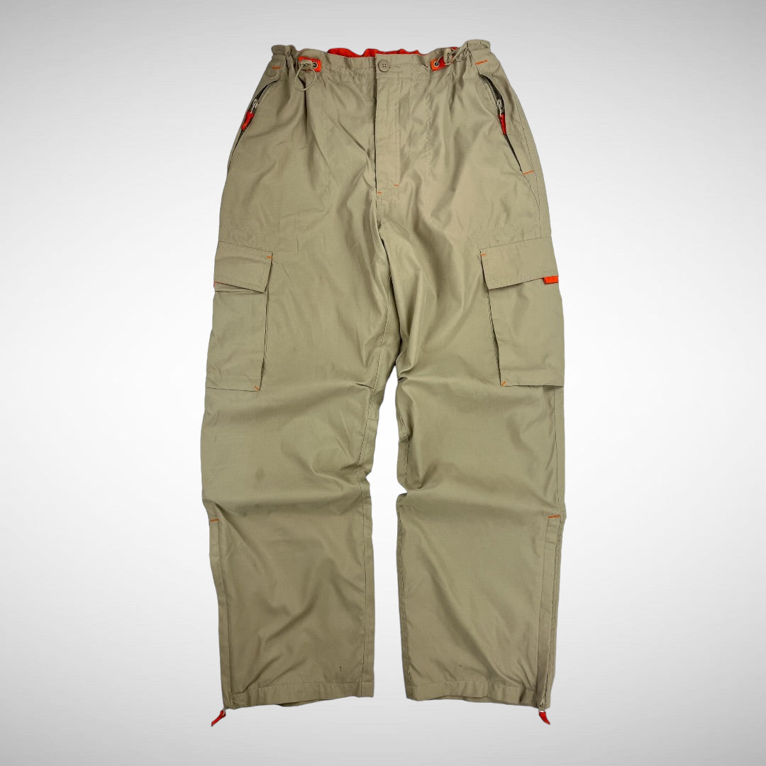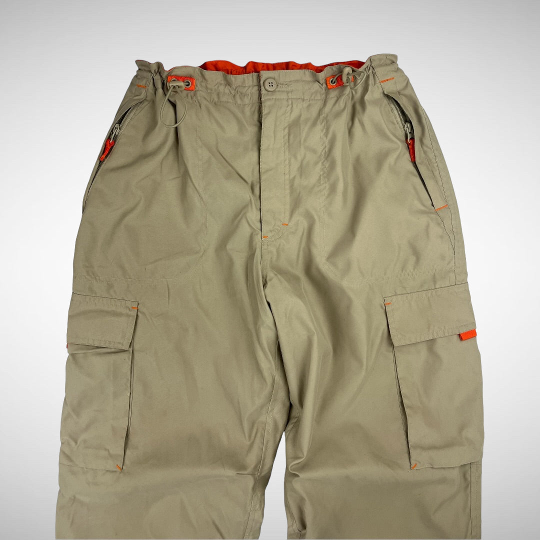 Sand coloured cargos with mesh lining, double zip-pockets, tactical velcro pockets on the sides and back, adjustable toggled waist with orange details throughout and zip adjustable ankles.