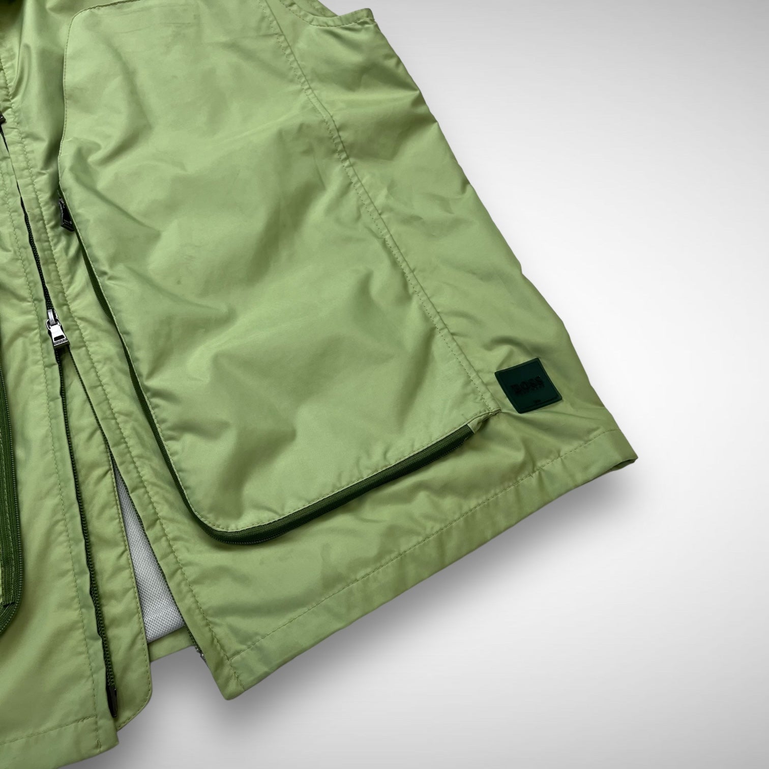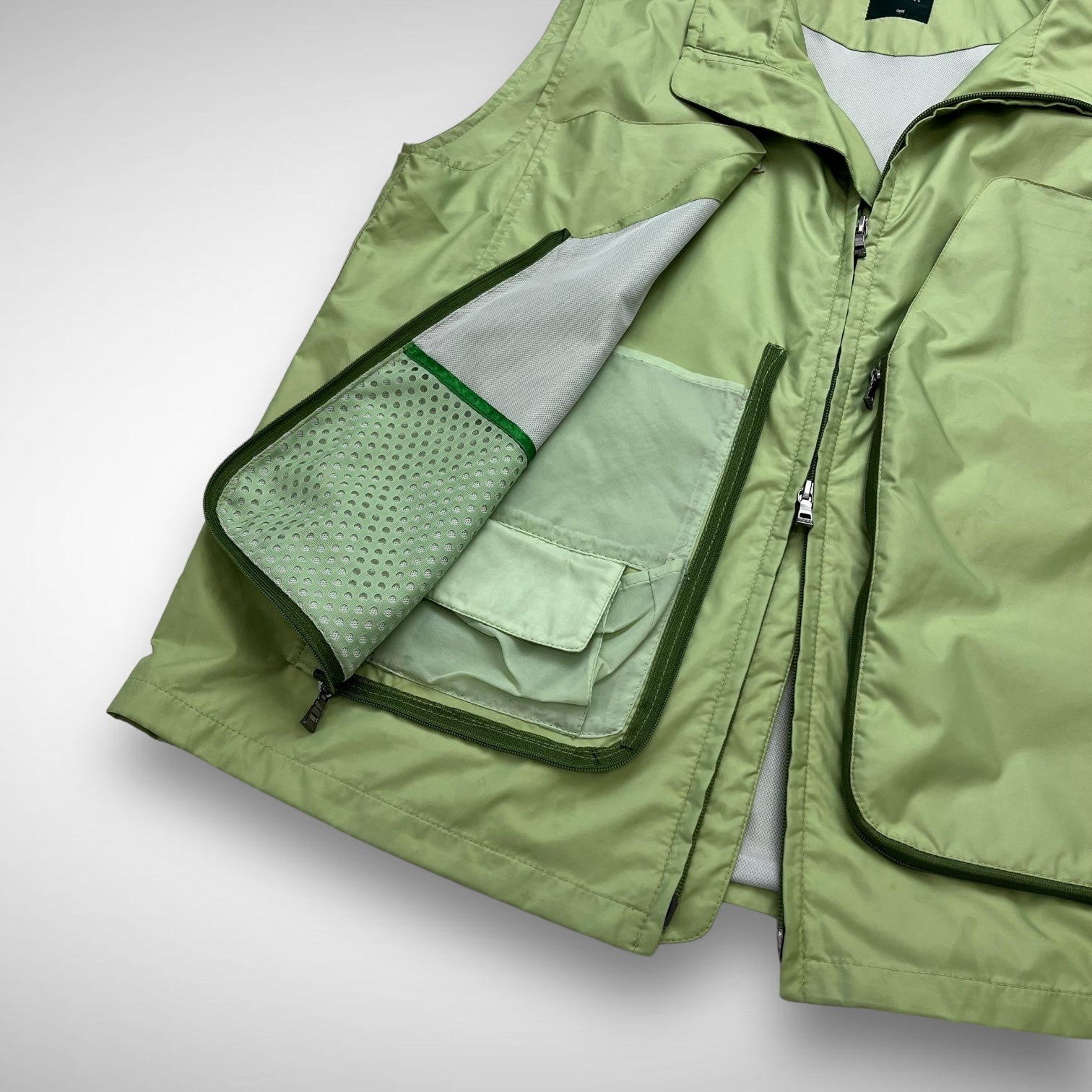 Nylon green vest with concealed velcro and zip-closure organisation pockets, mesh lining and branded rubber tag at lower waist.