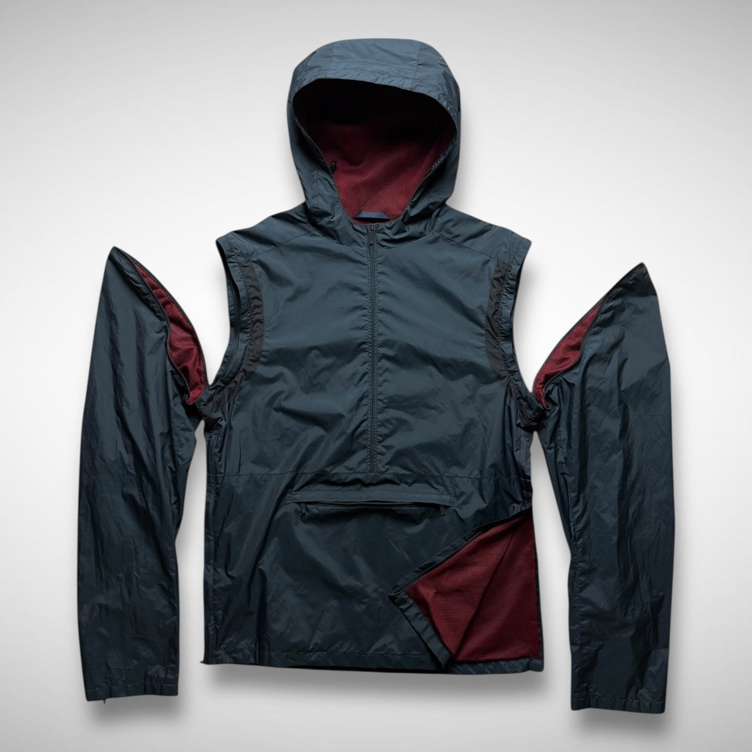 Dark teal Kenzo pullover with a 1/2 zip construction, deep burgundy mesh lining, and detachable sleeves that convert it into a vest. Features include a zip kangaroo pocket, hidden back panel, and articulated seams for mobility. Lightweight, packable design.