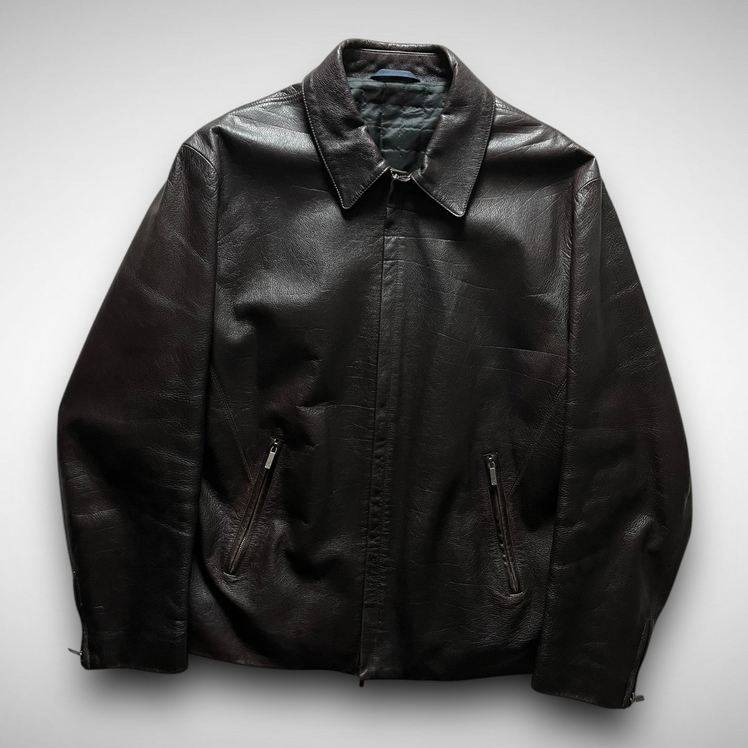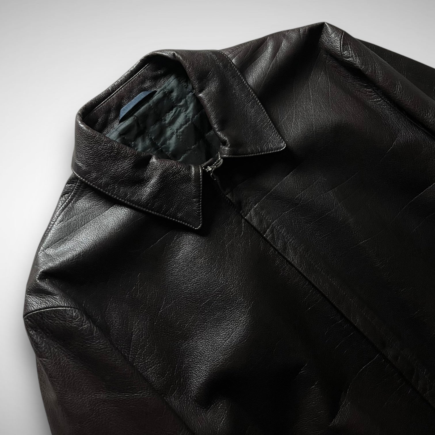 Crafted from dense, supple brown buffalo, the outer shell is nearly stitchless, save for subtle shaping seams and two vertical zip pockets that blend seamlessly into the body. Inside, the jacket features a quilted upper lining for warmth and structure, paired with a silky lower lining and a hidden interior pocket. The overall finish is one of the cleanest we’ve seen on a leather garment from this era.