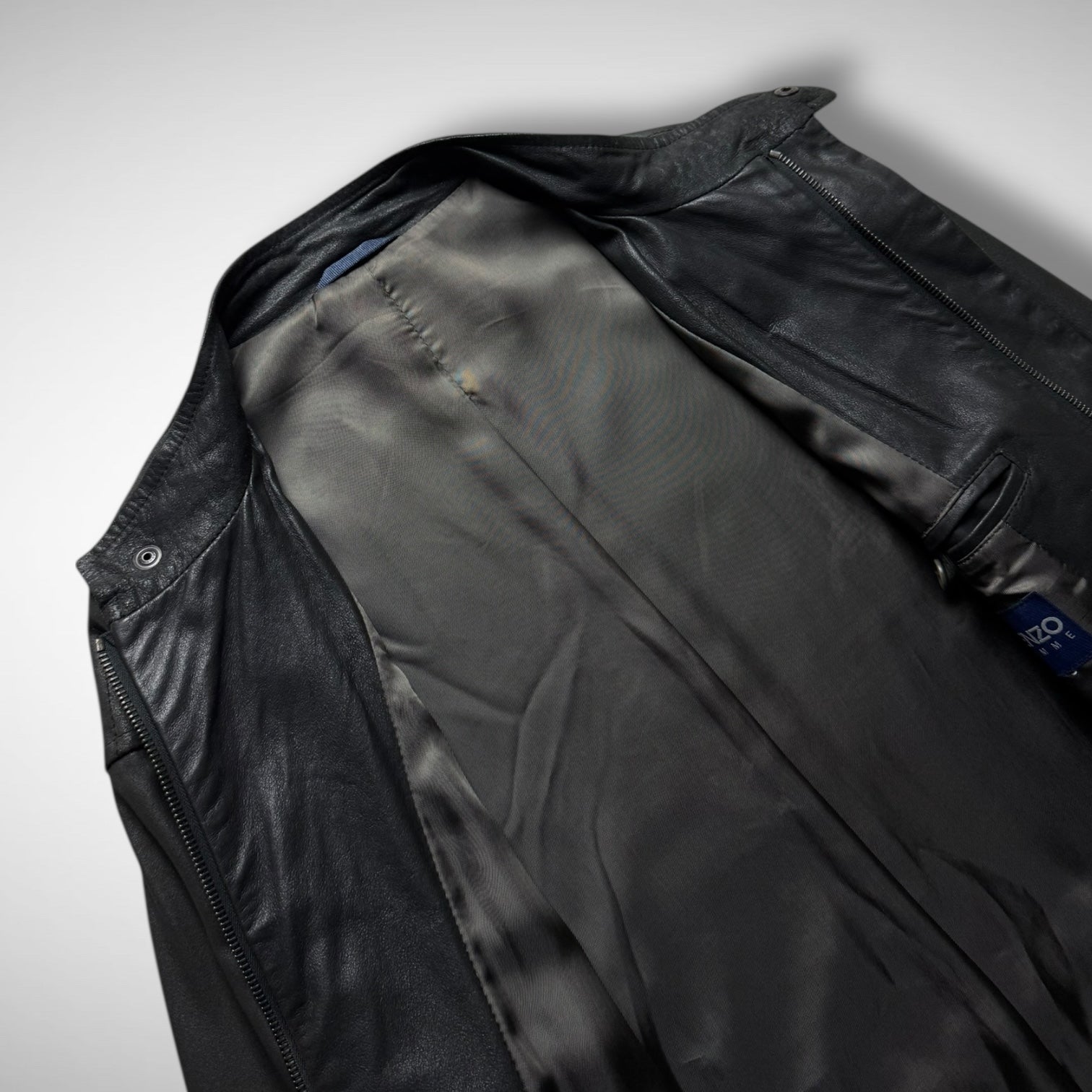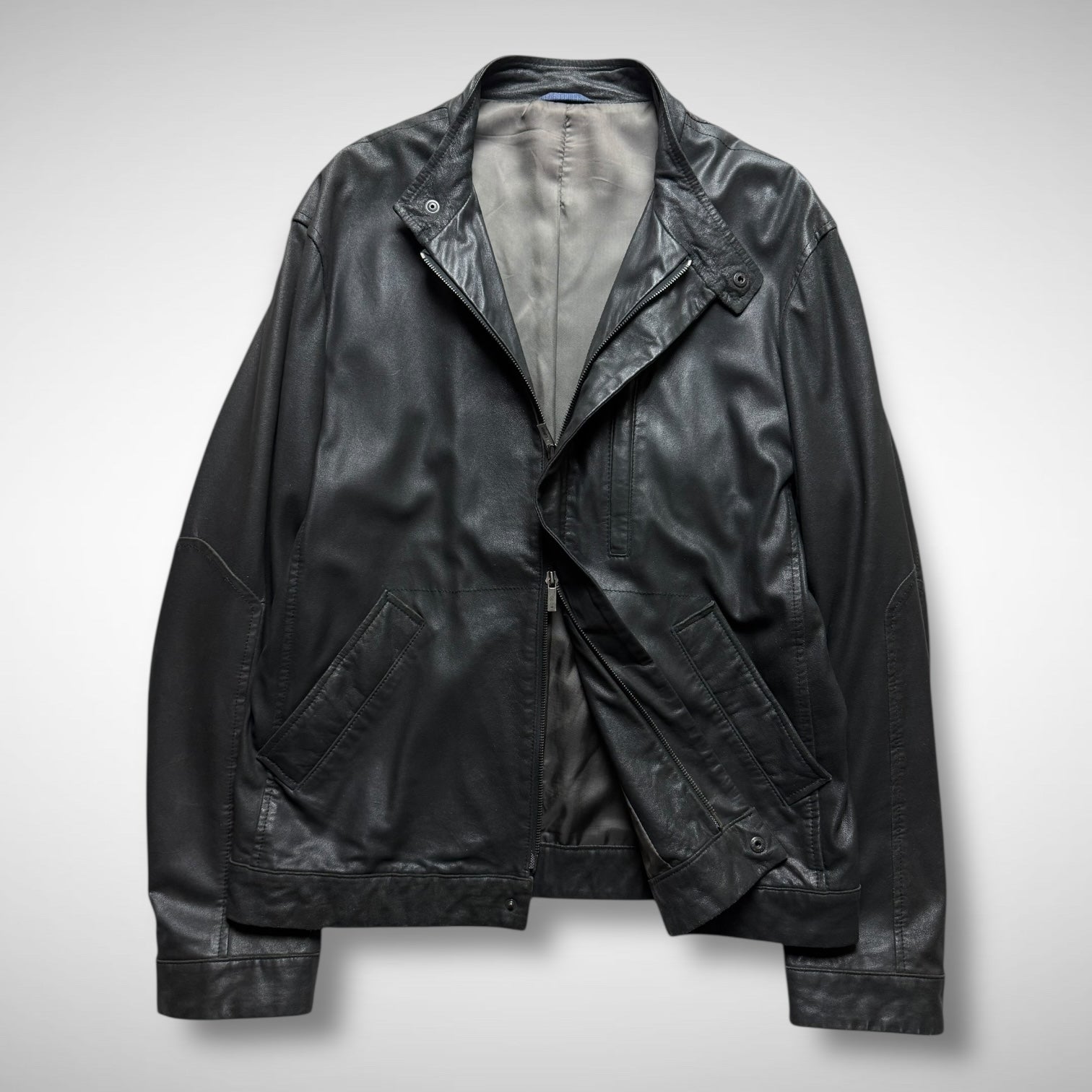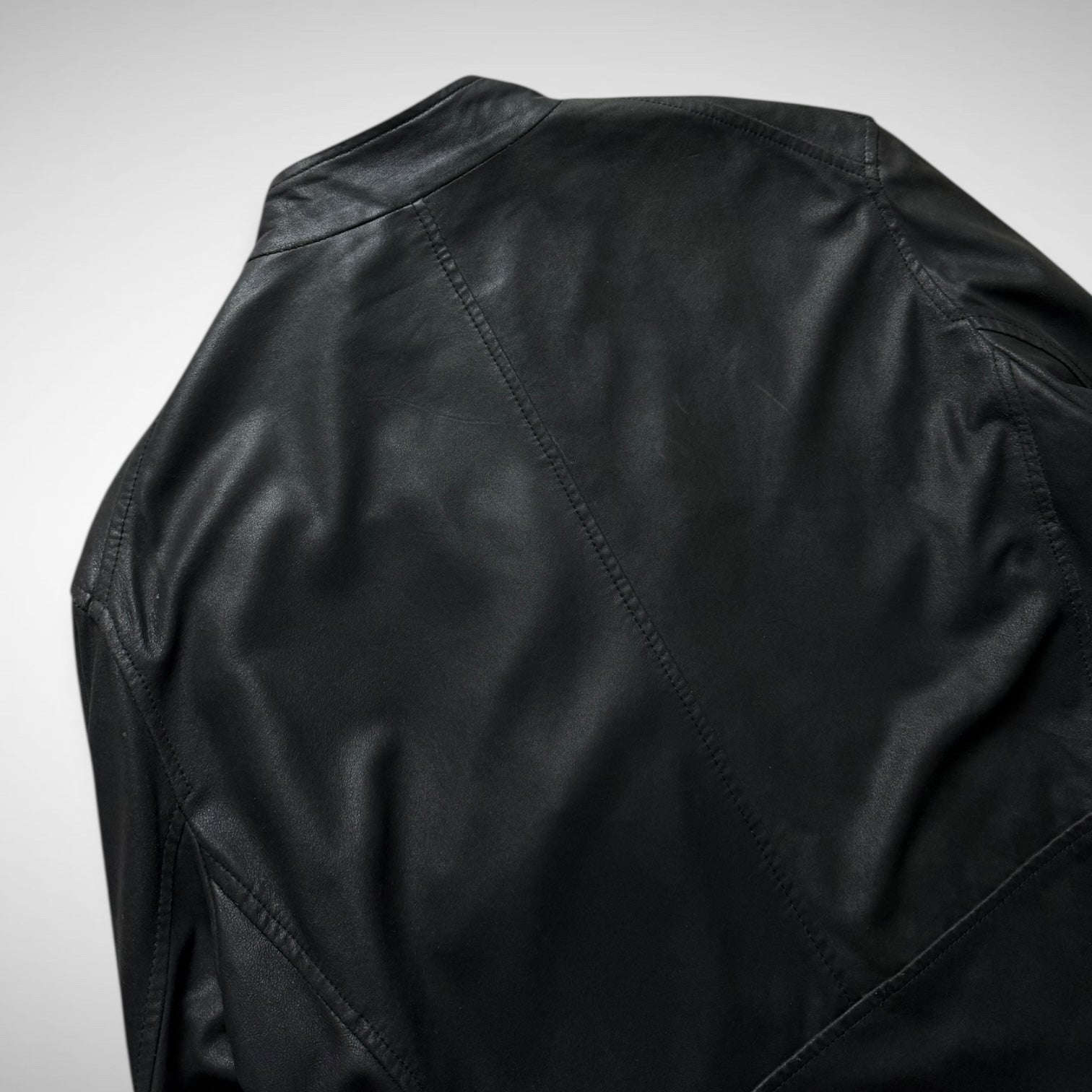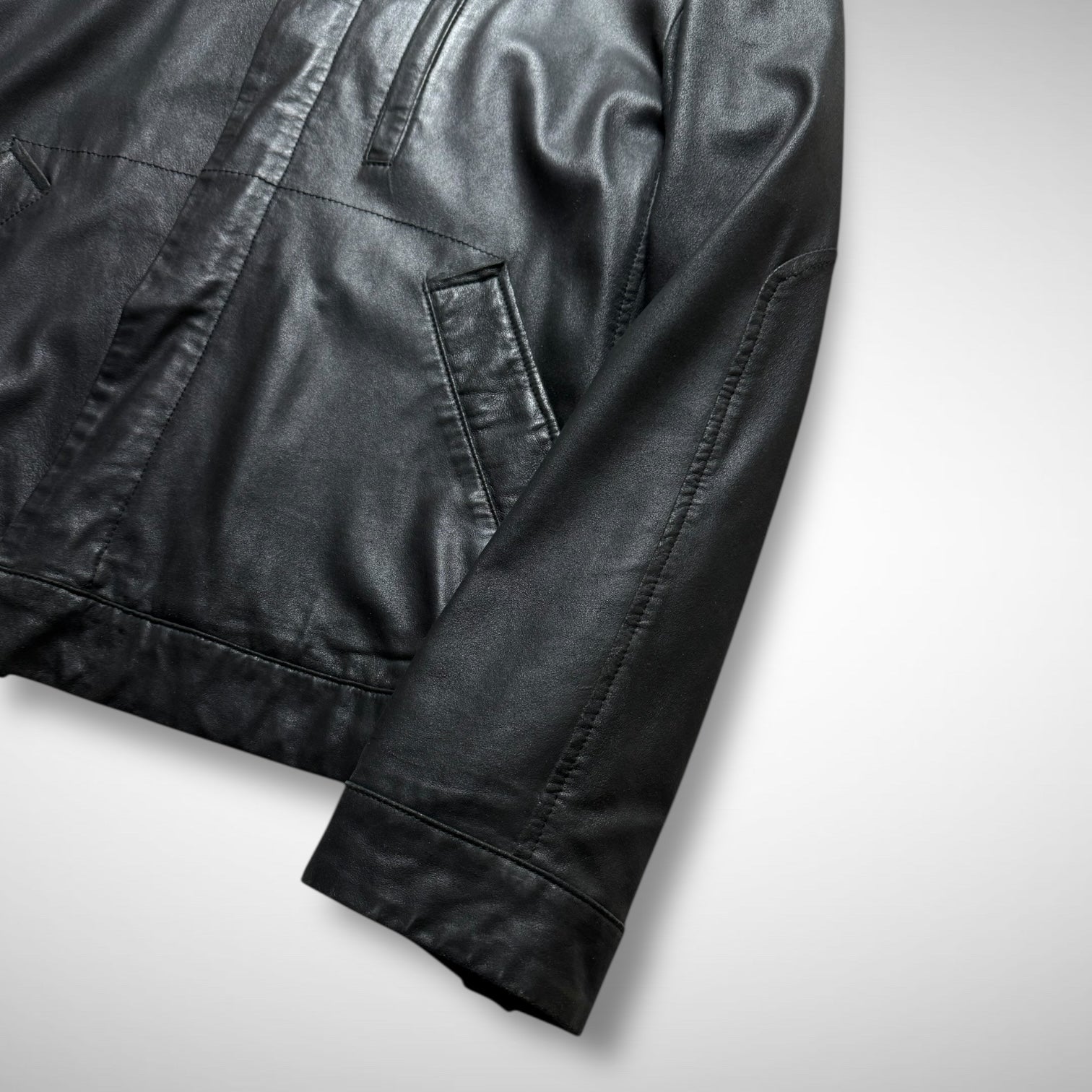 Cut from soft black leather with a clean, structured silhouette. Features a snap-button stand collar, hidden front two-way zip closure, and angled welt press-button pockets. Zipped cuffs and minimal panel detailing complete the design. Fully lined.