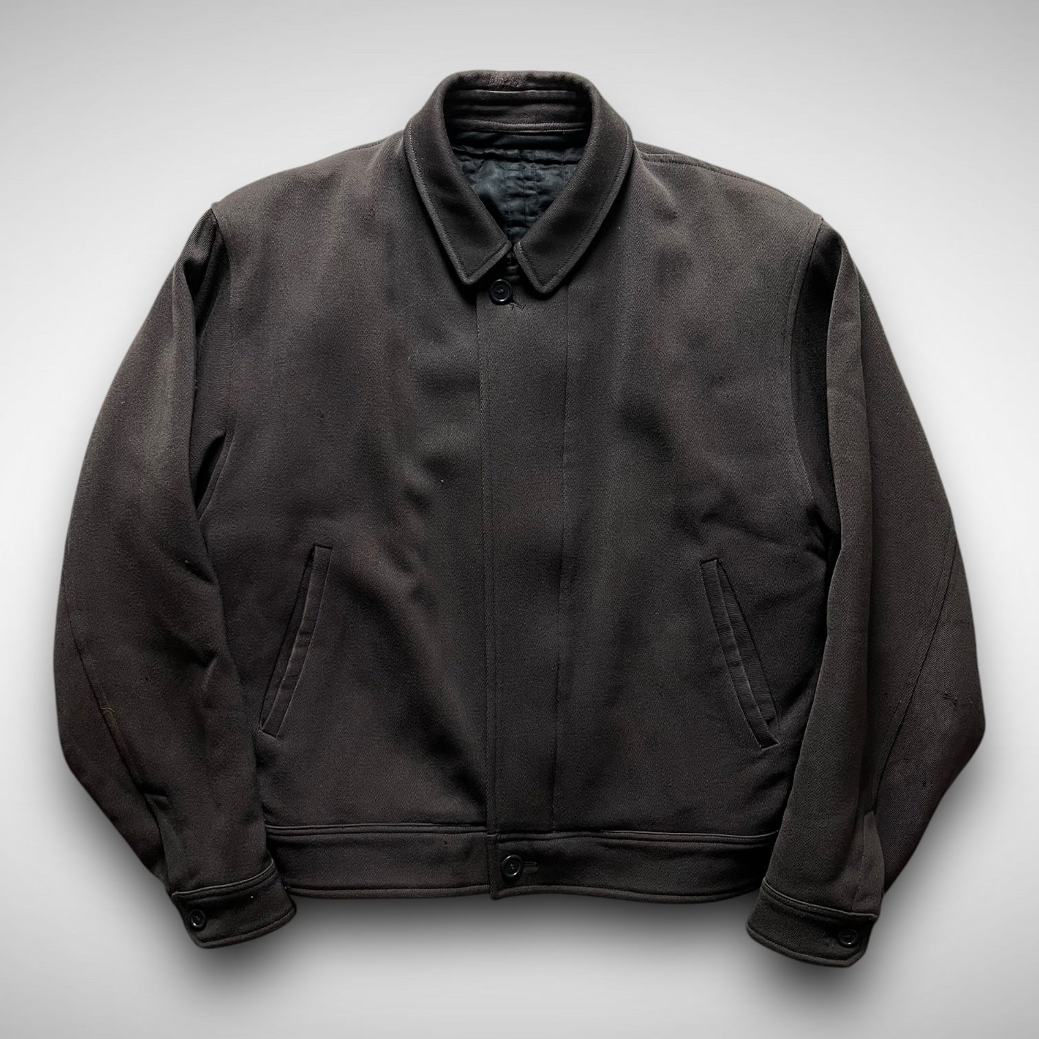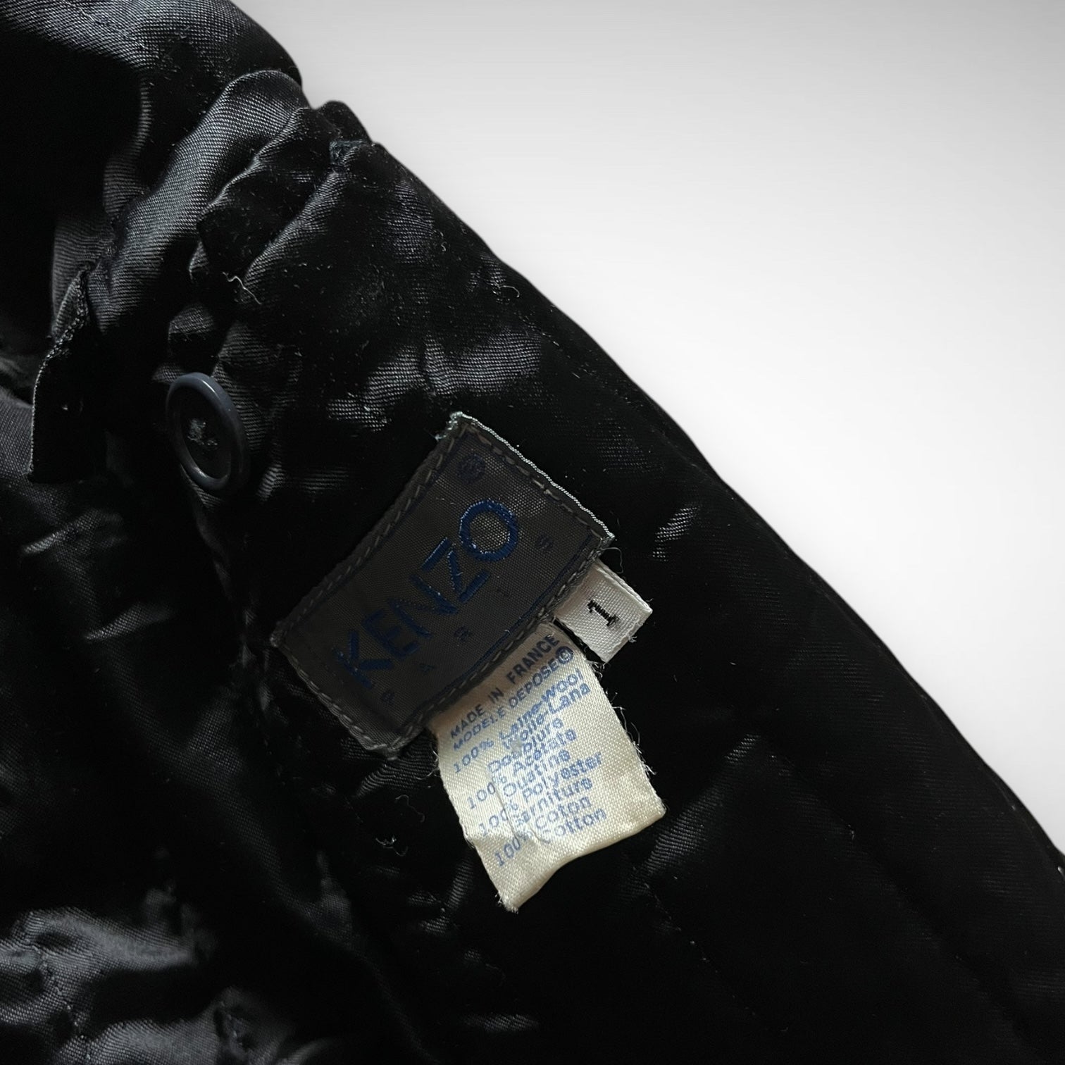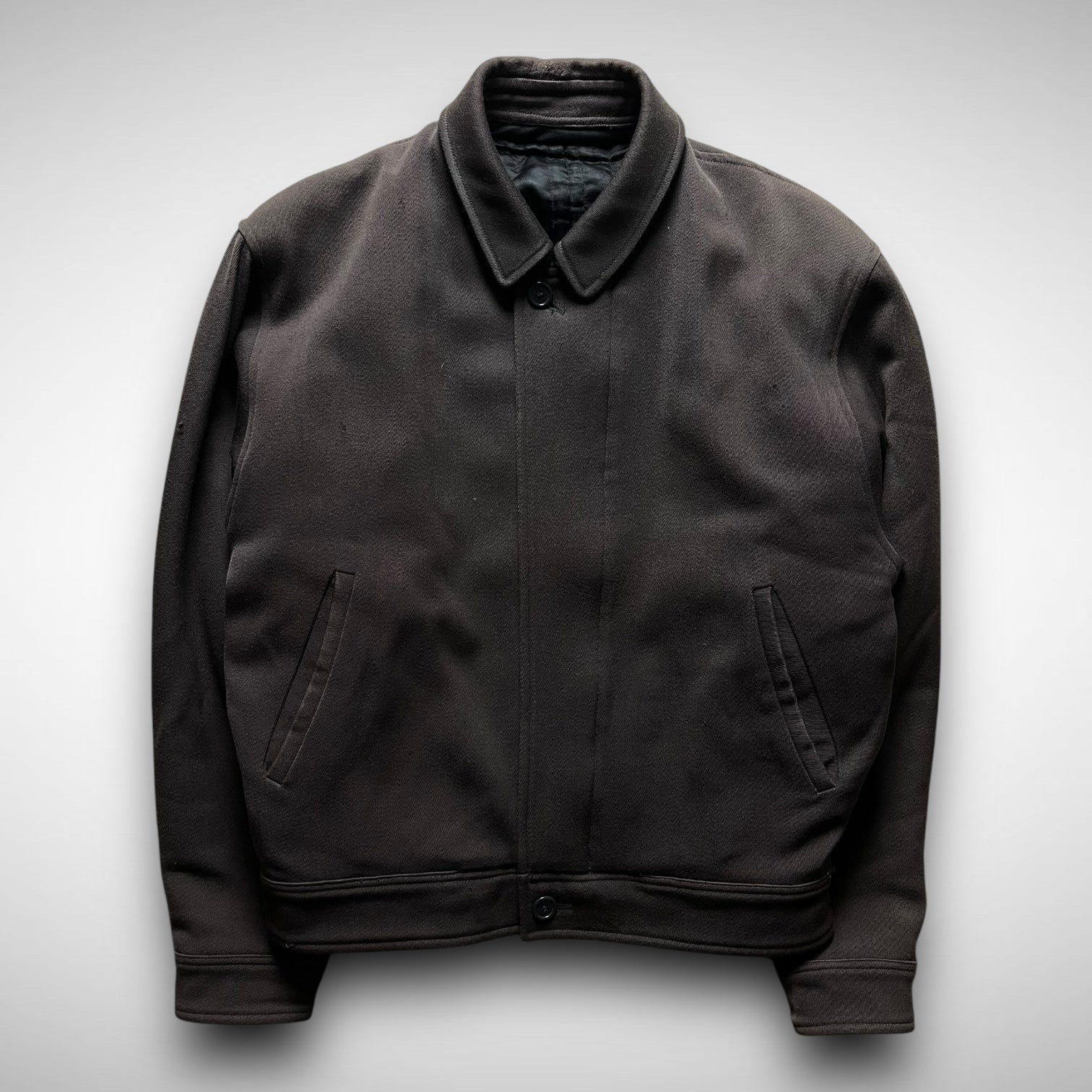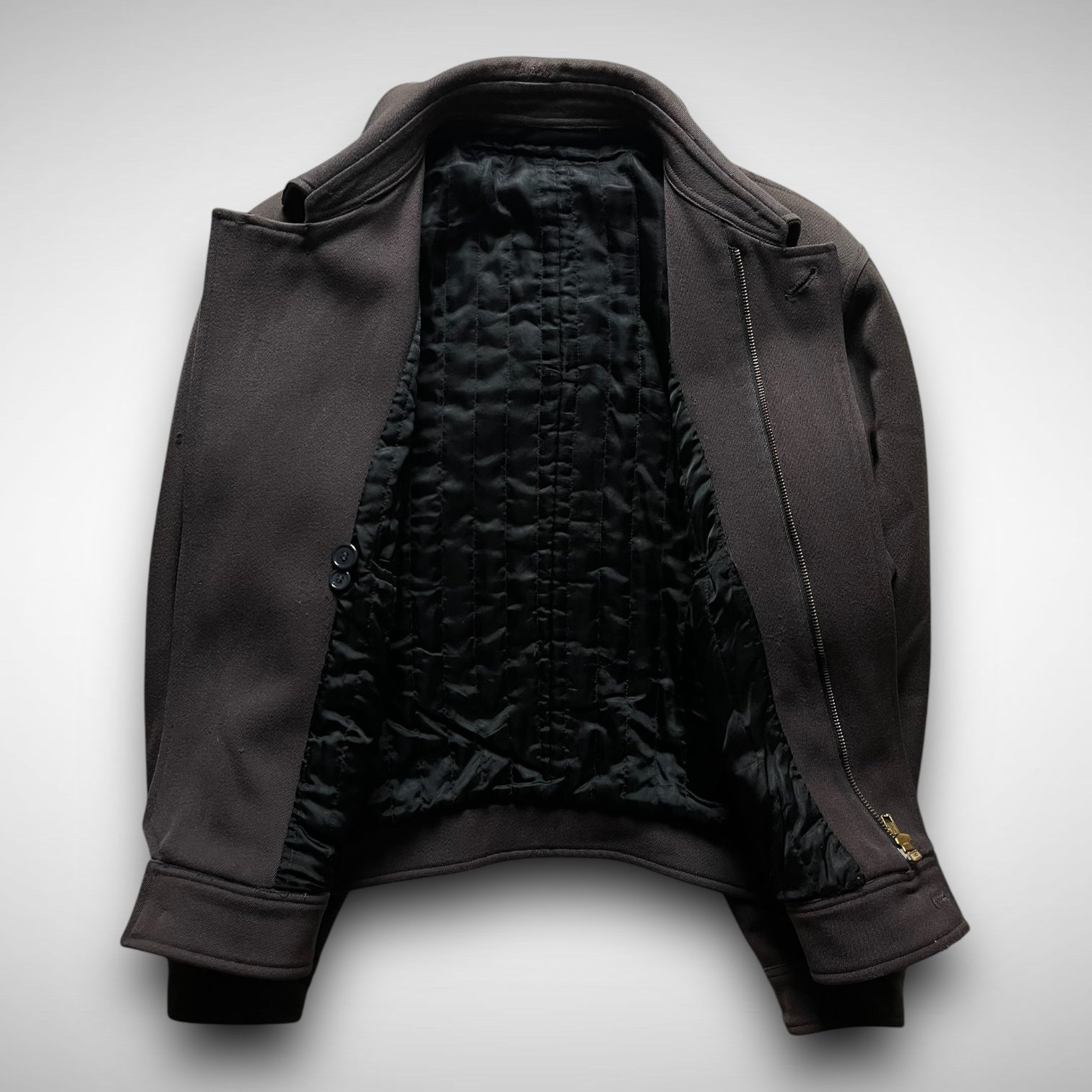This rare 1980s Kenzo Paris blouson is crafted in France from a shimmering fine brown wool. It features a cropped silhouette and slim waist with a concealed zip and button front, slanted welt pockets, and a quilted lining composed of acetate, polyester, and cotton for comfort and structure. A minimalist, utilitarian classic with timeless edge.