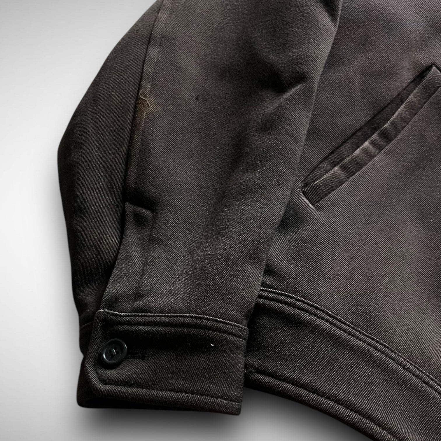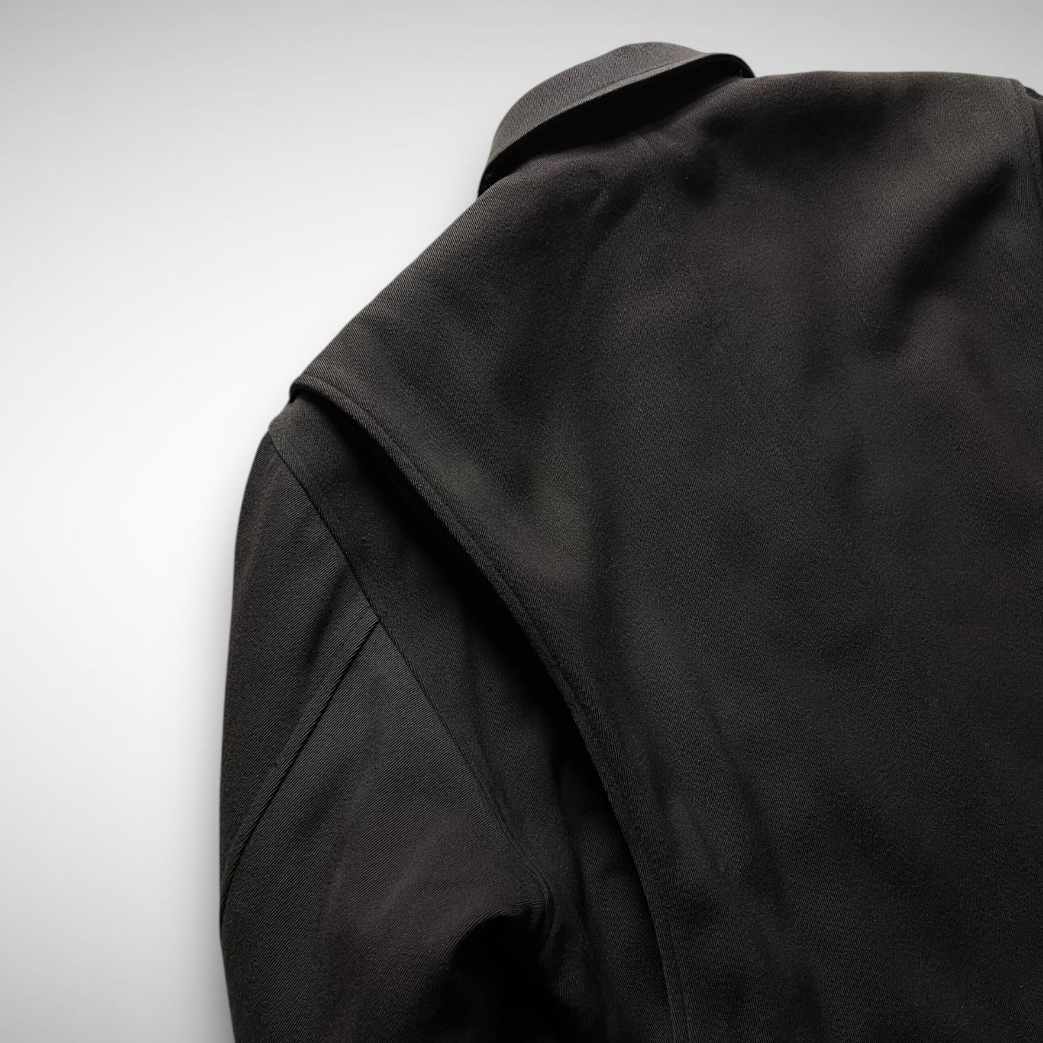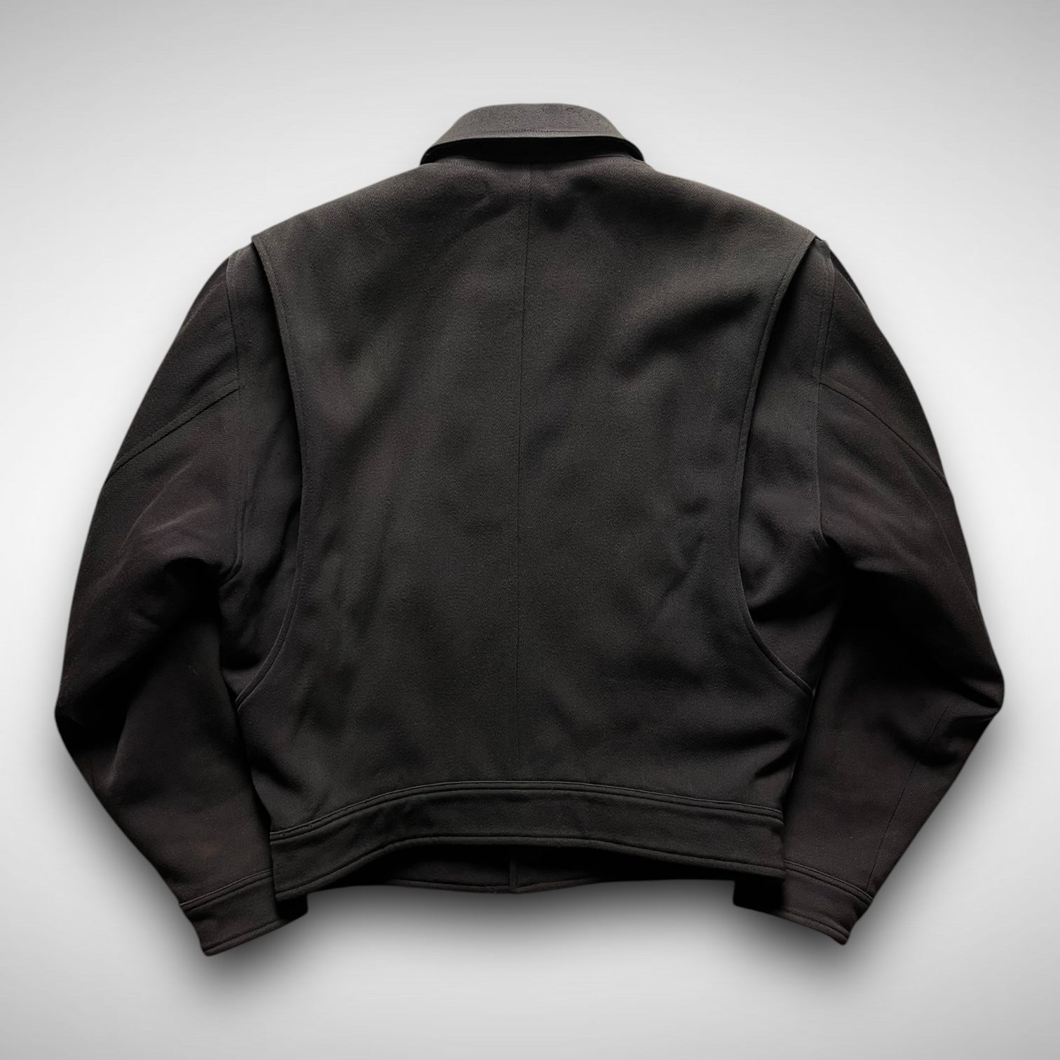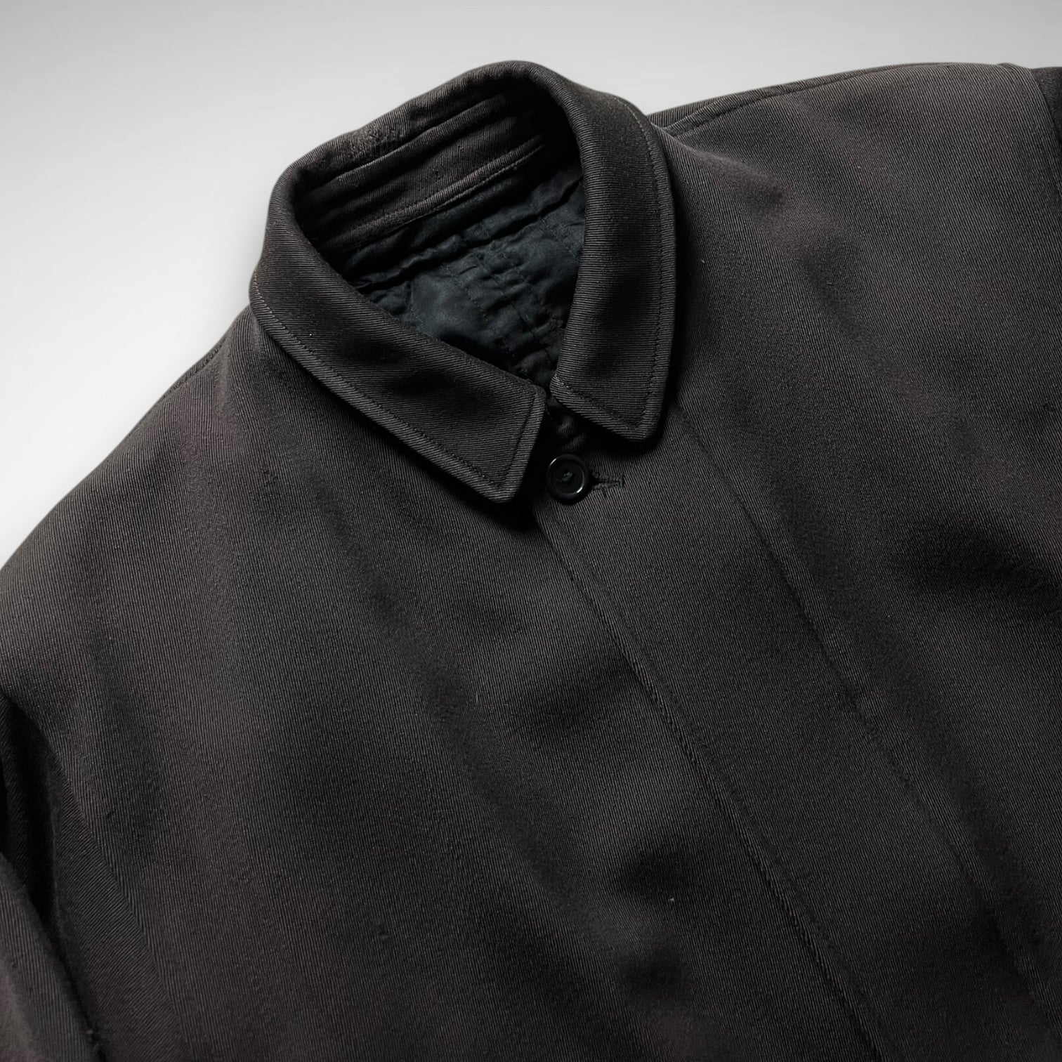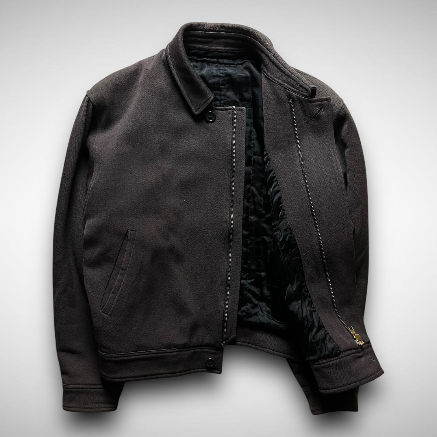 This rare 1980s Kenzo Paris blouson is crafted in France from a shimmering fine brown wool. It features a cropped silhouette and slim waist with a concealed zip and button front, slanted welt pockets, and a quilted lining composed of acetate, polyester, and cotton for comfort and structure. A minimalist, utilitarian classic with timeless edge.