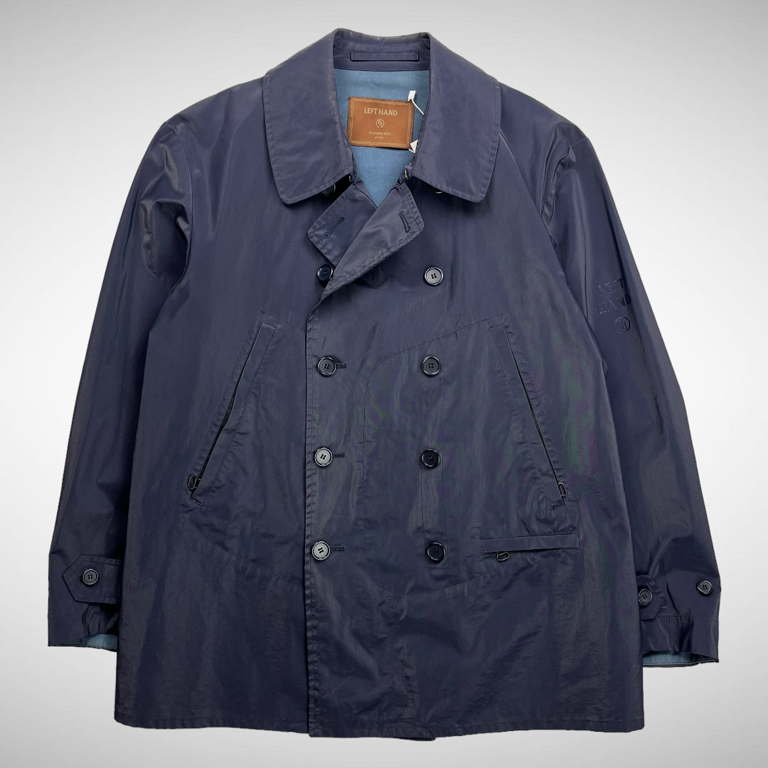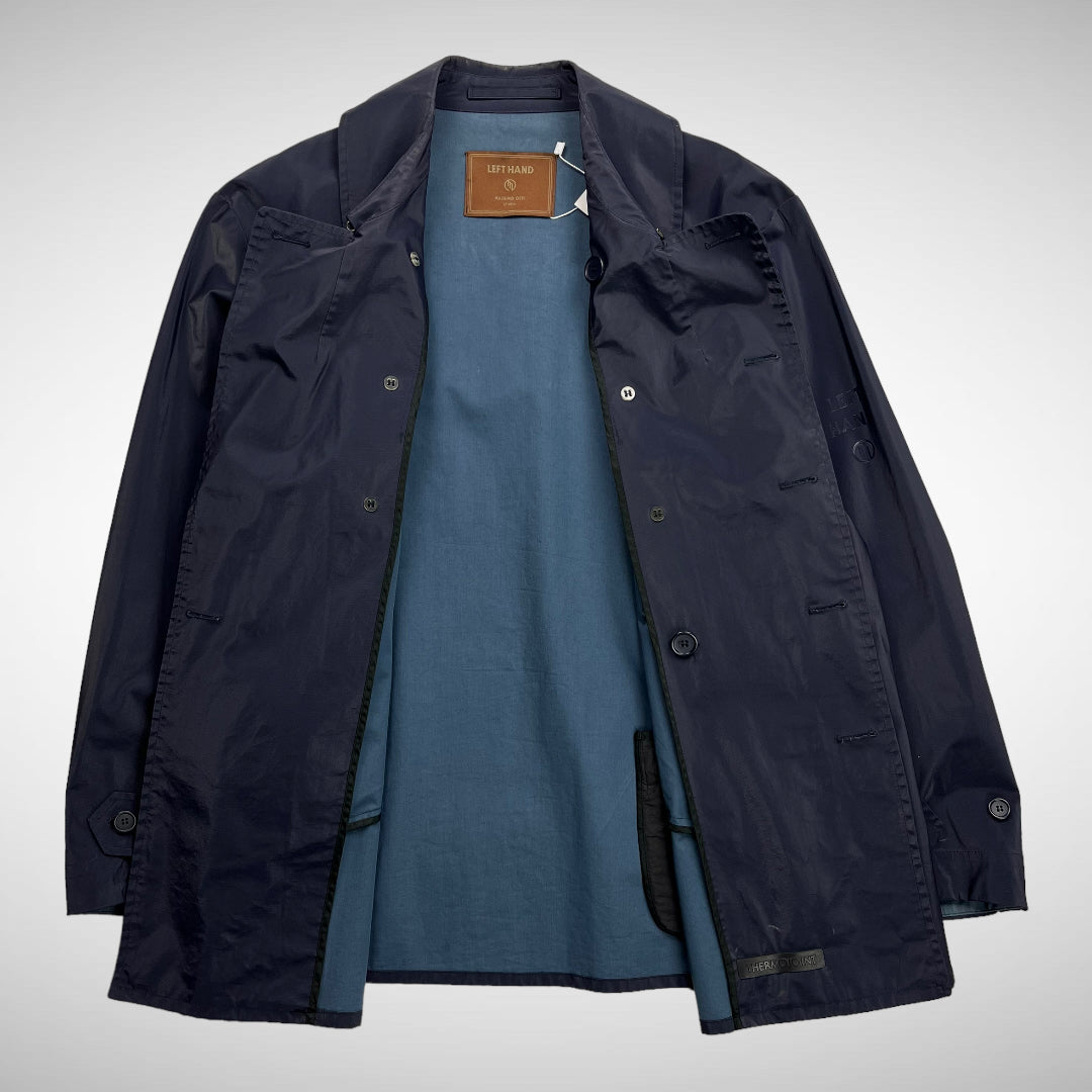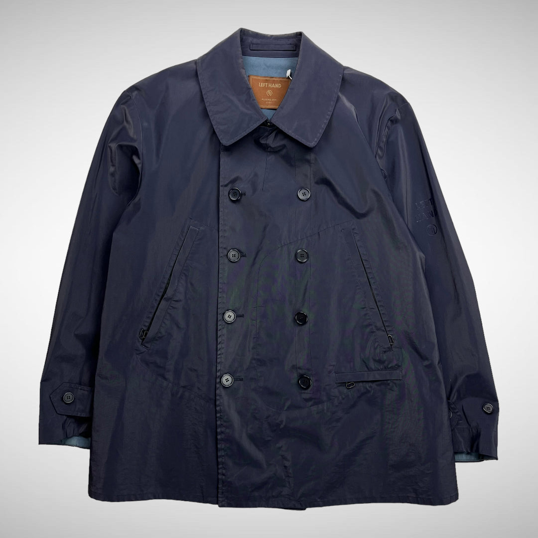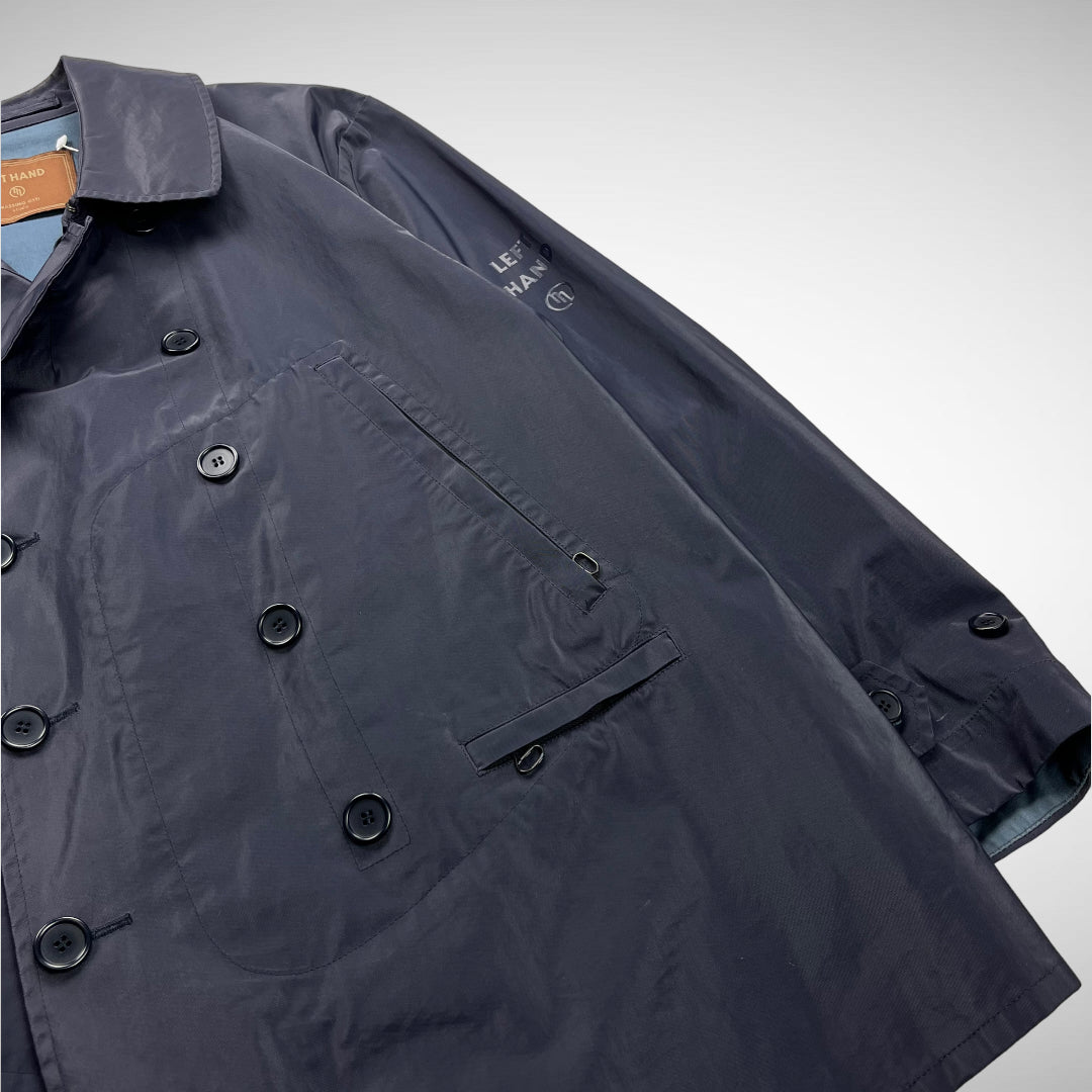 Double breasted button-up closure with additional clip to secure collar, slide entry handwarmer pockets and small zip-pocket, Left Hand heat pressed logo on left sleeve, button adjustable cuffs, arm-pit vents and blue interior.