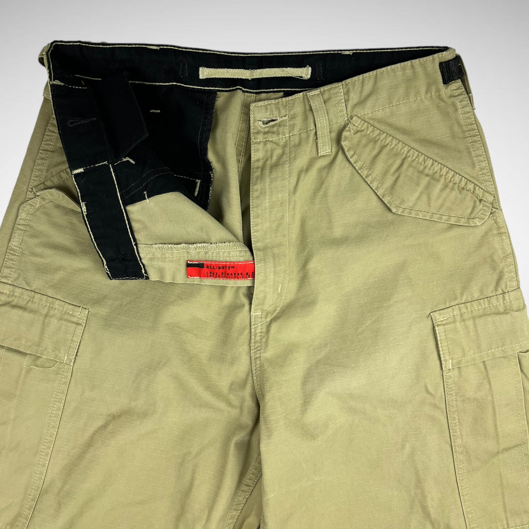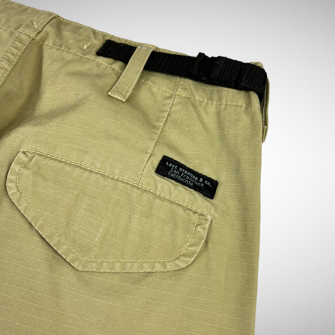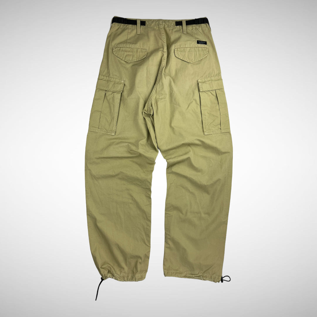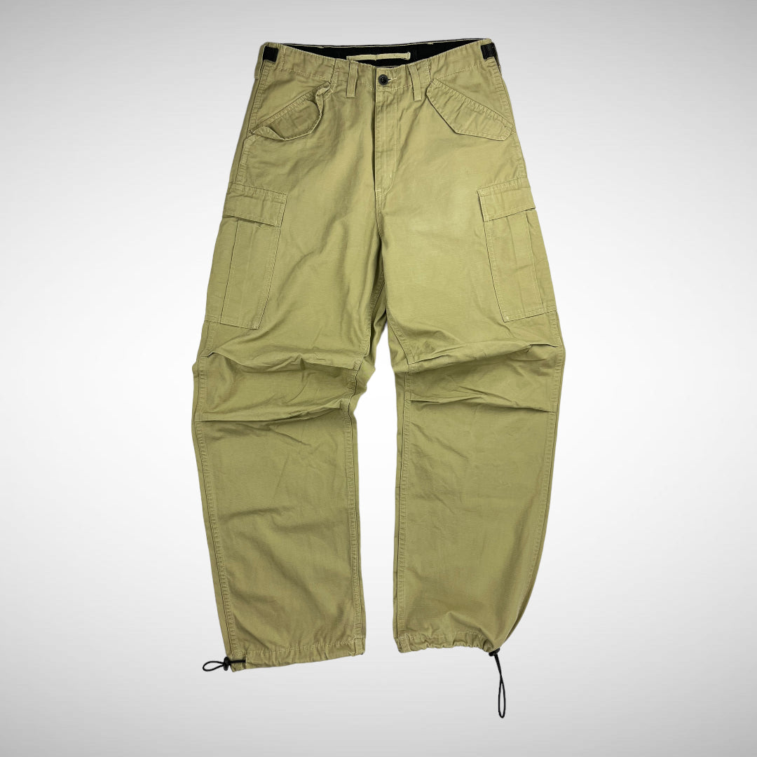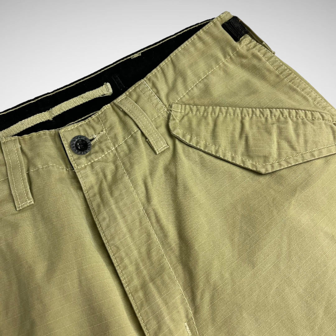 Light green ripstop featuring cargo pockets, flap and snap fastening pockets, woven cotton adjustable waist-belt on both sides, articulated knees, elastic cord adjustable ankles, and double rear flap-velcro pockets.