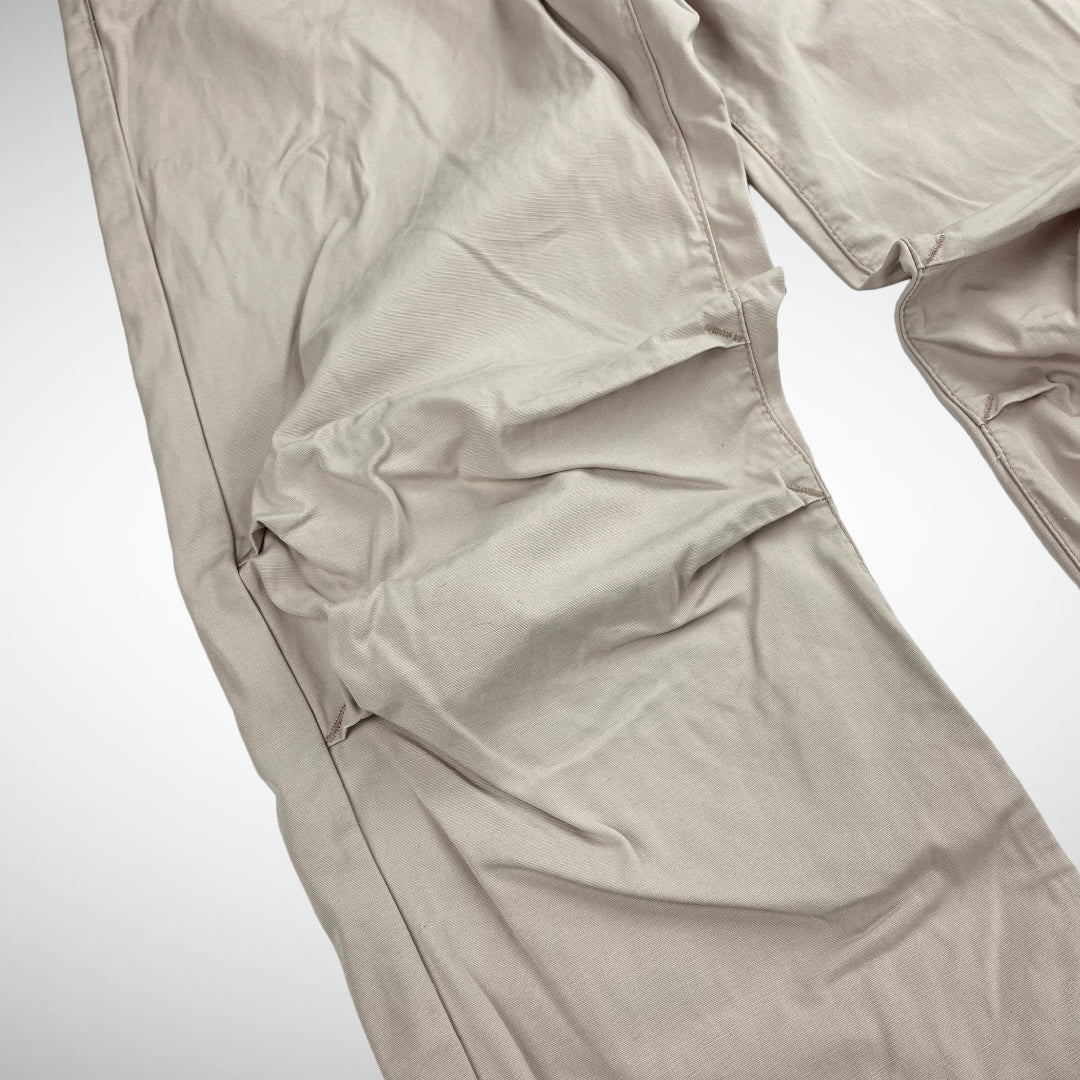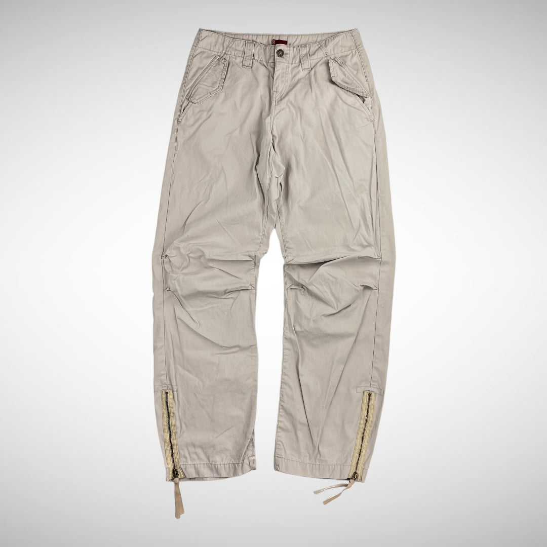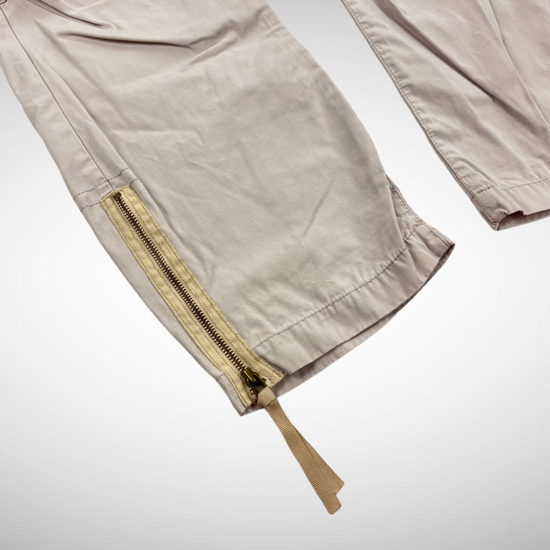 Soft pink army pants made from cotton with articulated knees, lower adjustable zips to expand fit and double press-button pockets on front and backside.