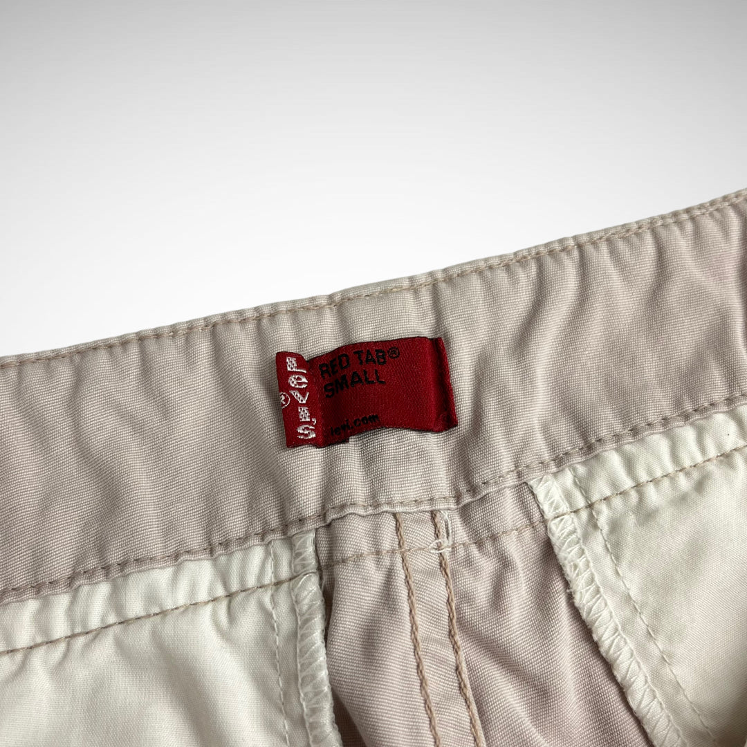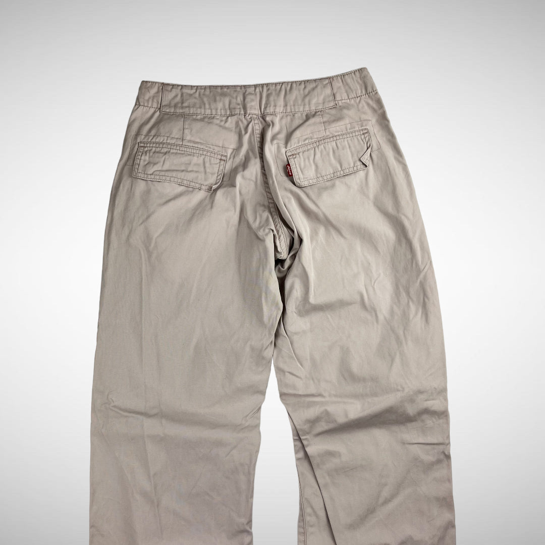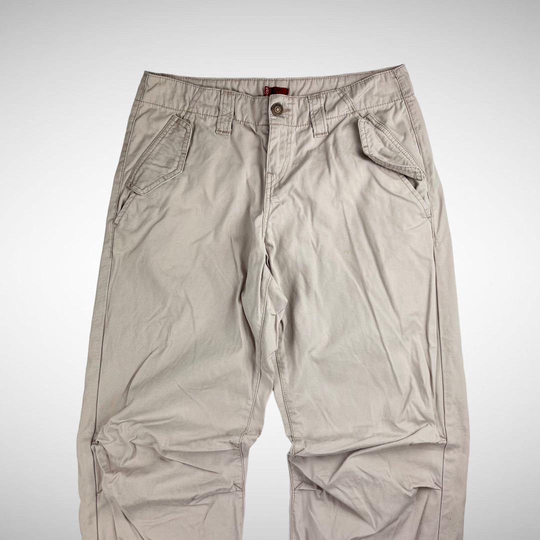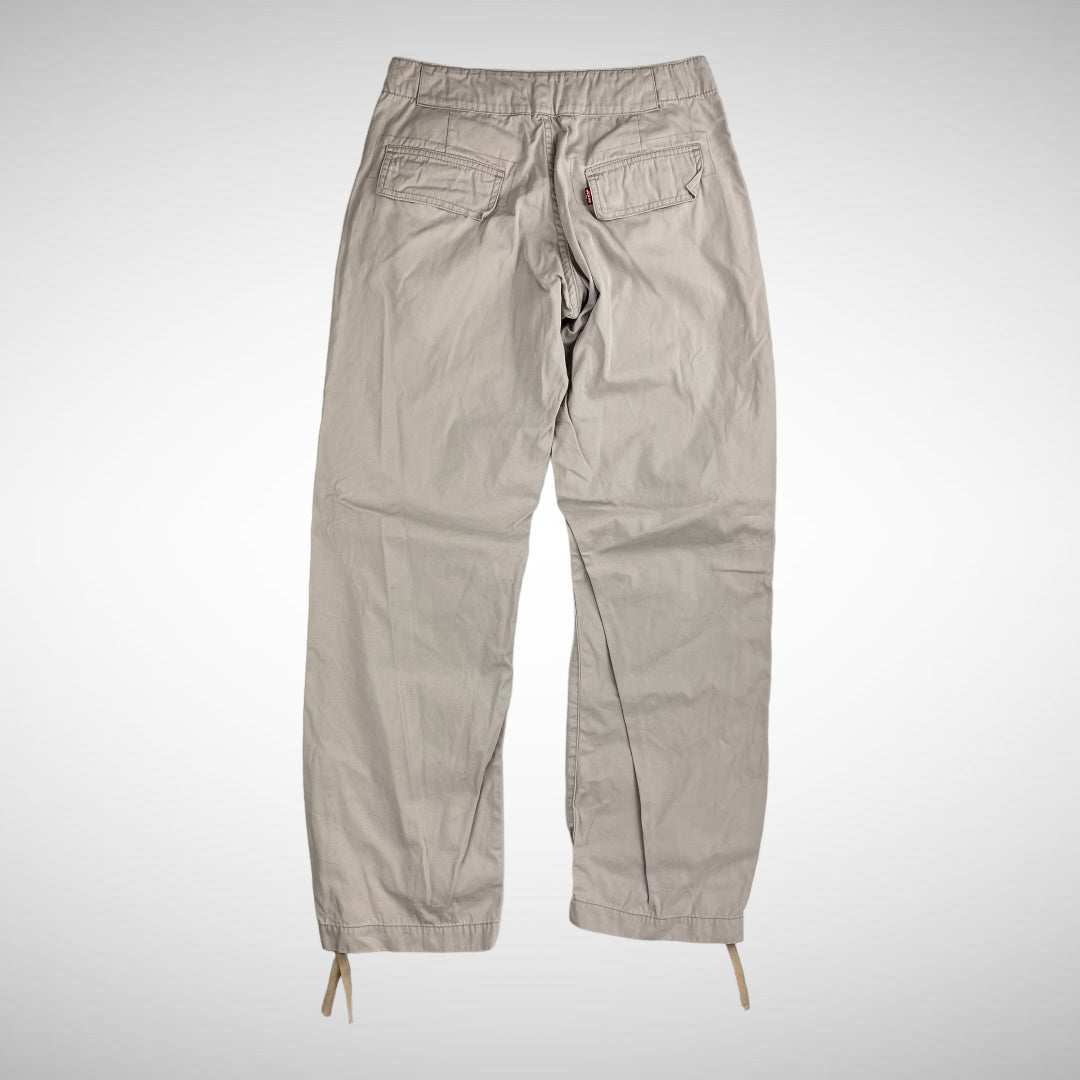 Soft pink army pants made from cotton with articulated knees, lower adjustable zips to expand fit and double press-button pockets on front and backside.