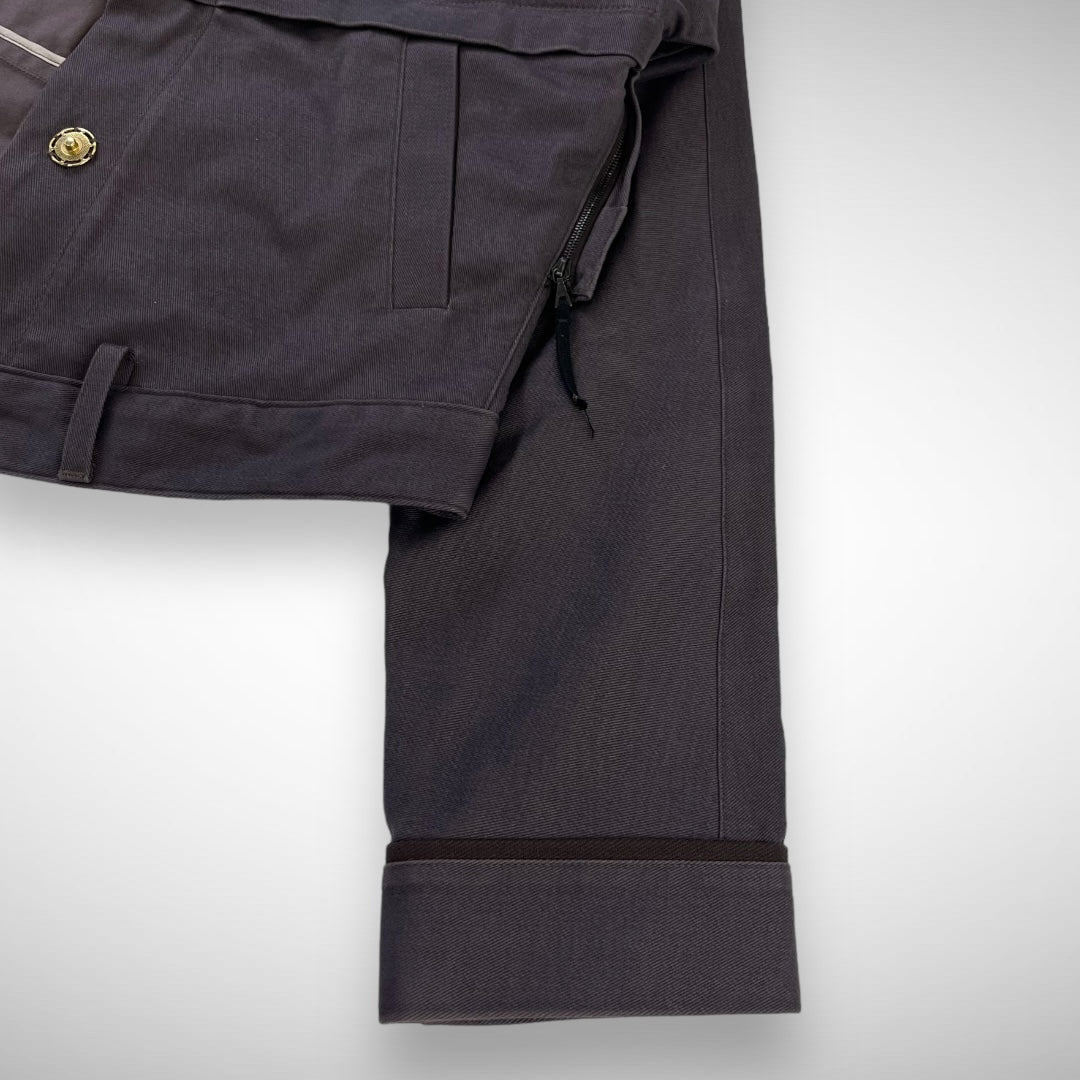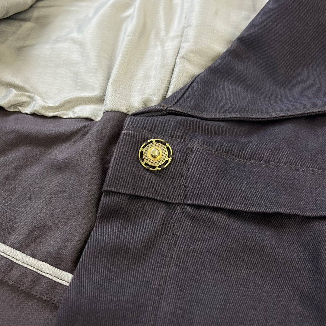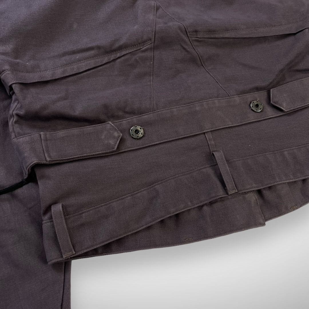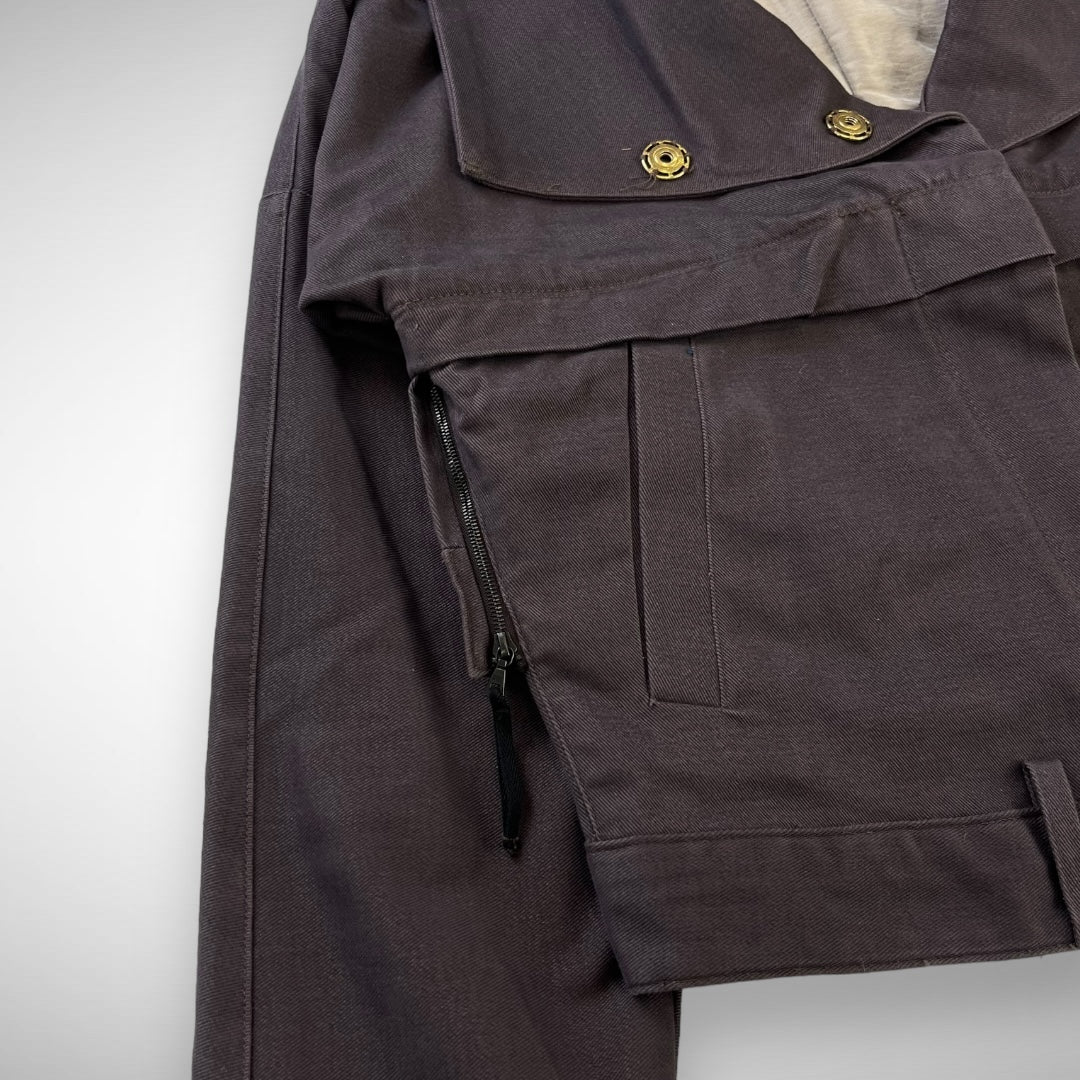 Beautiful dark purple toned cotton jacket with cropped fit featuring two slide-entry pockets, side-zips to adjust fit, press-button closure and adjustable collar, belt loops, articulated panels along the shoulder, top section and back-side to ensure a perfect fit, and press-button adjustable belts.