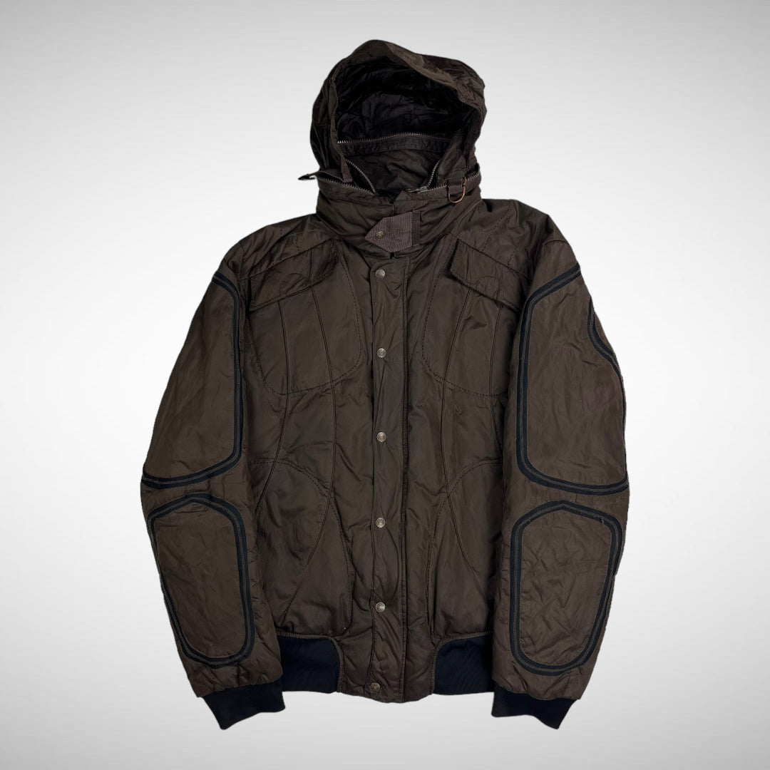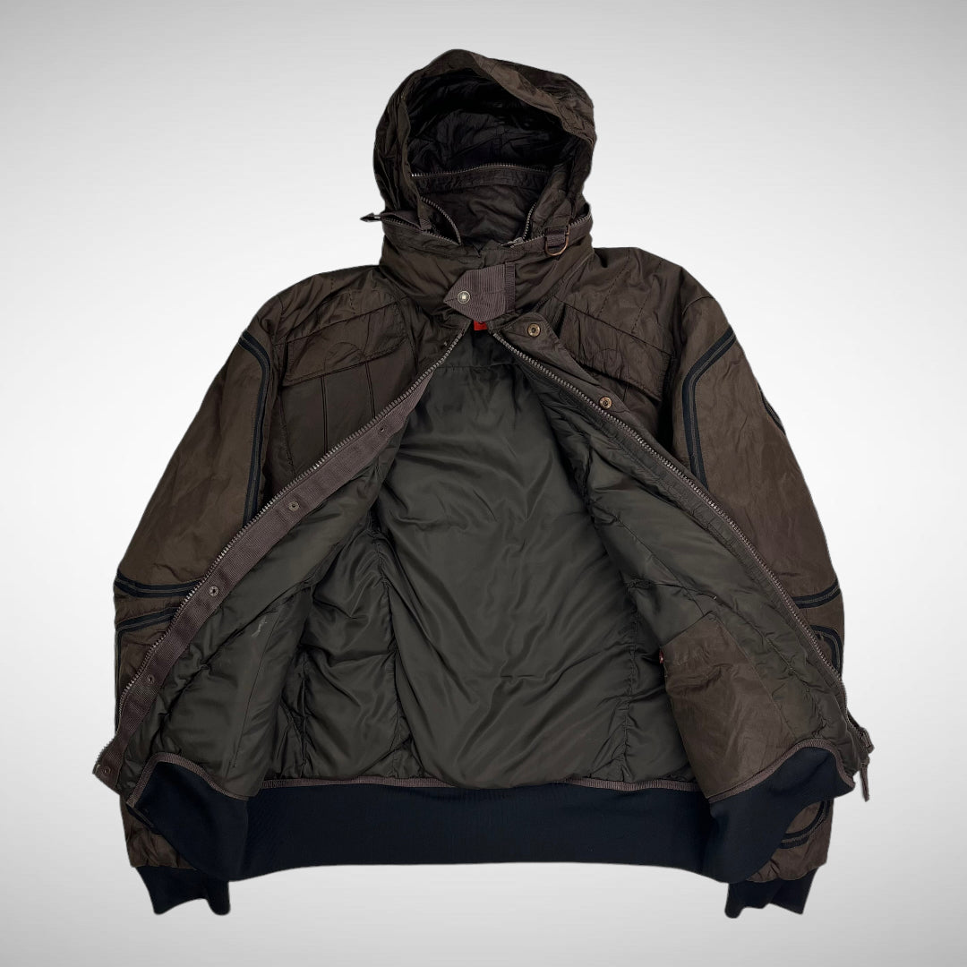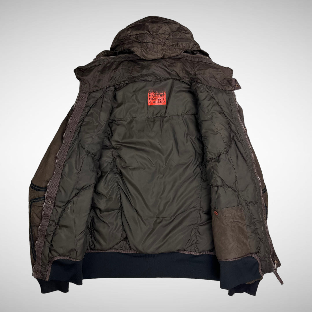 Brown nylon metal outer with detailed stretch nylon and stitching on arms also seen on back, articulated stitching across body, four front pockets with double upper chest flap-compartments, branded stud-press buttons and additional strap for collar, elasticated cuffs and waist, zip-foldable and adjustable hood, reversible side shows an army-green side with one pocket and red M+F Girbaud print on neck.