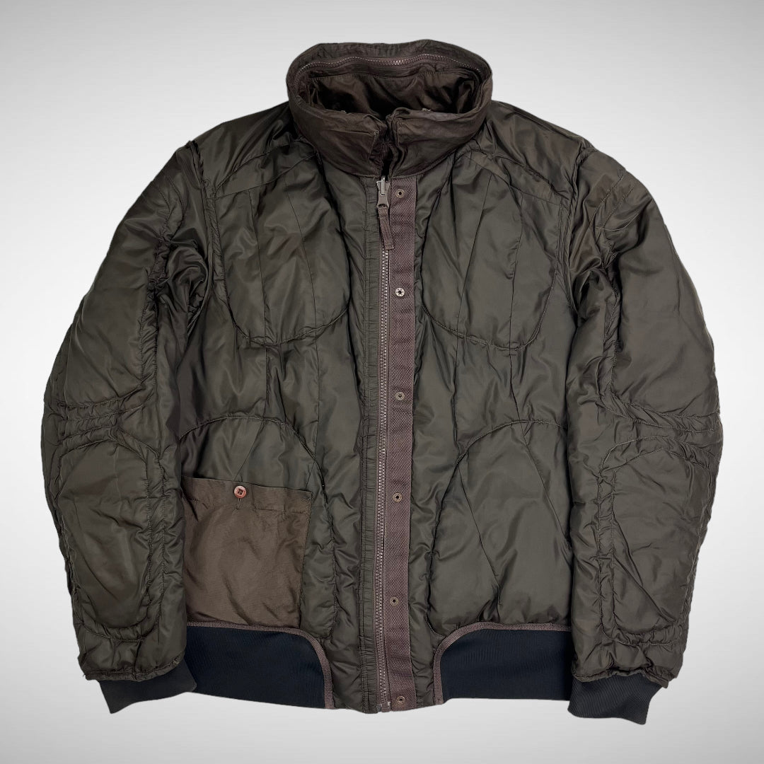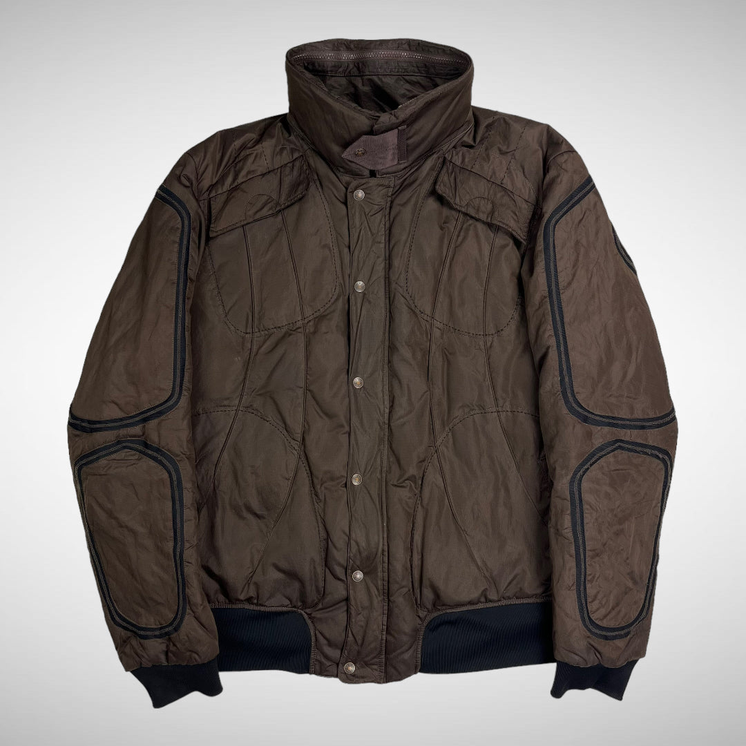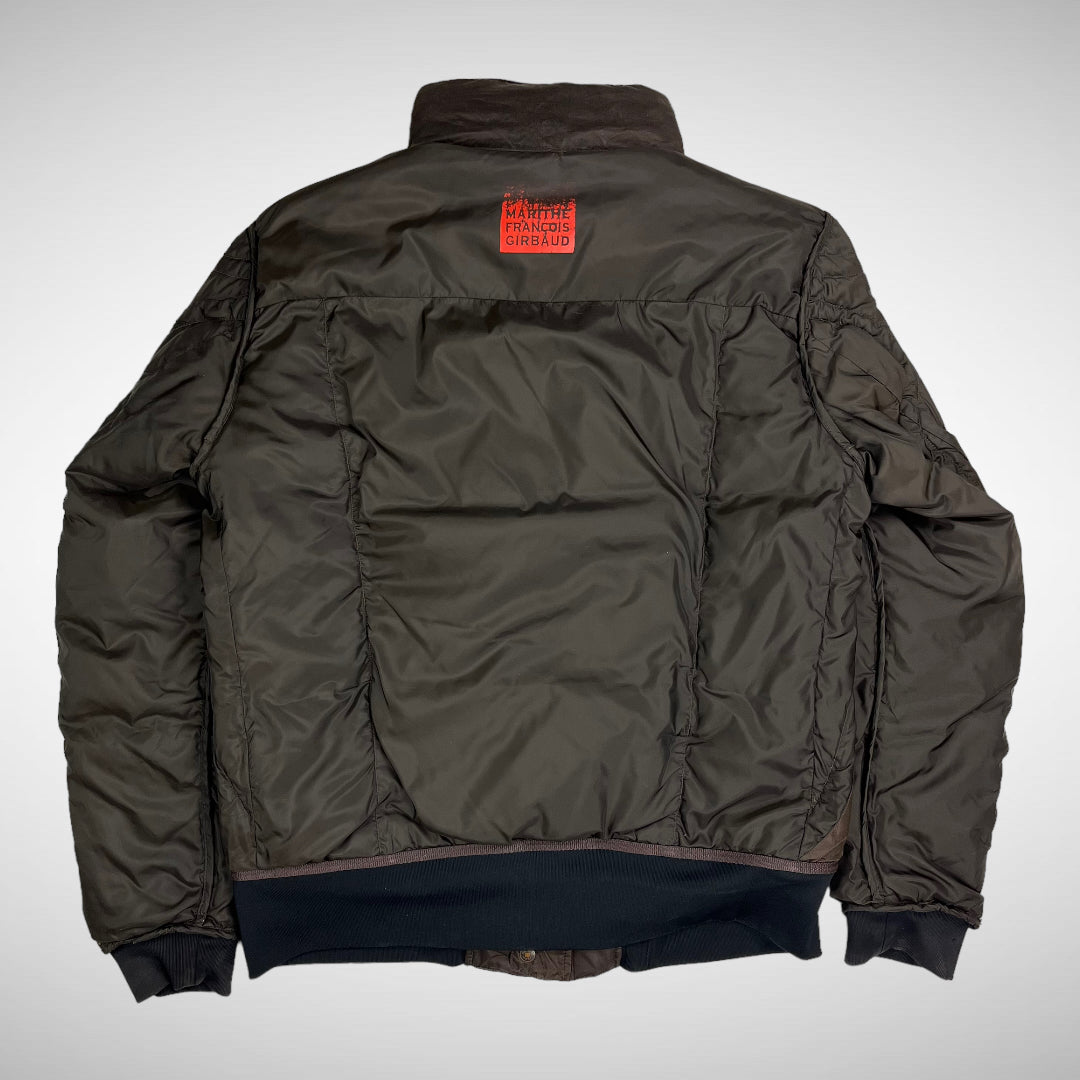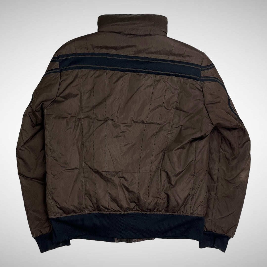 Brown nylon metal outer with detailed stretch nylon and stitching on arms also seen on back, articulated stitching across body, four front pockets with double upper chest flap-compartments, branded stud-press buttons and additional strap for collar, elasticated cuffs and waist, zip-foldable and adjustable hood, reversible side shows an army-green side with one pocket and red M+F Girbaud print on neck.