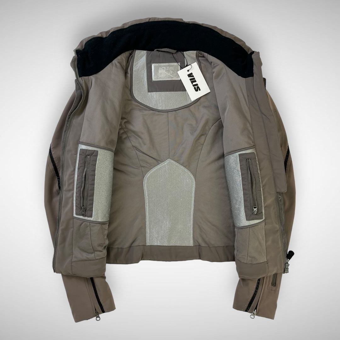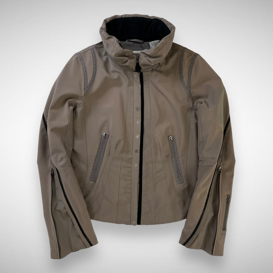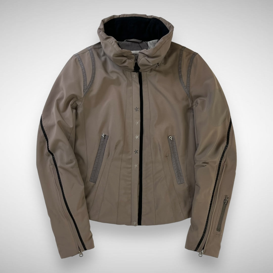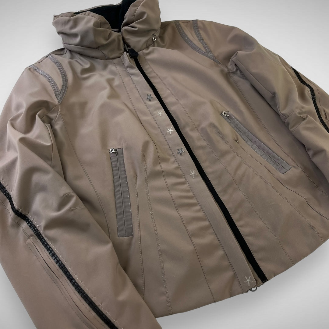 Taupe coloured softshell jacket with articulated panels in a darker tone, embroidered stars highlighted on chest which function as press-buttons, zip expandable cuffs and ski-pass pocket, two zip pockets and two stow-pockets, lightly padded lining, fleeced collar with hidden-zip hood and elastic toggle at neck to adjust opening.
