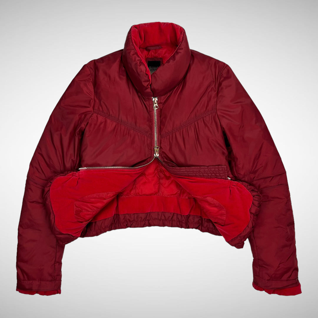 Downjacket in red featuring velvet collar, lining and slightly extended cuffs, two-way big zippers, double front flap-compartments, articulated elbows and backside, and press-button pocket on inside.