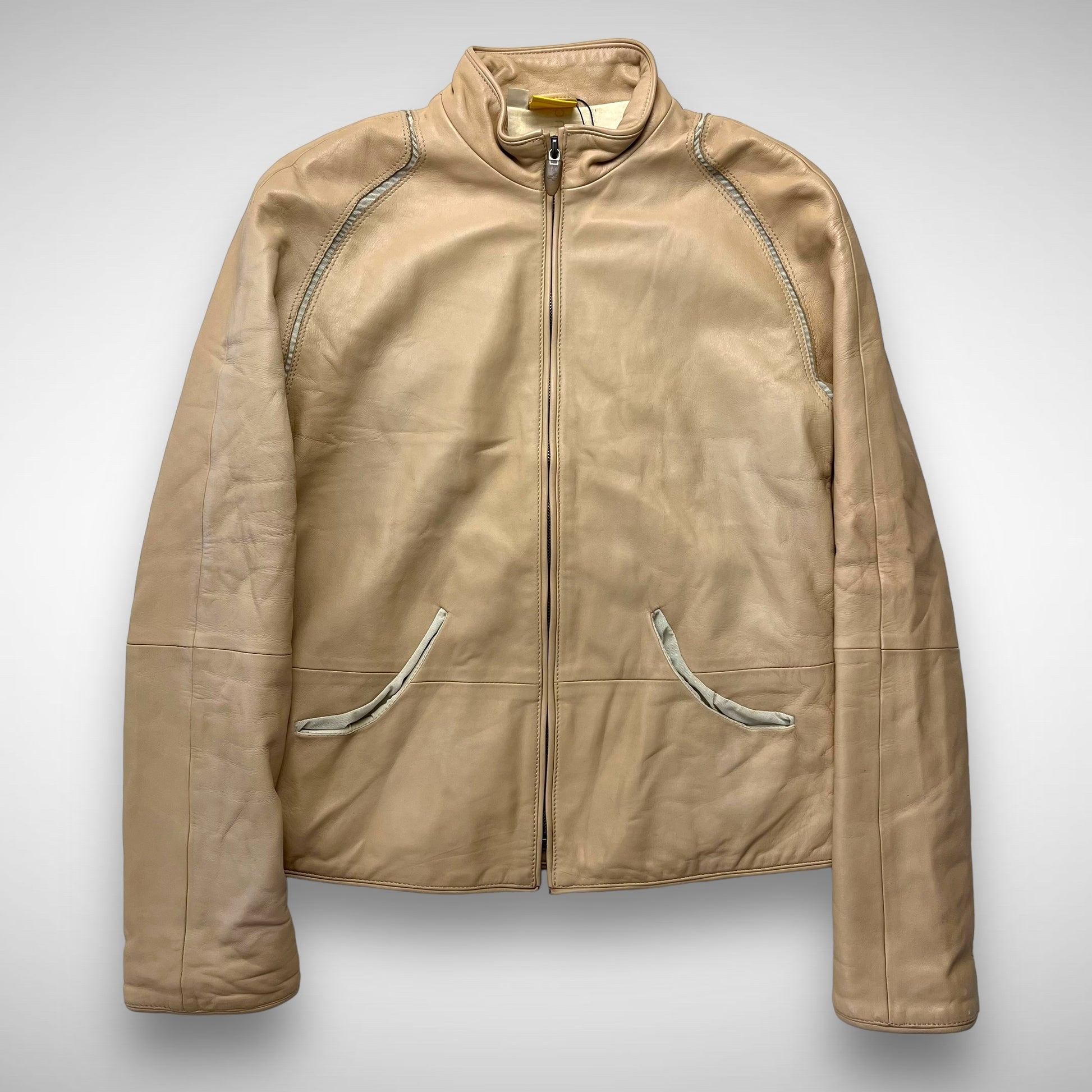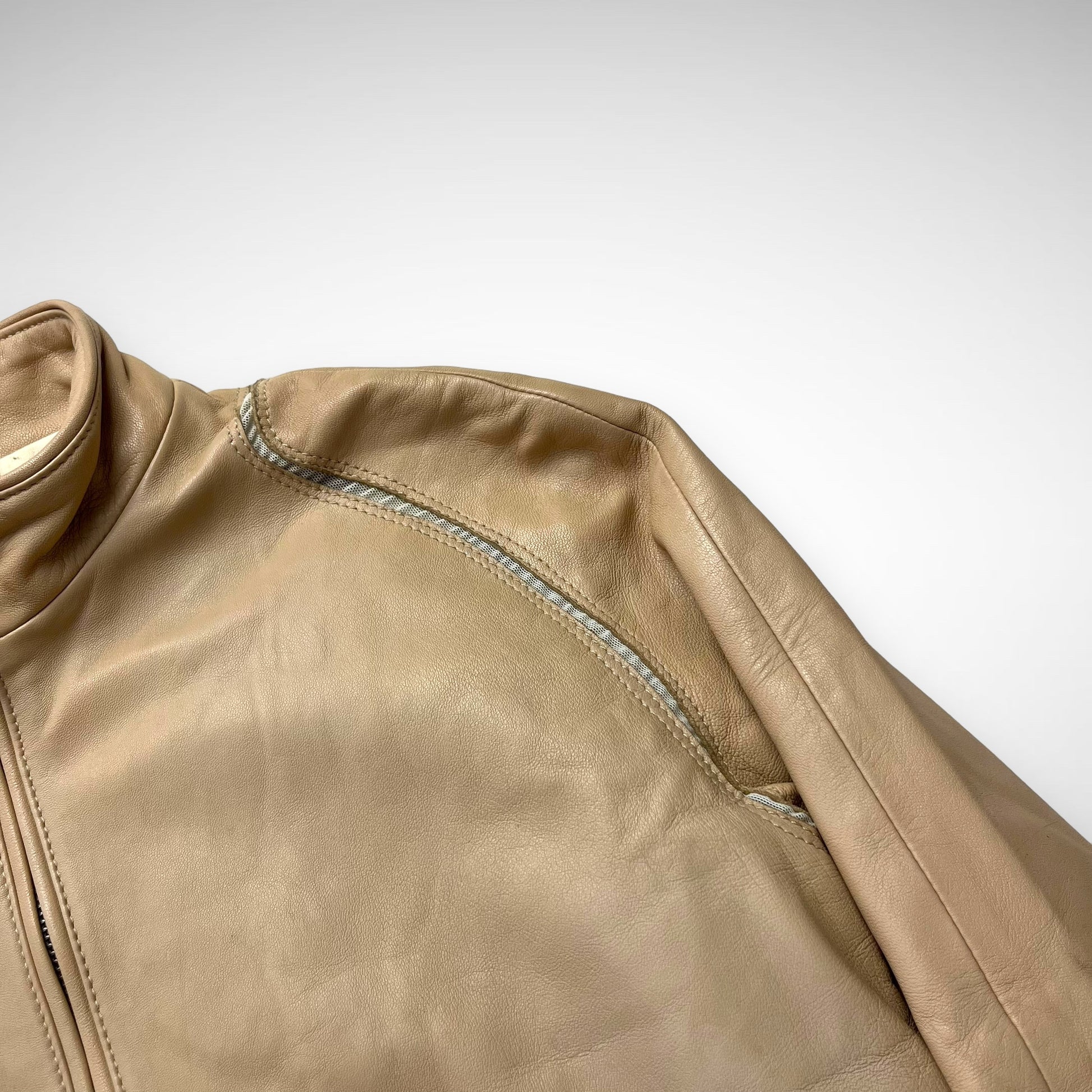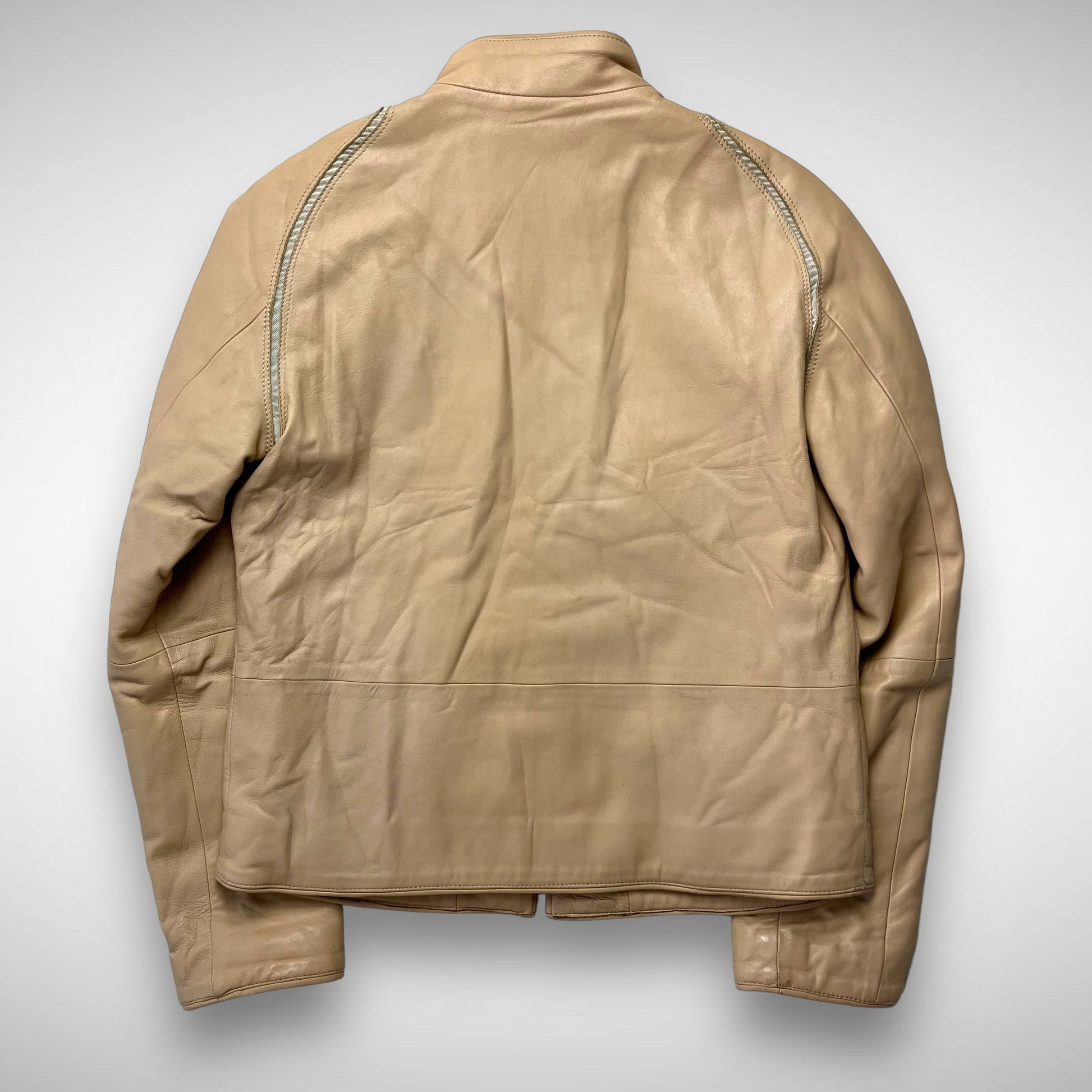 Sand coloured leather jacket with laser-cut-like pockets, mesh ventilating parts along the shoulders and arm-pits, aligned seam details across the mid section of arms and body, branded zip-pull and script lining.