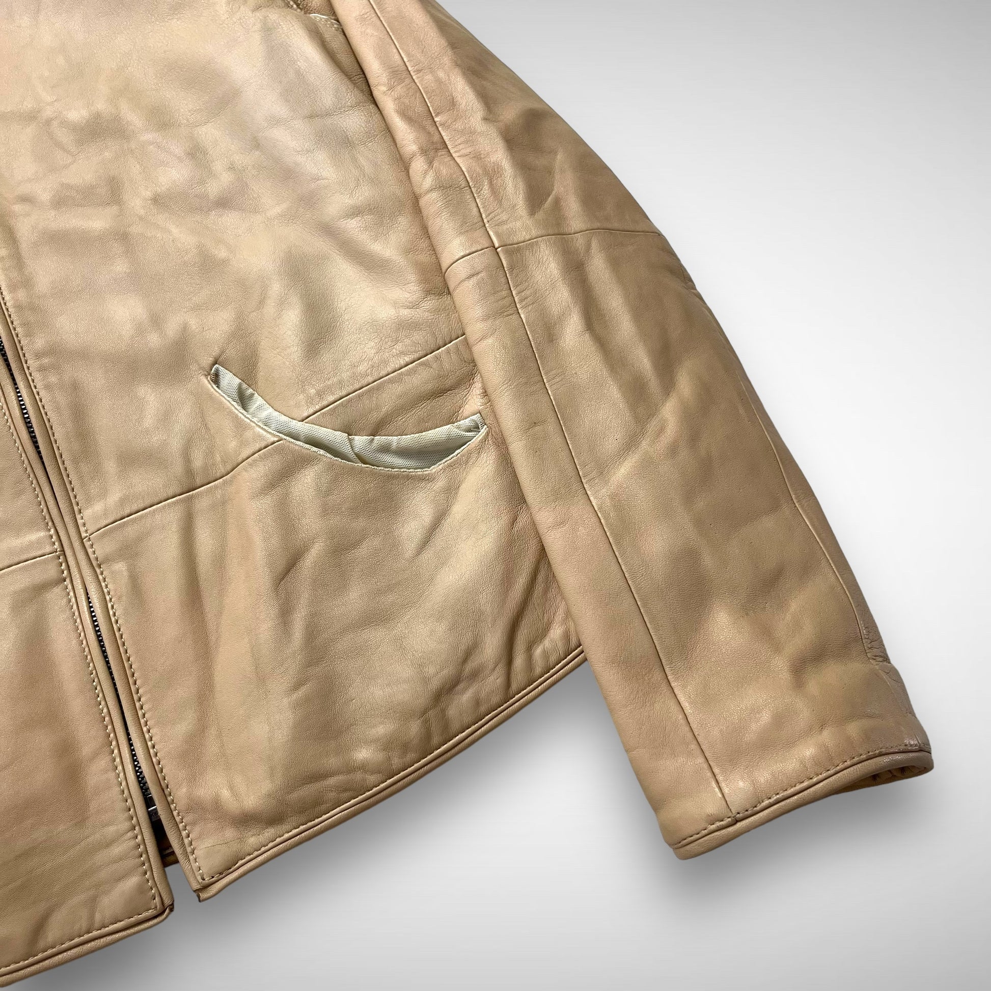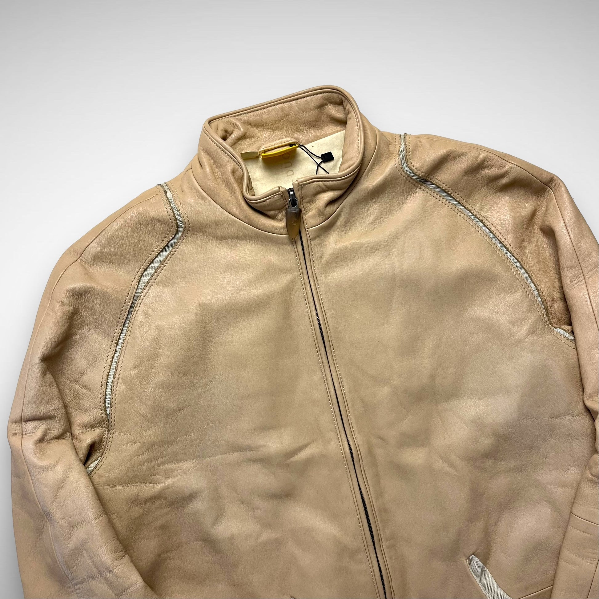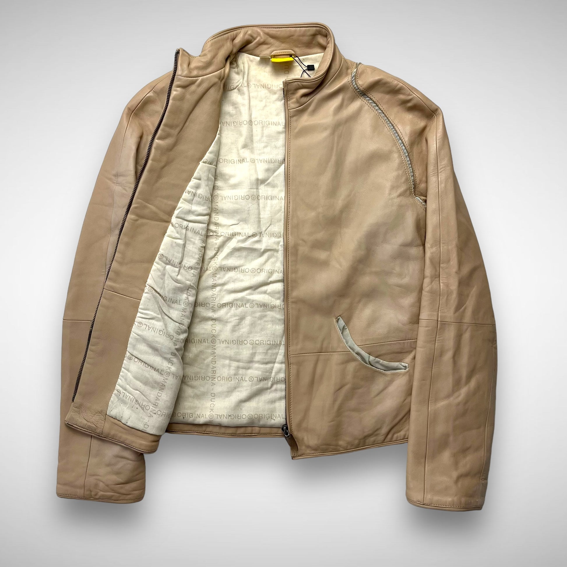 Sand coloured leather jacket with laser-cut-like pockets, mesh ventilating parts along the shoulders and arm-pits, aligned seam details across the mid section of arms and body, branded zip-pull and script lining.