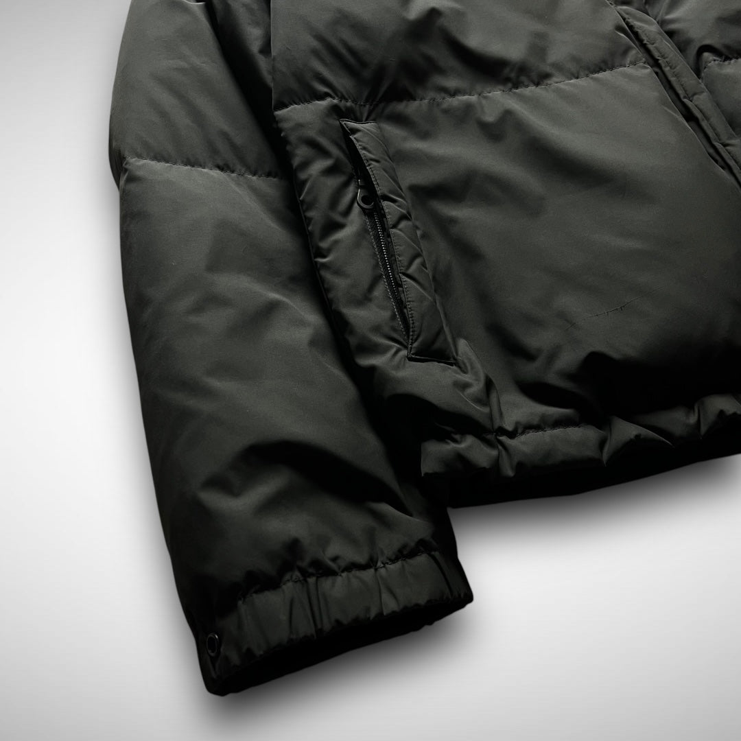 Made in Austria in a brown color shimmering towards green in light, double press-button at the collar and a single at the hem, two-way zip with rubber branded pull, double zip pockets, minimal branding at lower left body with yellow tab and button-adjustable cuffs.