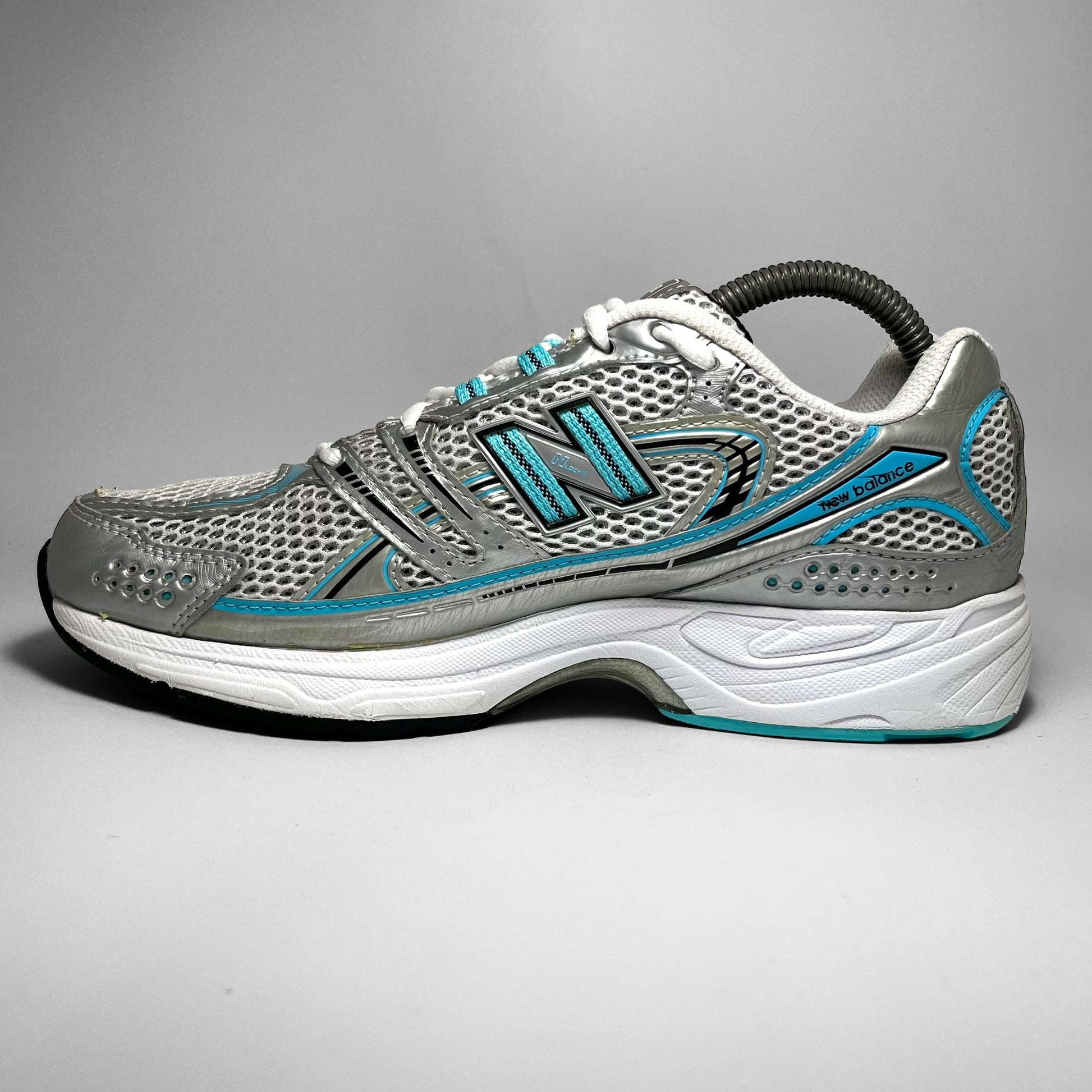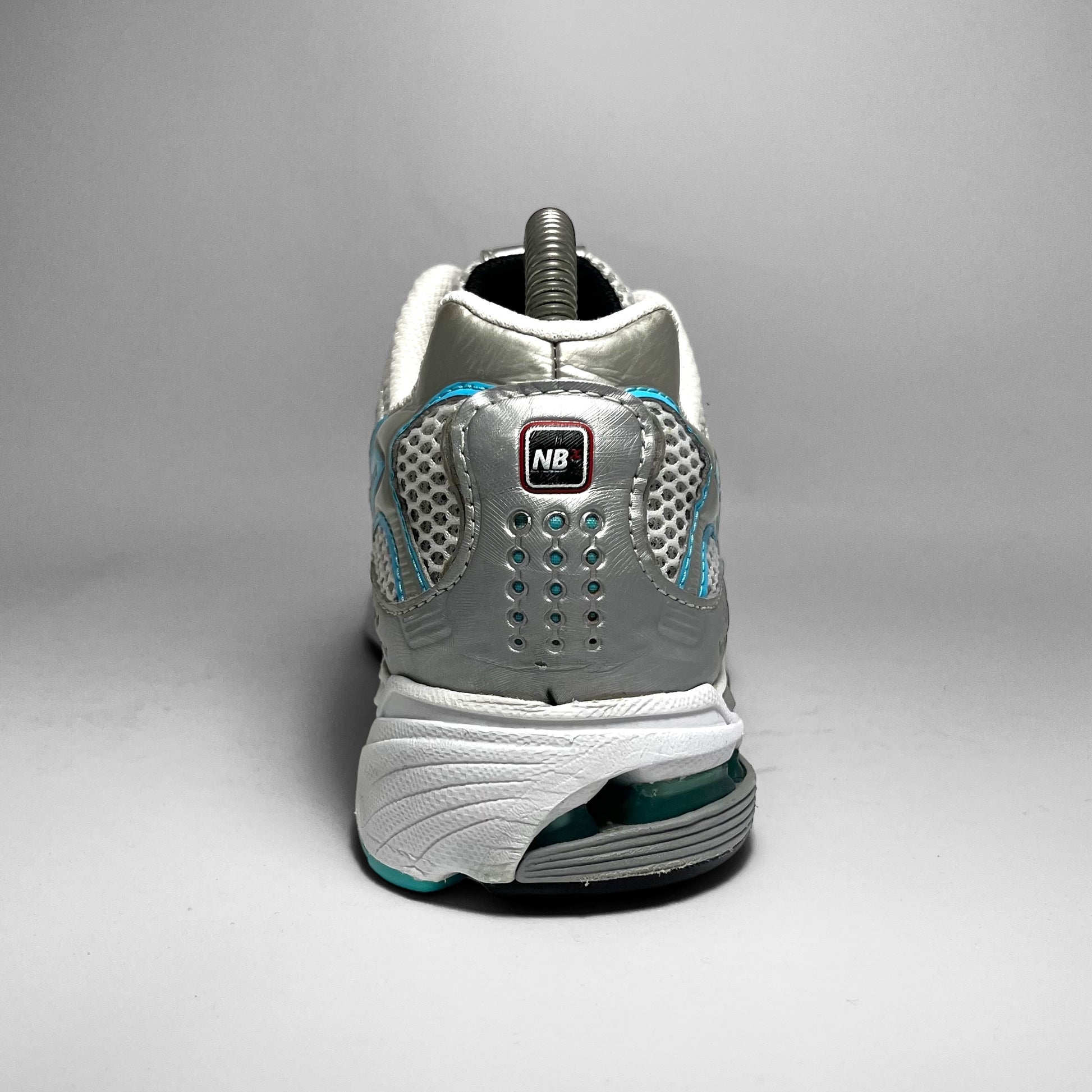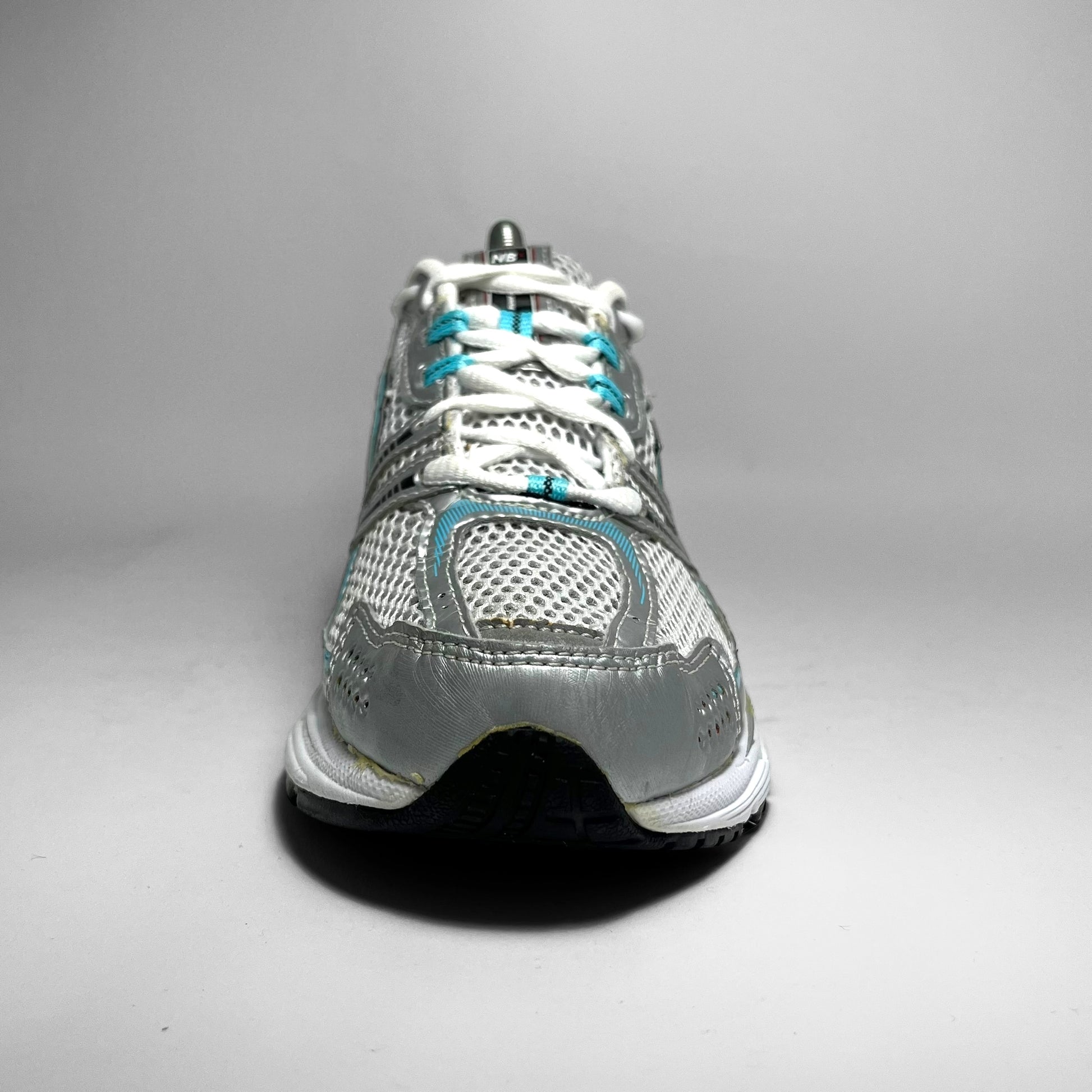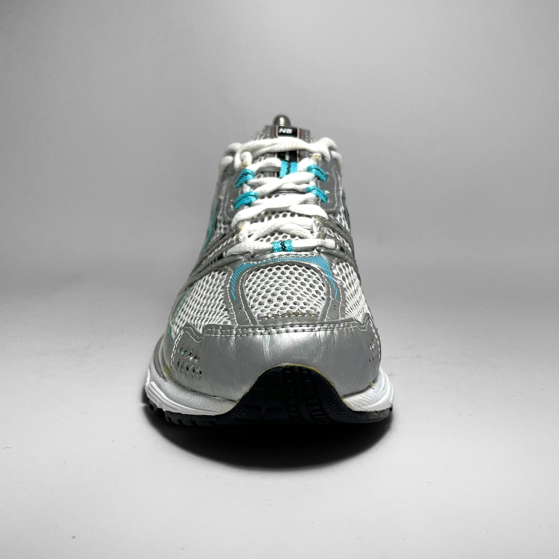 Double layered white mesh base with silver leather perforated panels, hints of aqua blue print details, woven cotton New Balance logo, eyelets and stitching throughout in combination with black details on the upper.
