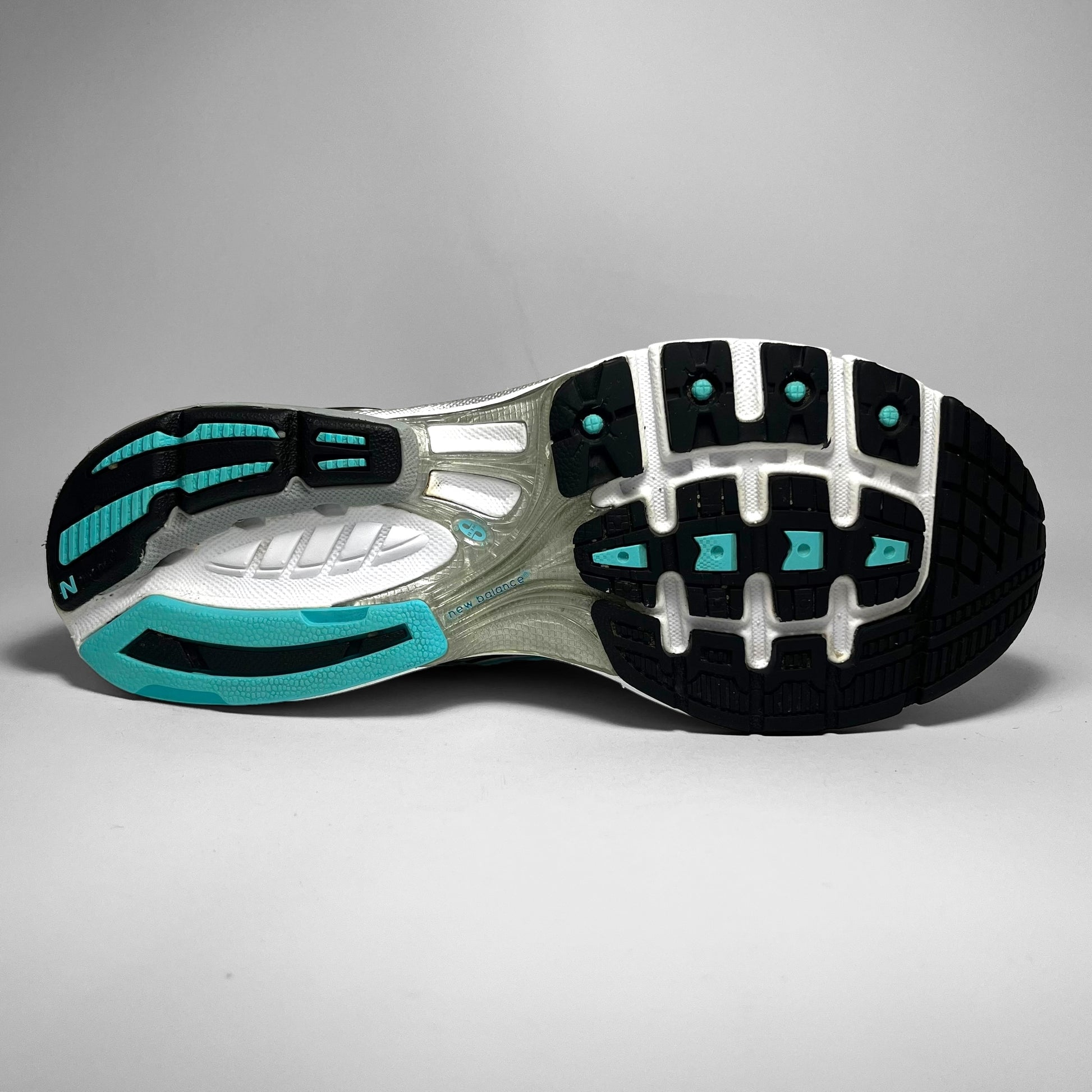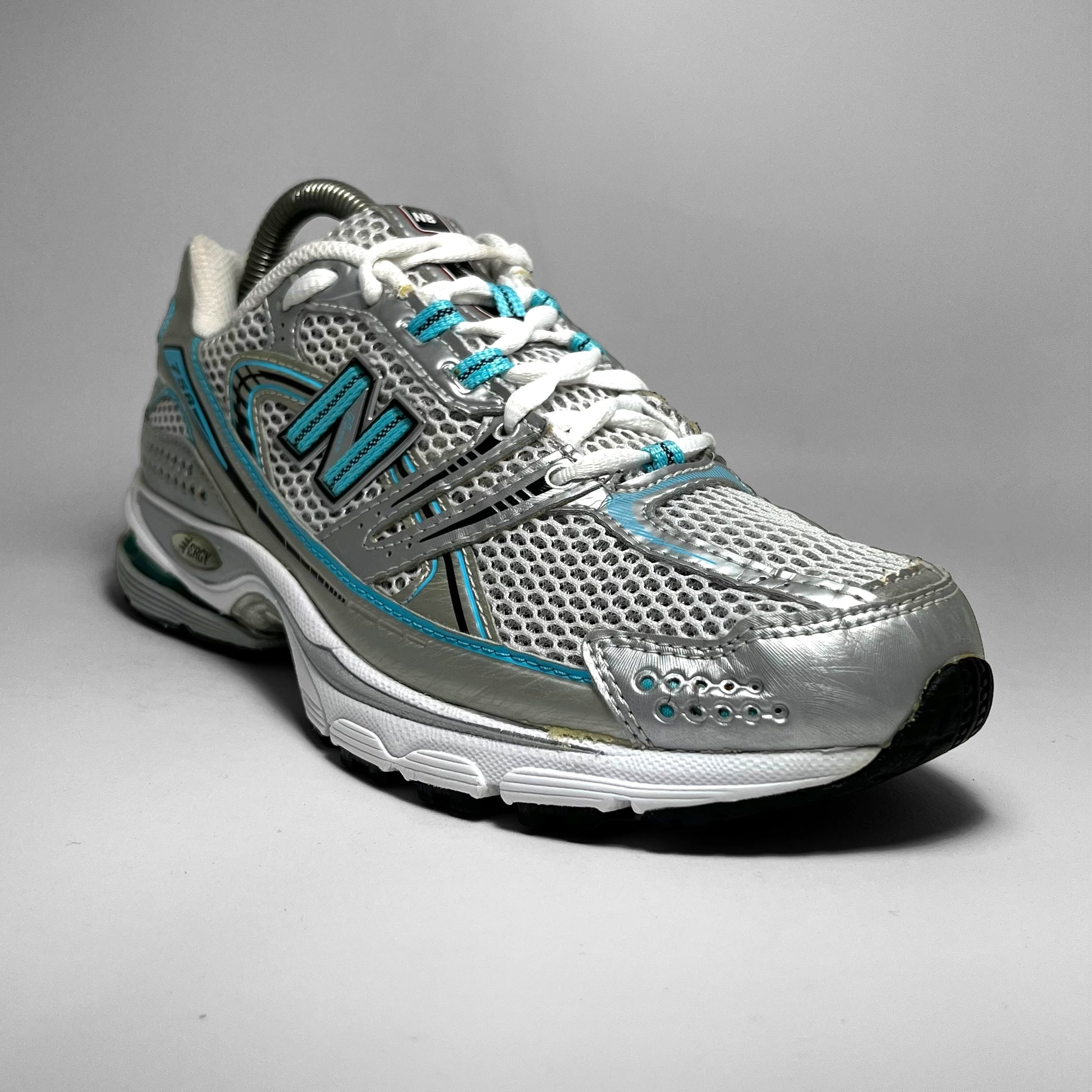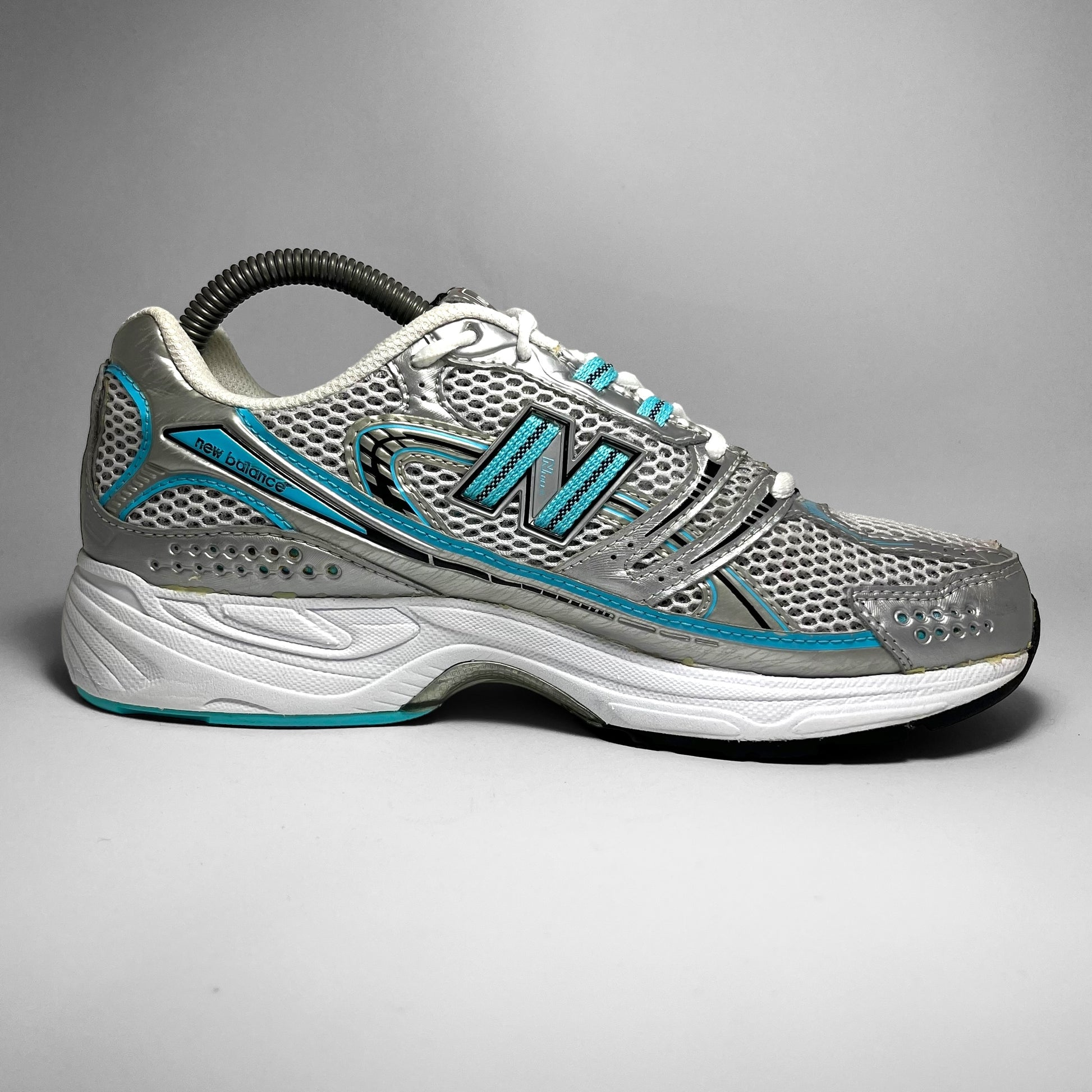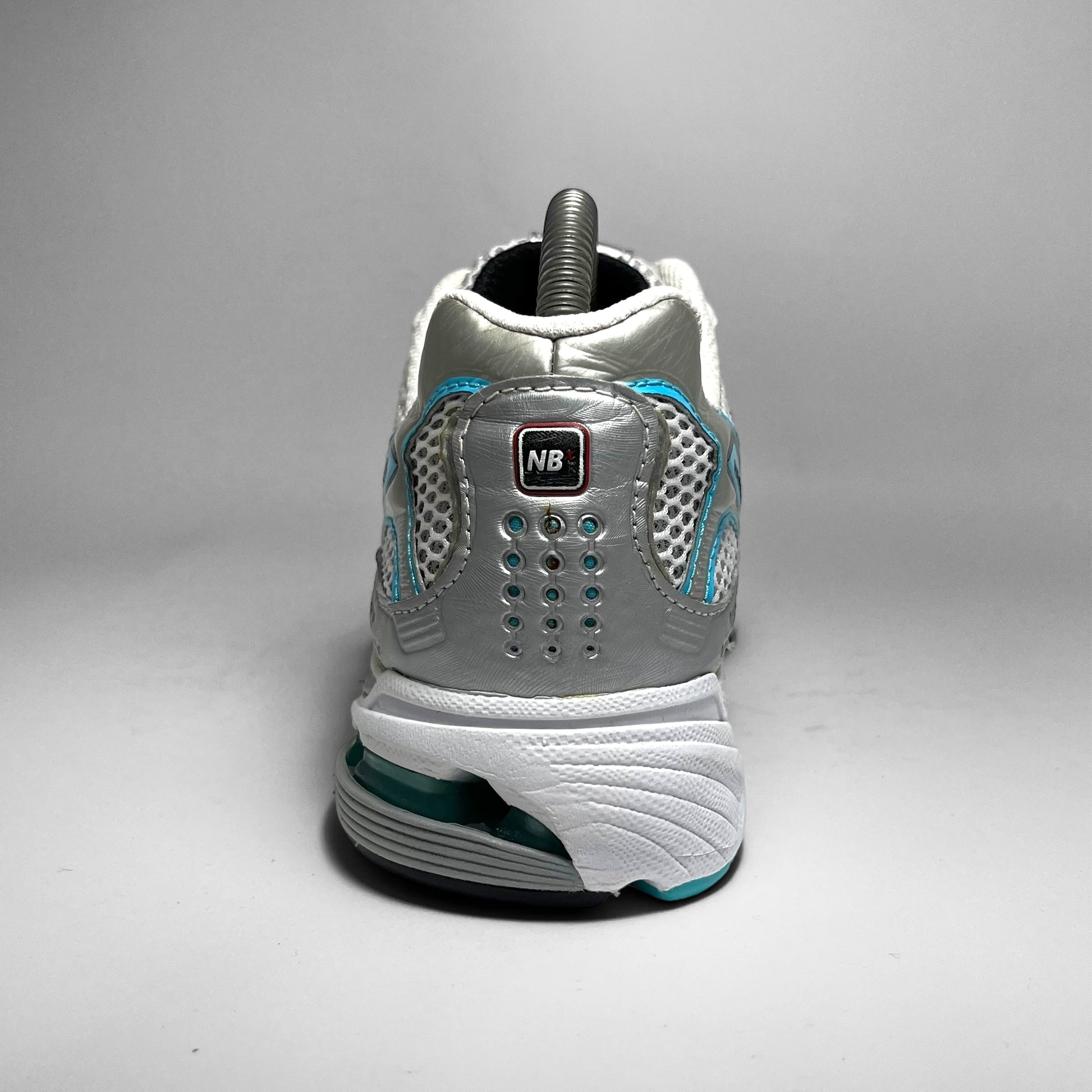 Double layered white mesh base with silver leather perforated panels, hints of aqua blue print details, woven cotton New Balance logo, eyelets and stitching throughout in combination with black details on the upper.