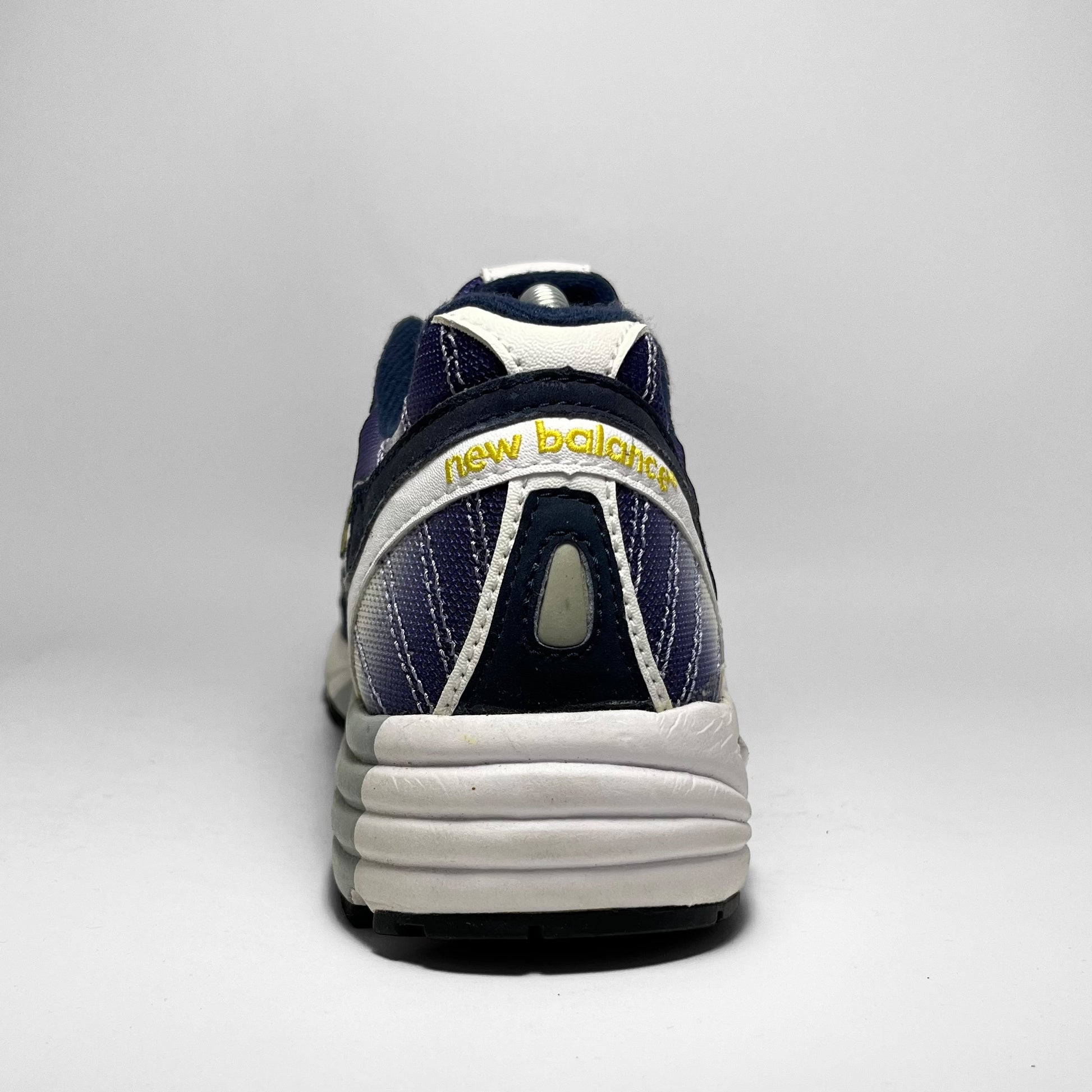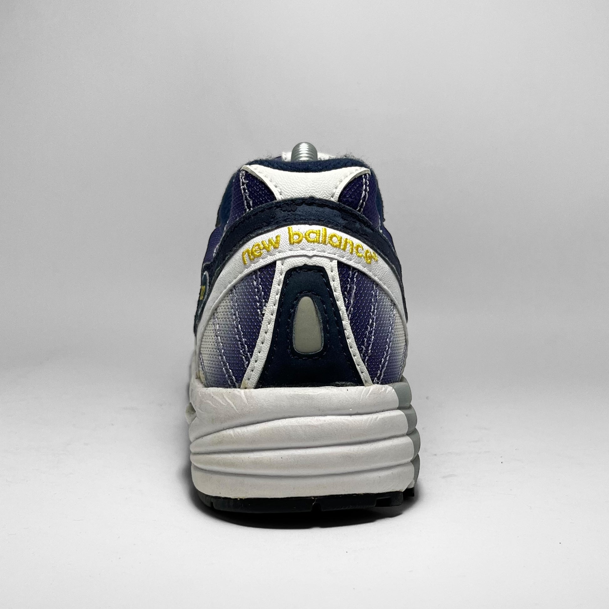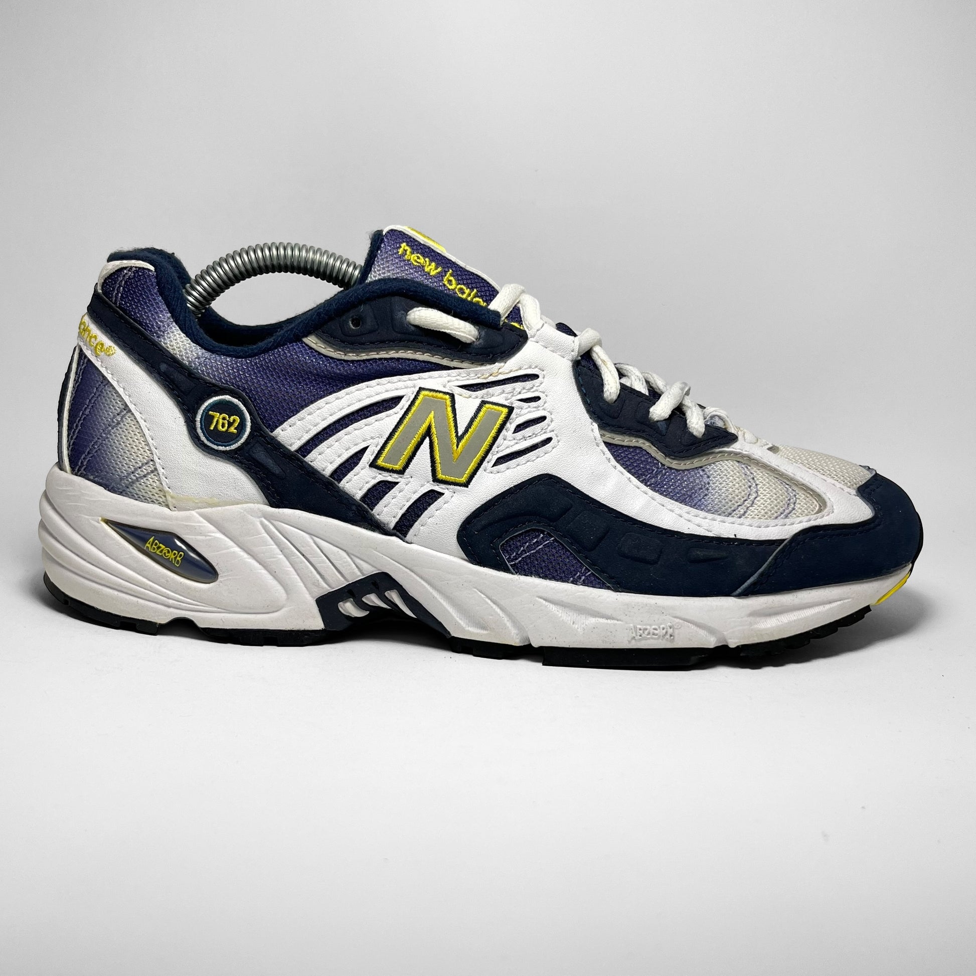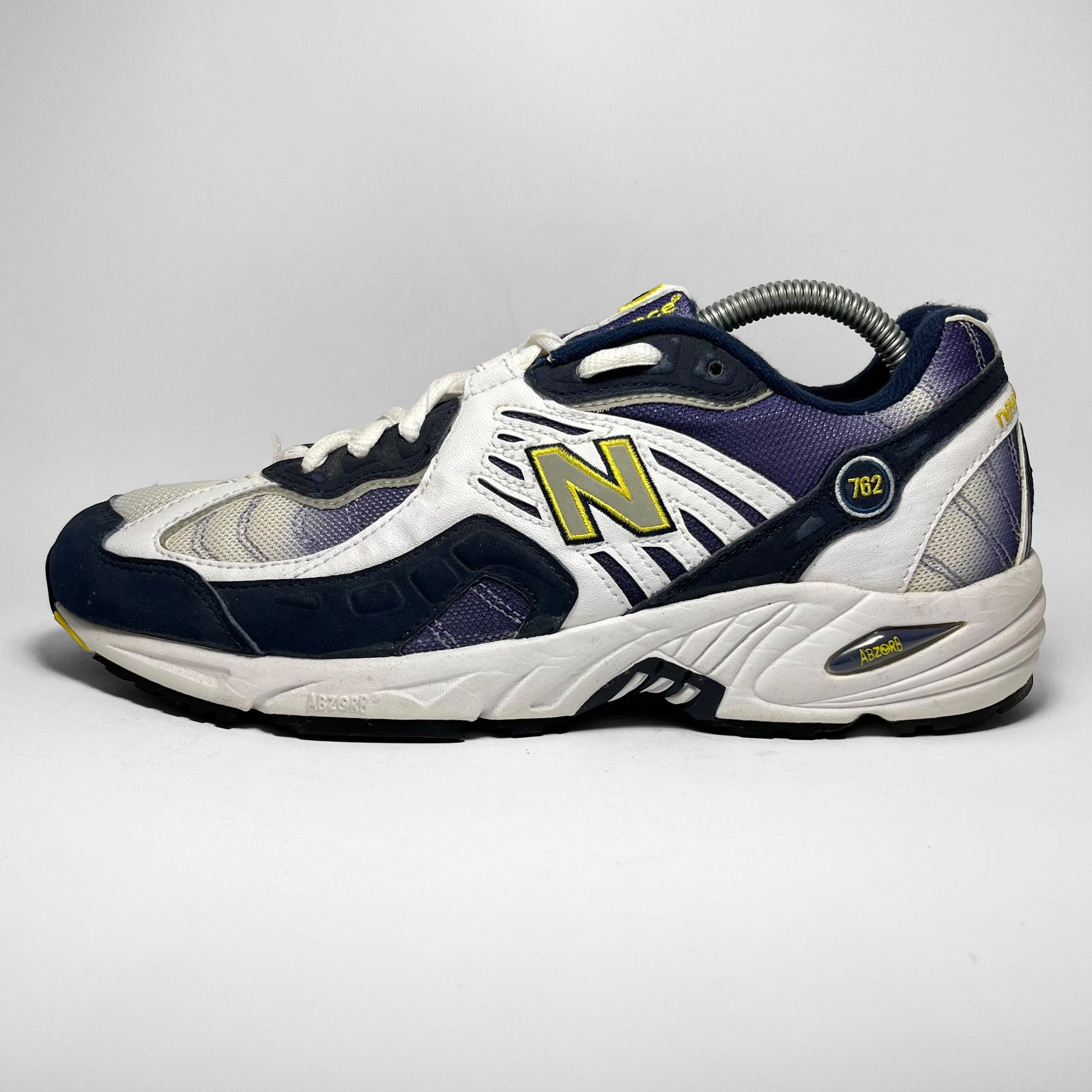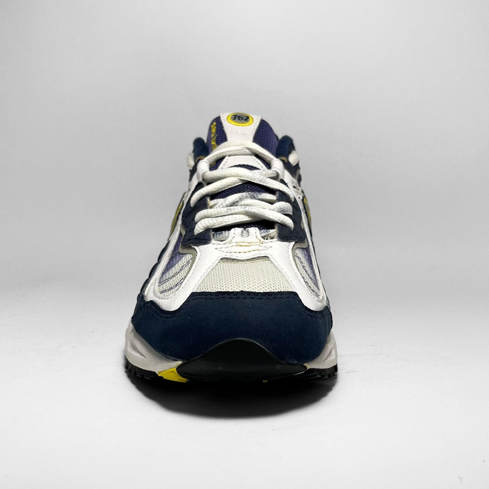 Amazing fade on the mesh upper ranging from front to back flowing from navy to white, overlay white leather panels throughout with details, navy nubuck panels with embossed detailing, yellow outlined New Balance logo and circled 762 branding, yellow embroidered script branding on tongue and heel.