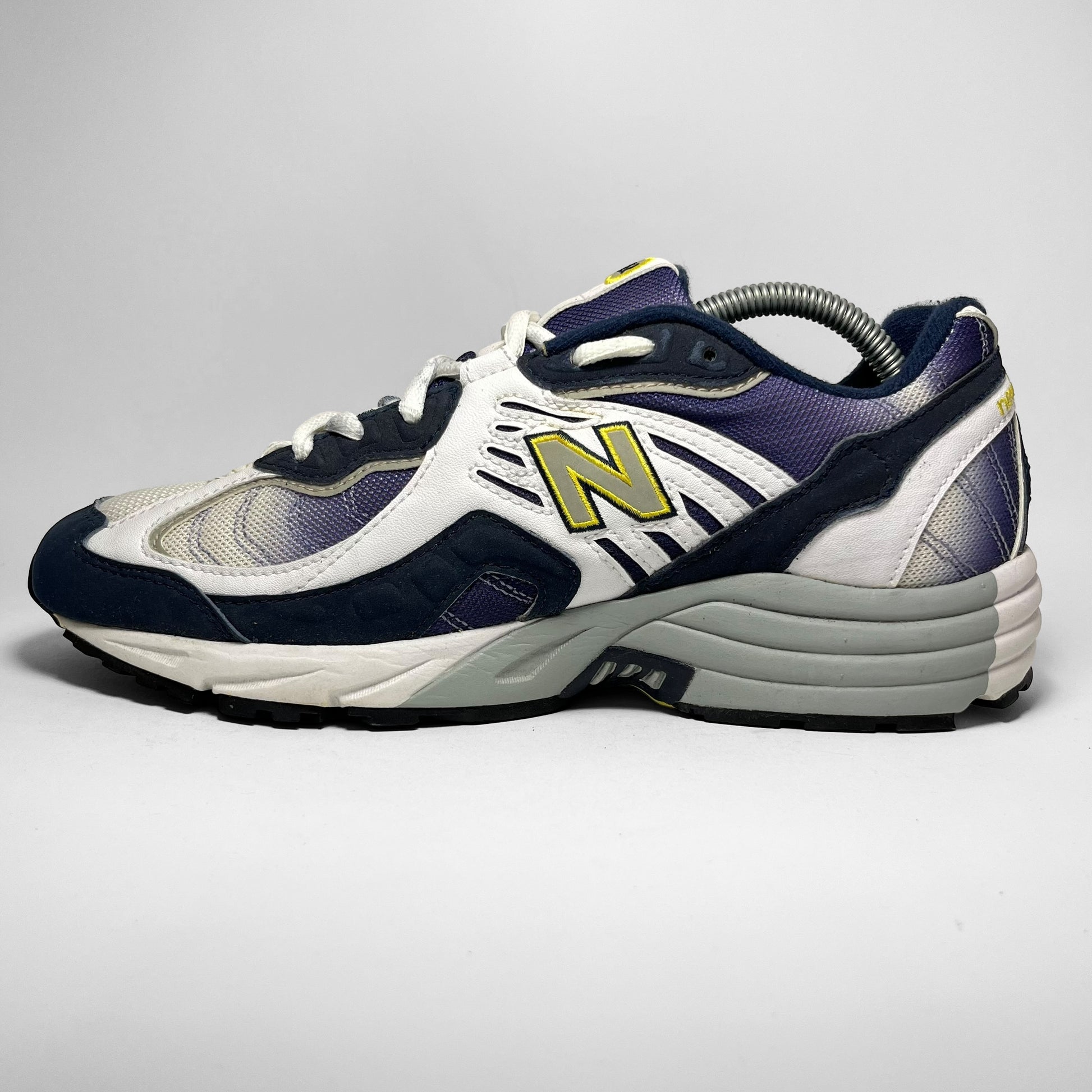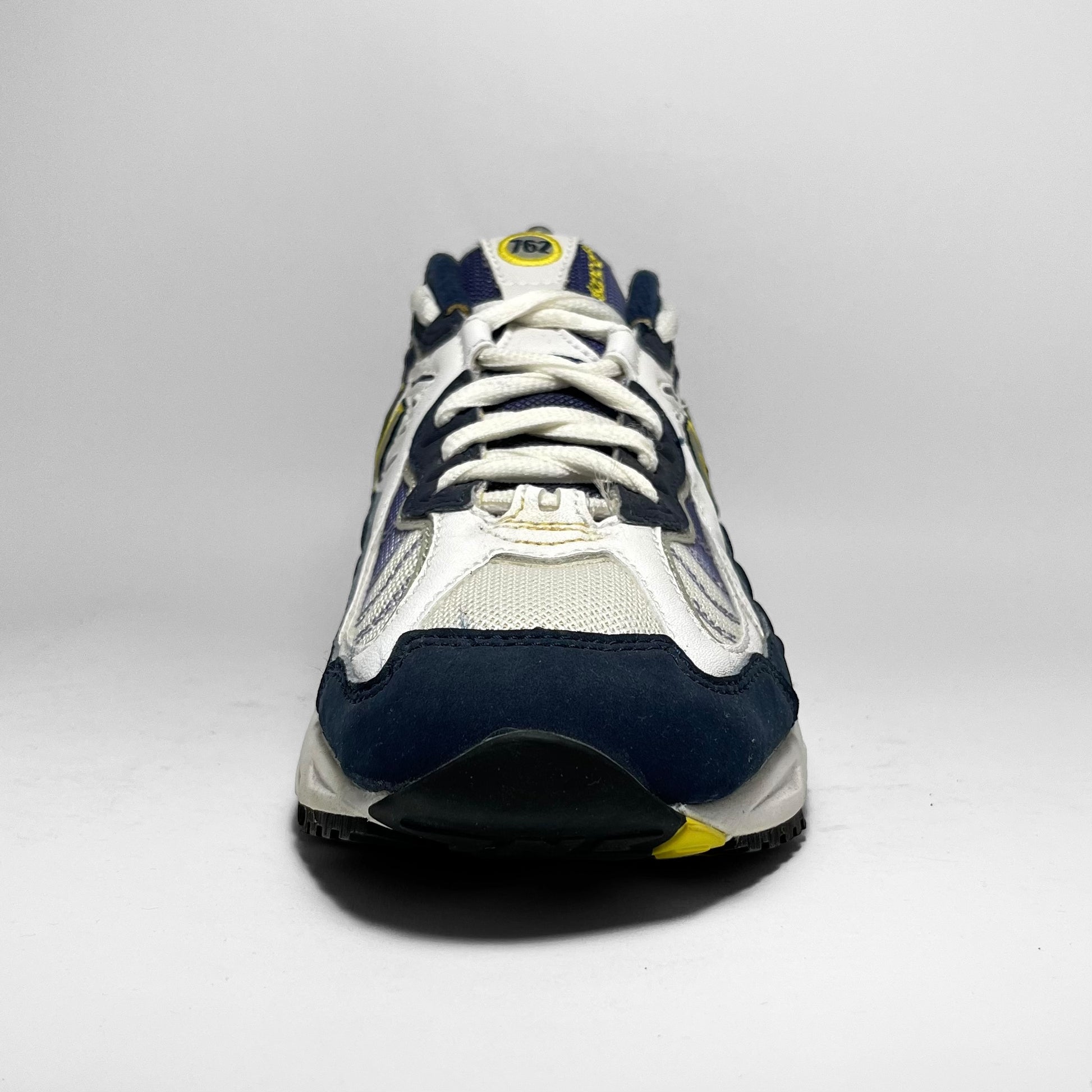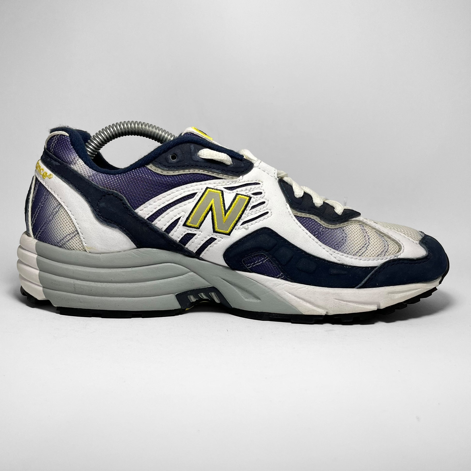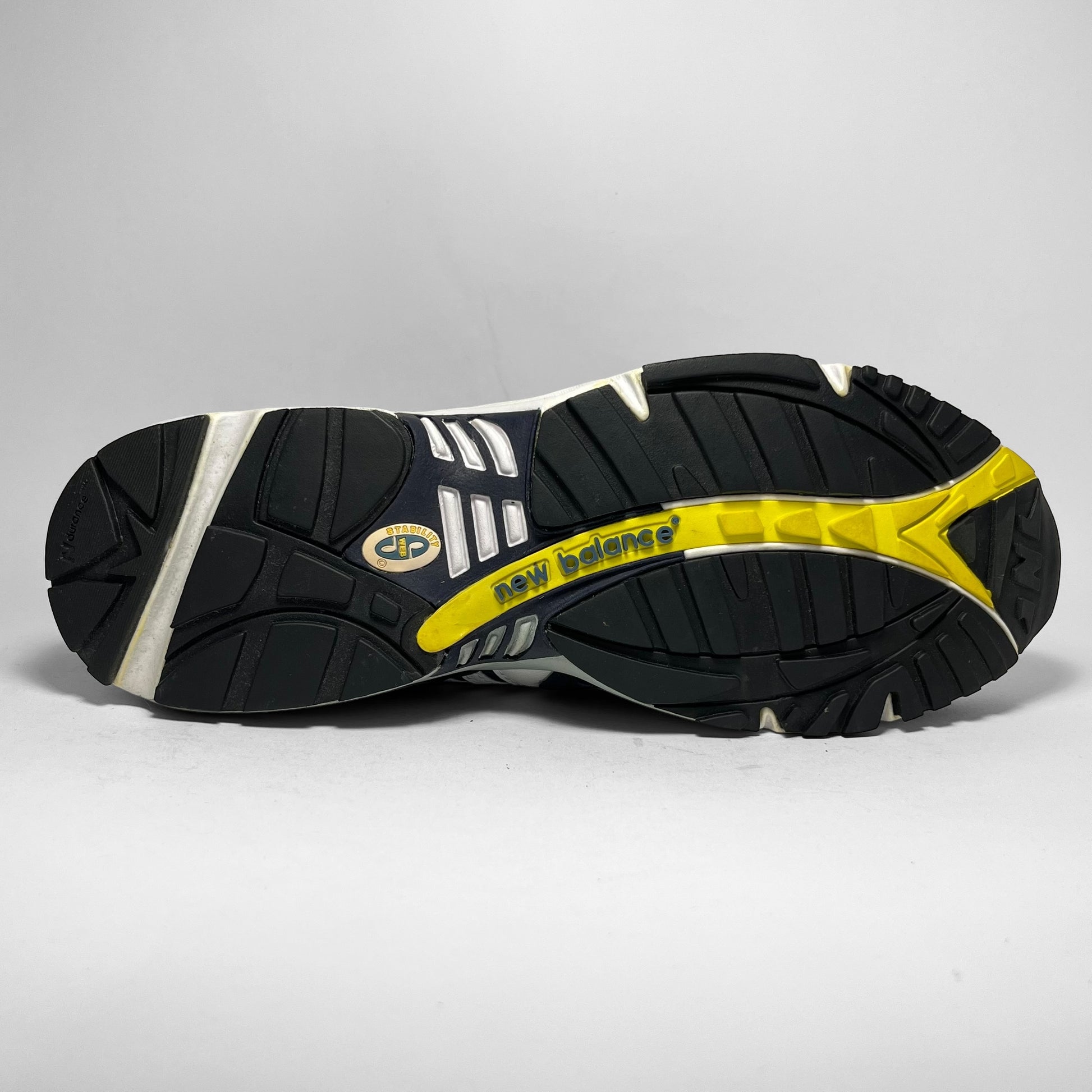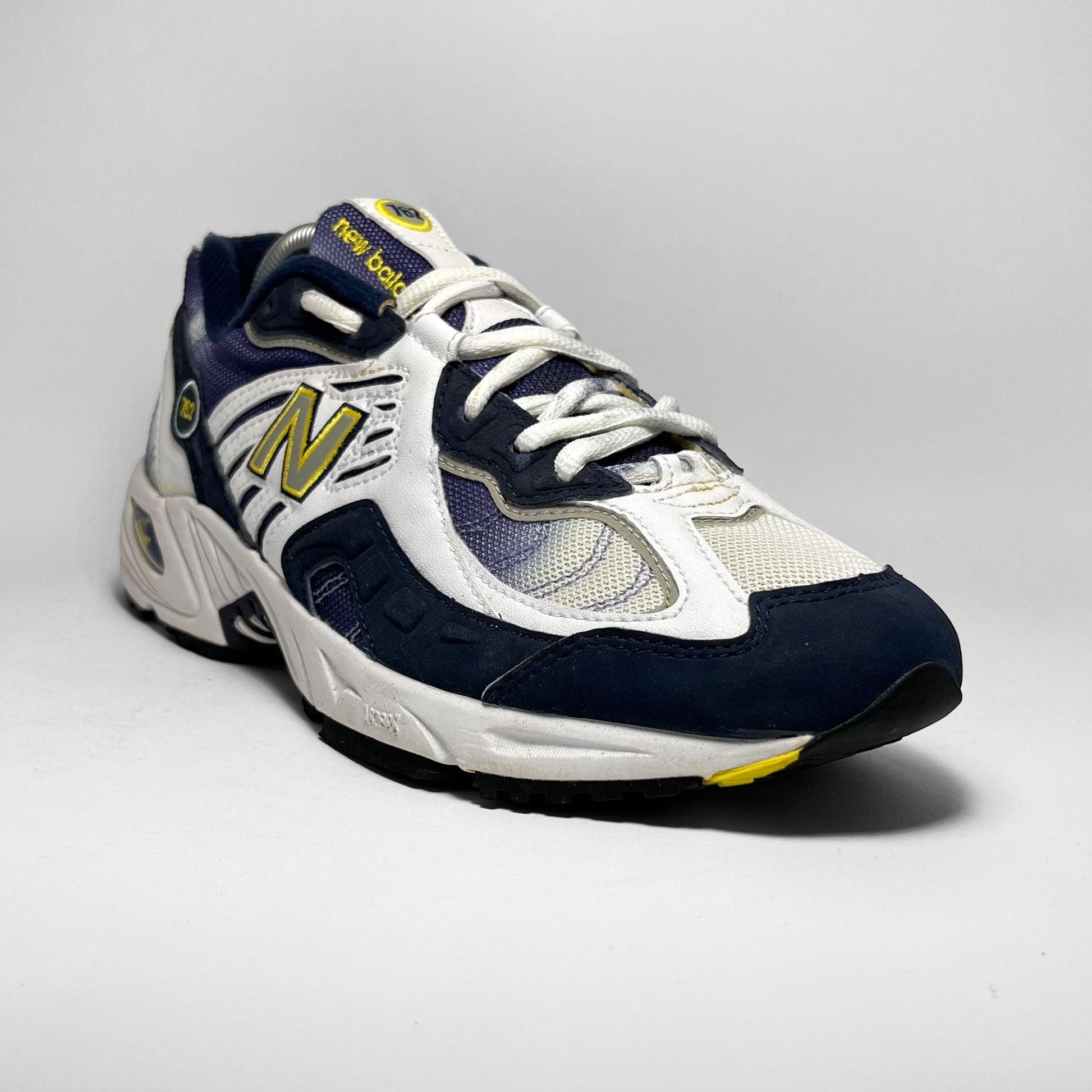 Amazing fade on the mesh upper ranging from front to back flowing from navy to white, overlay white leather panels throughout with details, navy nubuck panels with embossed detailing, yellow outlined New Balance logo and circled 762 branding, yellow embroidered script branding on tongue and heel.