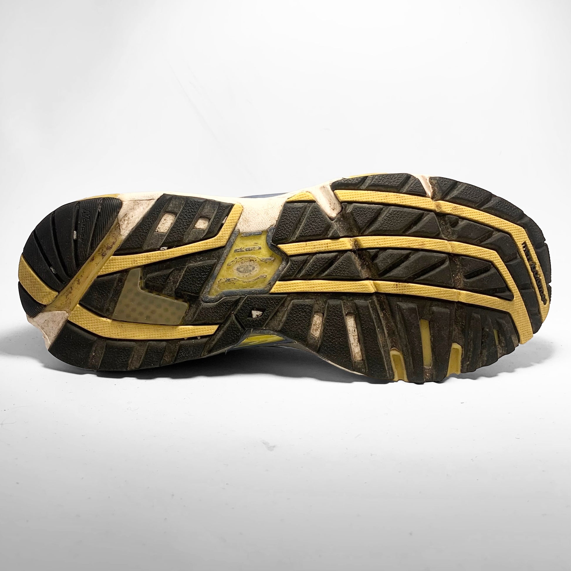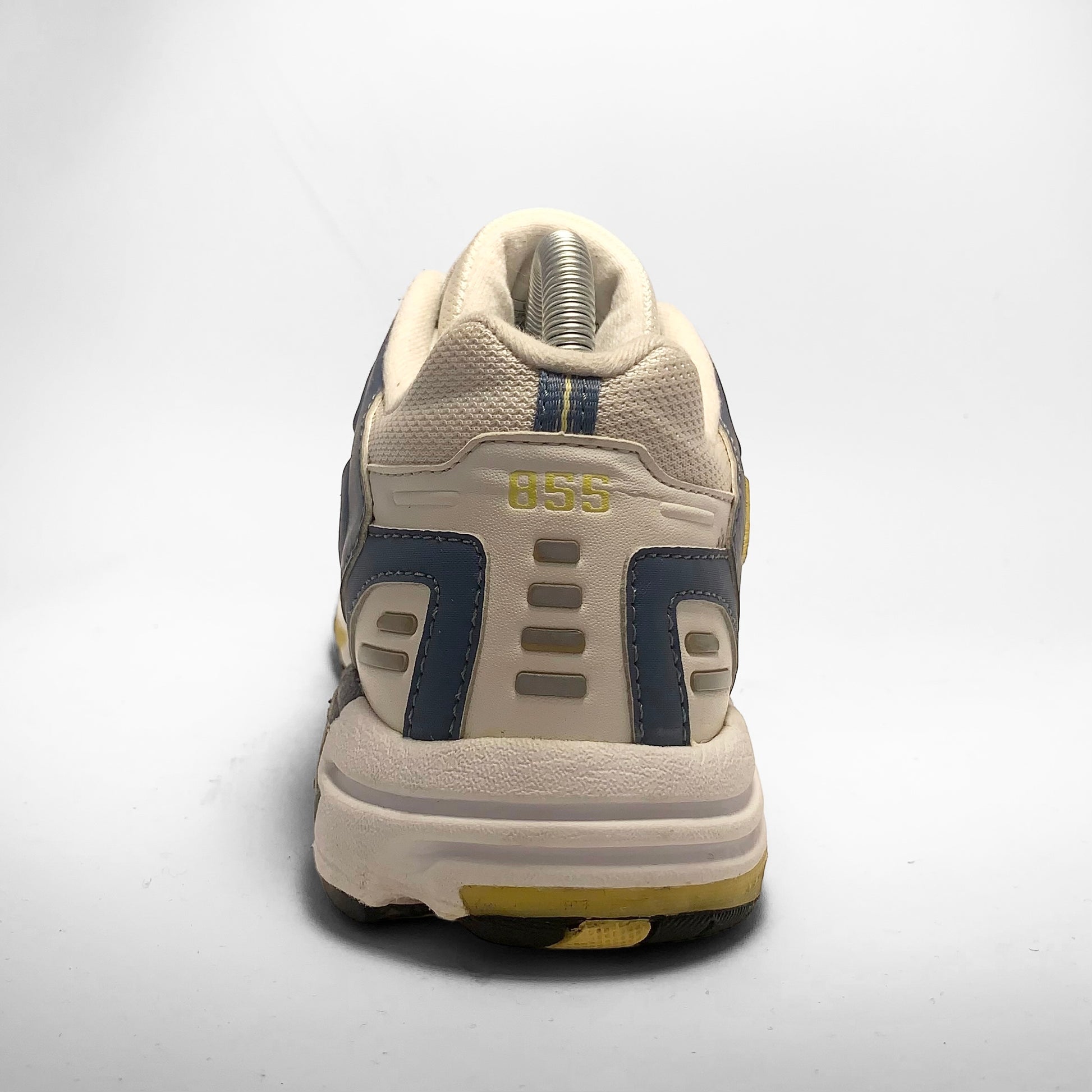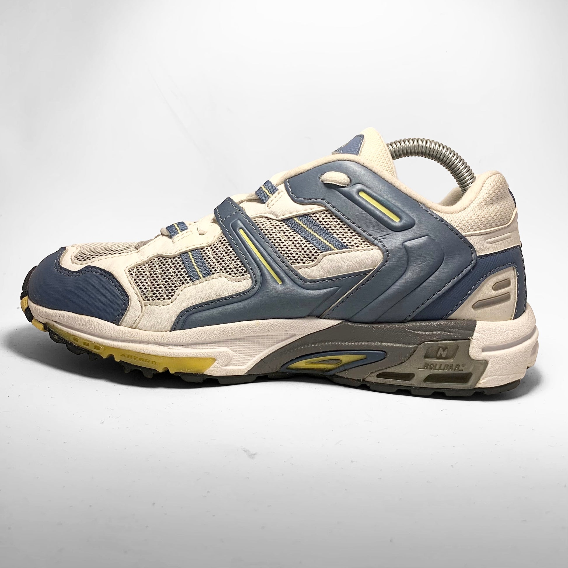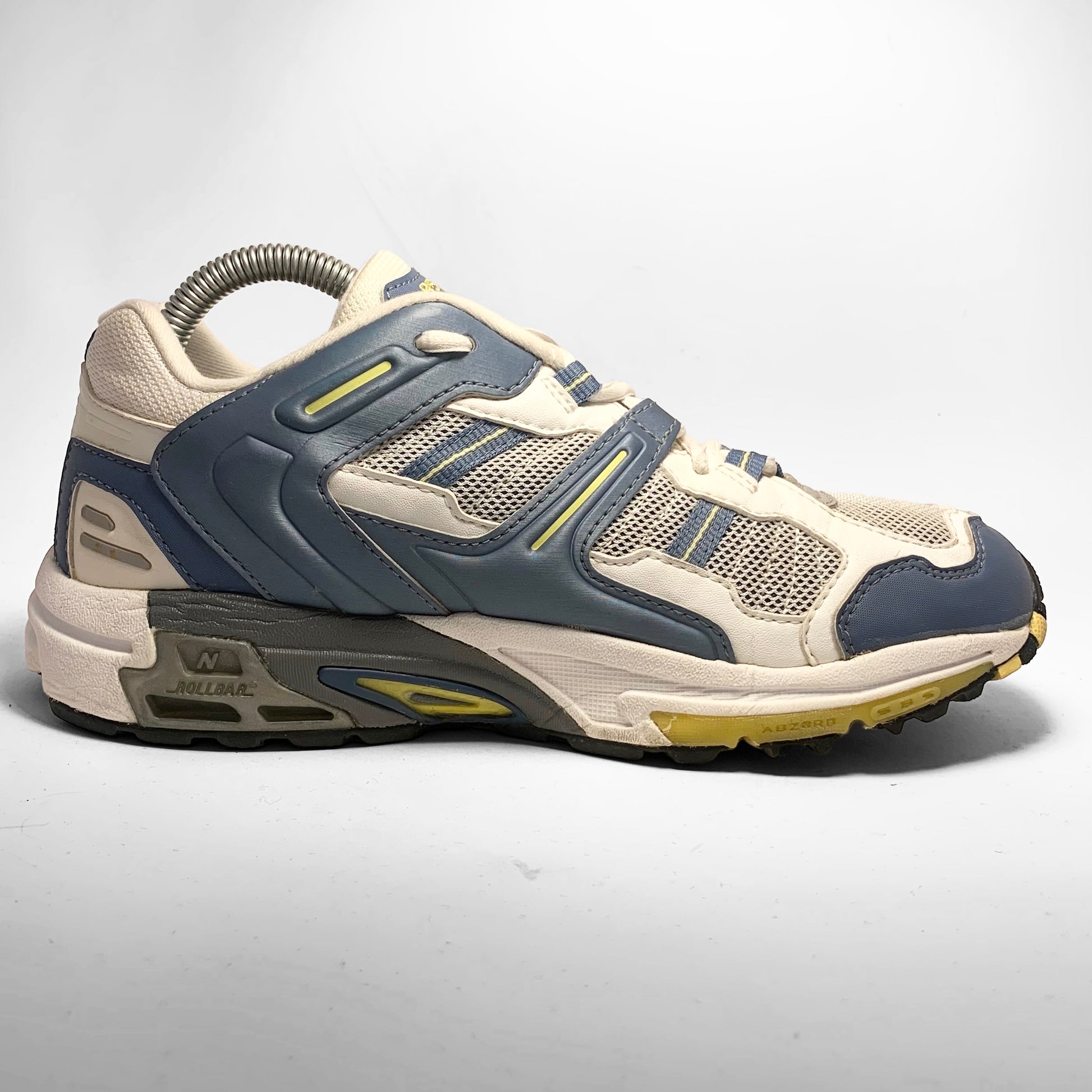 White mesh layered with white and arctic blue leather panels, yellow stripe and branding details, and Rollbar system for stability and comfort.